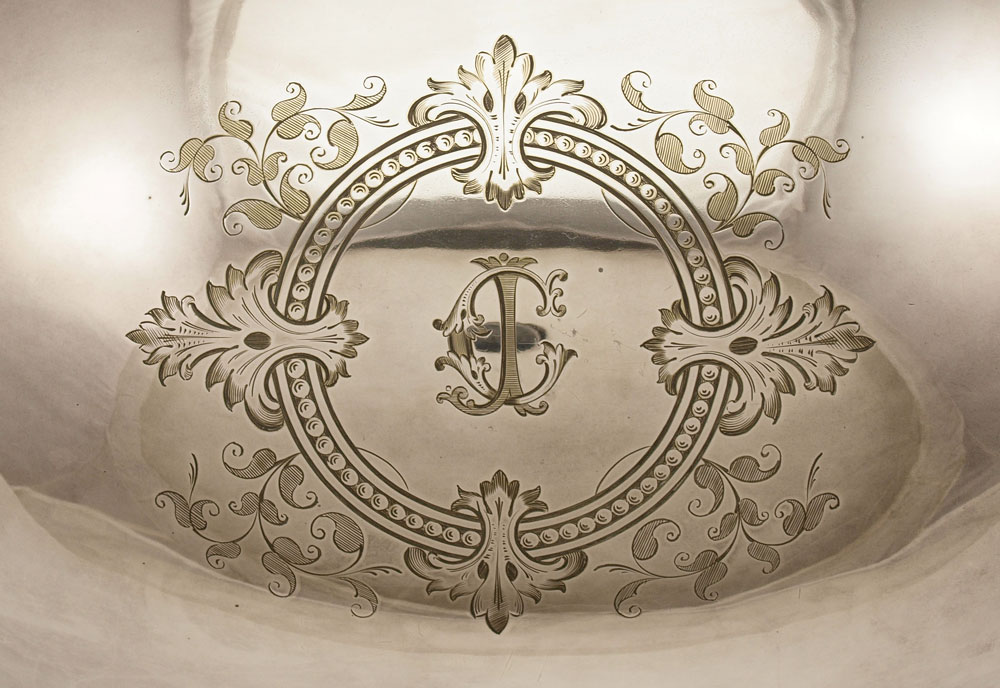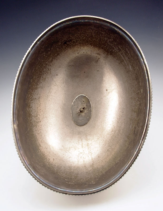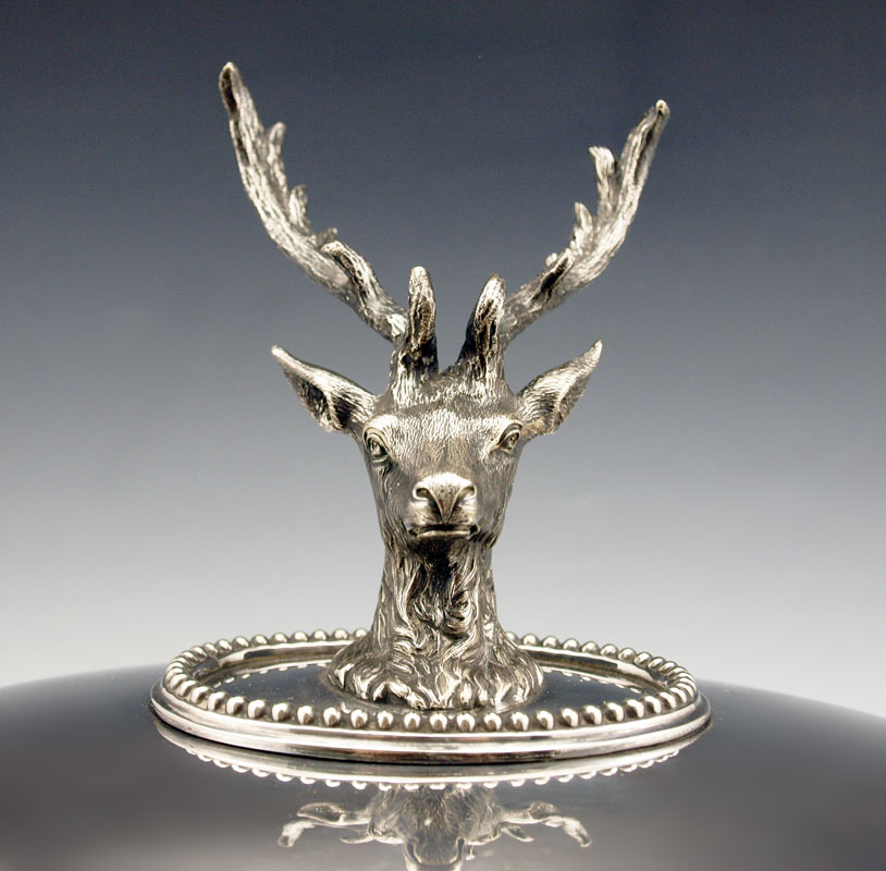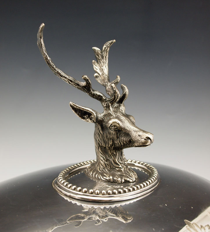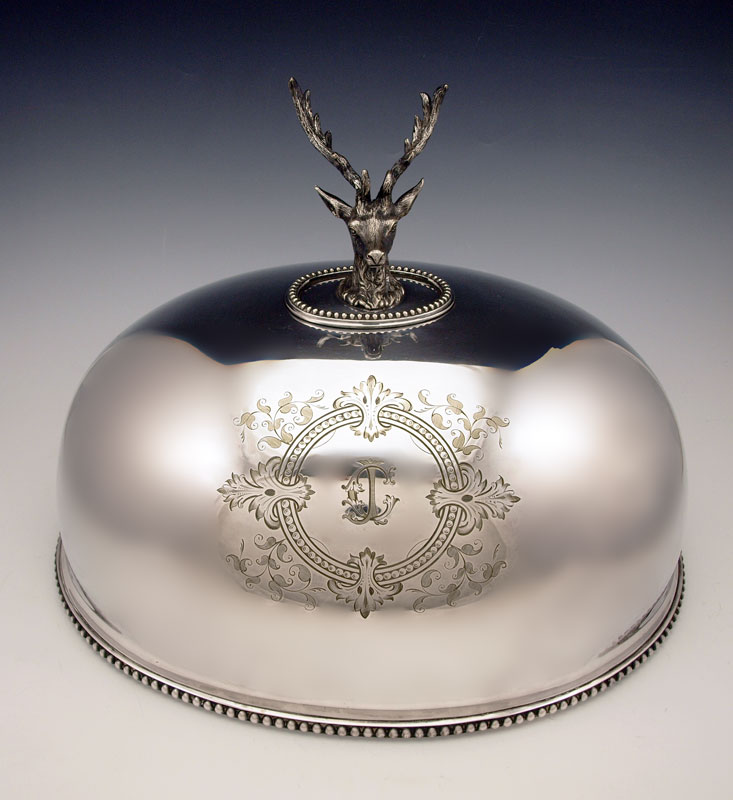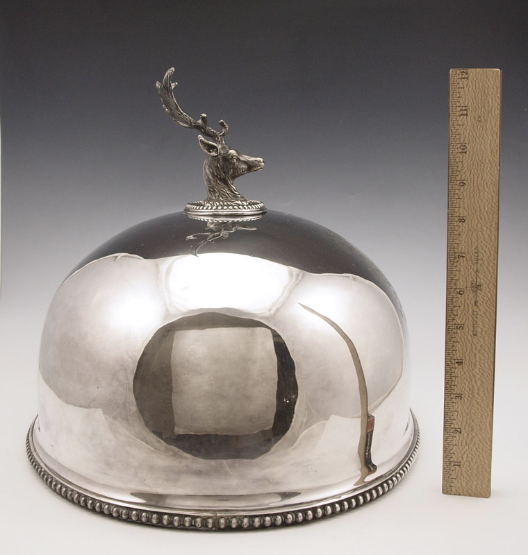 WILKINSON SILVERPLATE DOME WITH DEER HEAD FIGURAL FINIAL: Thomas Wilkinson English silverplate turkey dome with cast stag head finial. Monogrammed CI in engraved floral circle. Measures 12 1/2'' x 17 3/4'' x 13 1/2''.