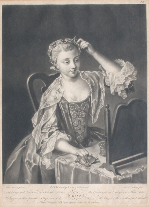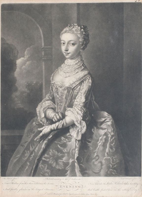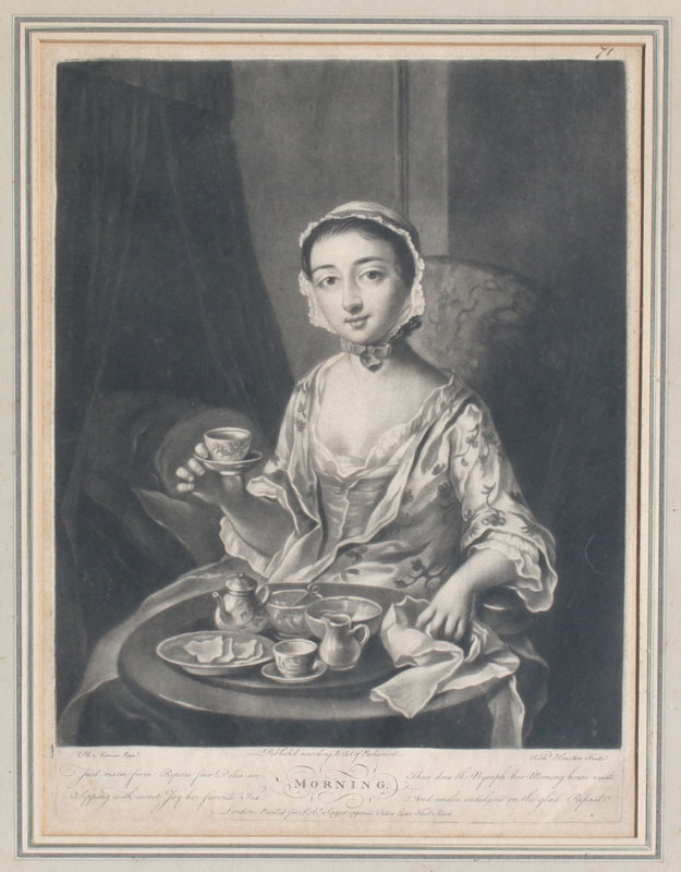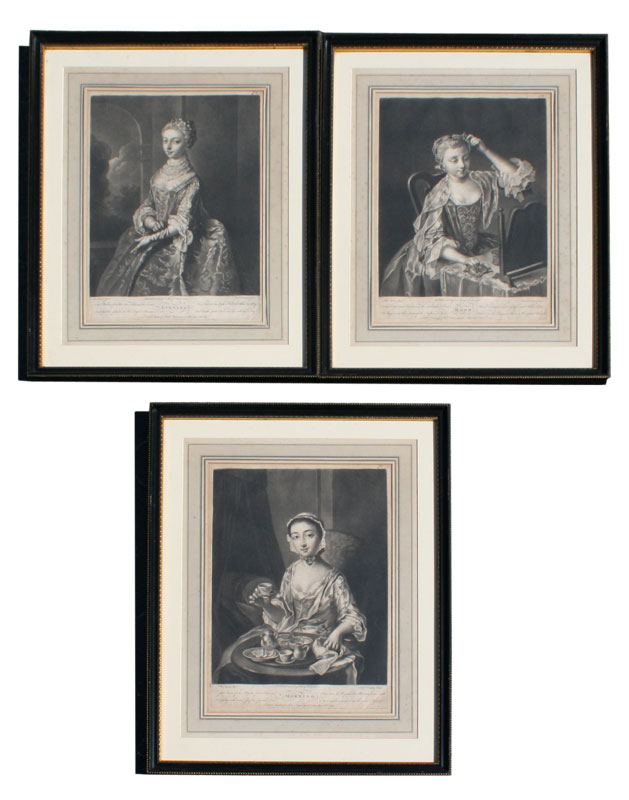 3 MEZZOTINTS BY RICHARD HOUSTON (ENGLISH, 1721-1775) AFTER MERCIER: ''Morning'', ''Noon'', ''Evening'', sight size 14 1/4'' x 10 1/4'', matching frames, 22'' x 17''.