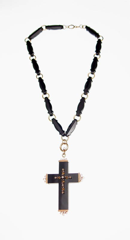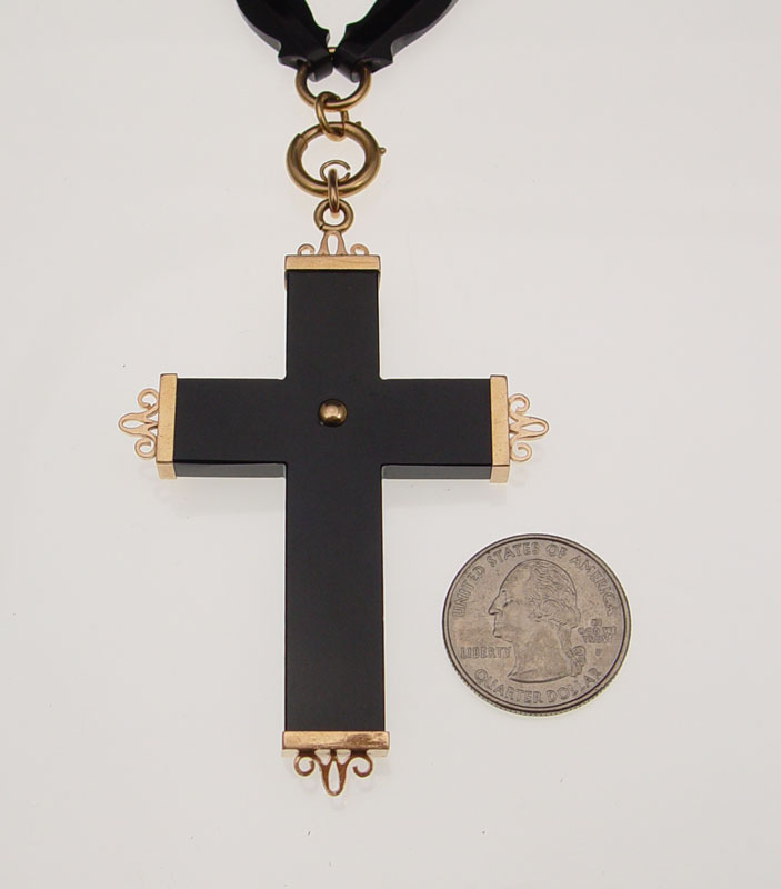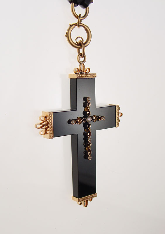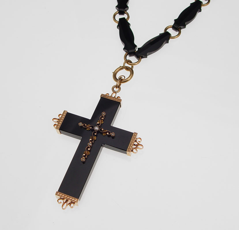 OUTSTANDING VICTORIAN MOURNING CROSS NECKLACE: 14K Gold and seed pearl cross hangs from an equally impressive chain. The cross measures 2 1/2''l., the chain 18.5''l.