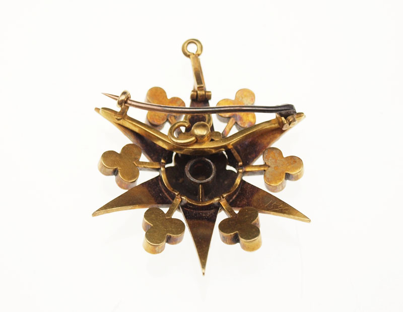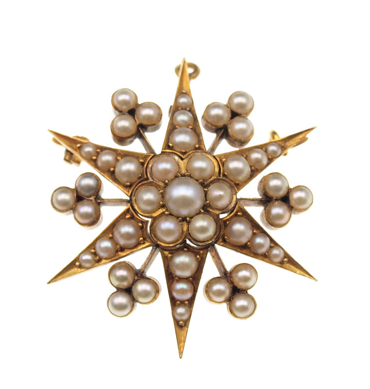 VICTORIAN 18K SEED PEARL STARBURST BROOCH / PENDANT: 18K yellow gold seed pearl starburst pin pendant. The bar pin is removable. Pivot bail. Approx. 1 ½'' in diameter. Weight: 10.2 grams