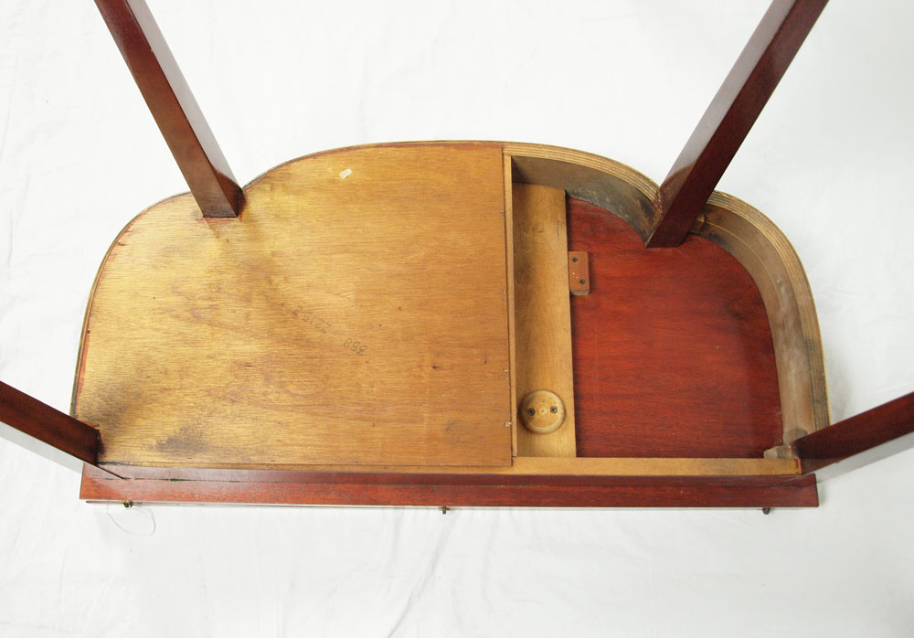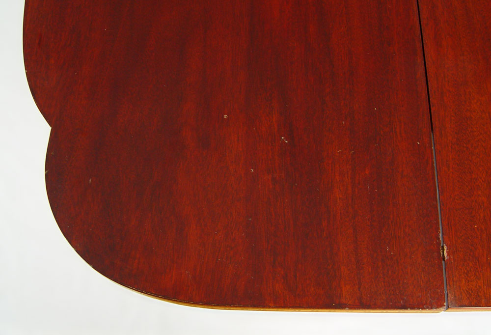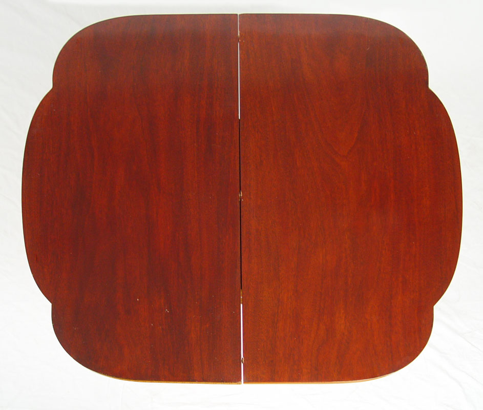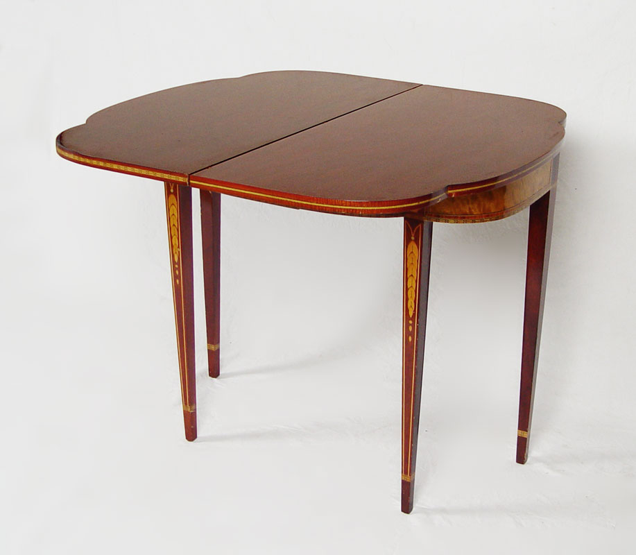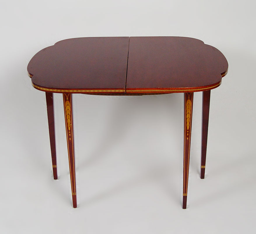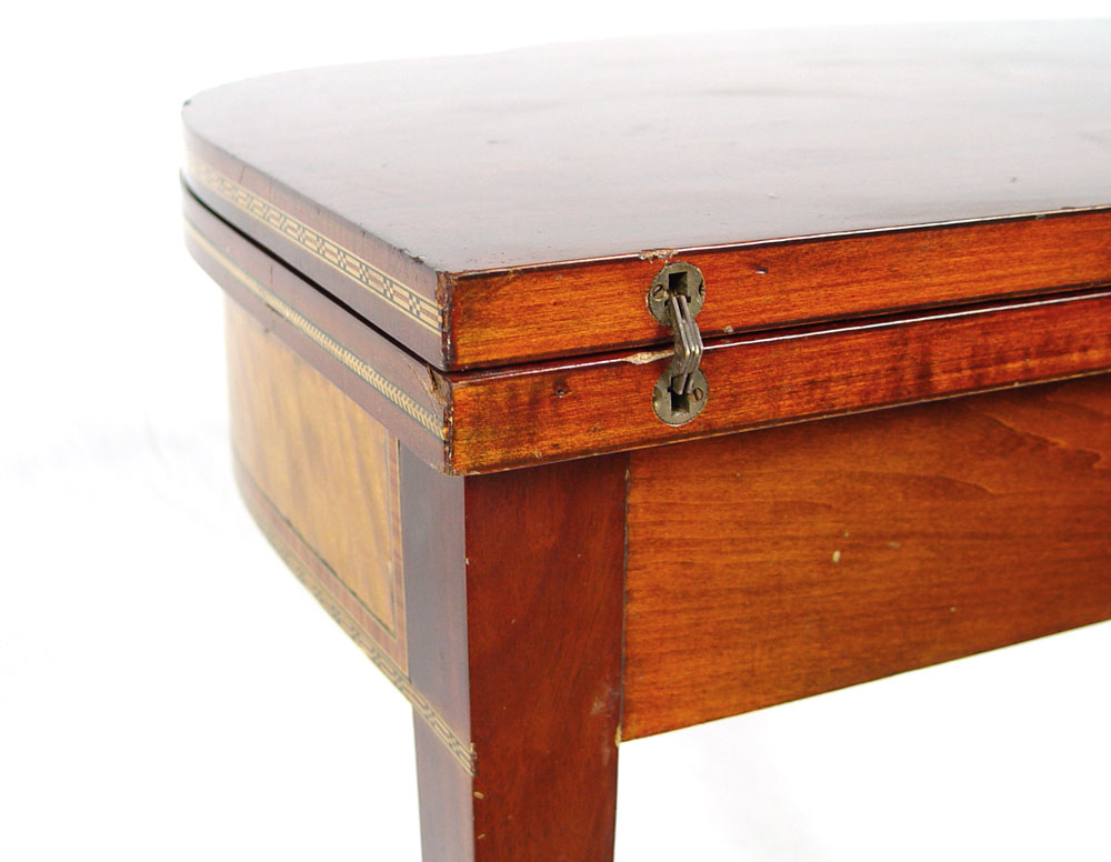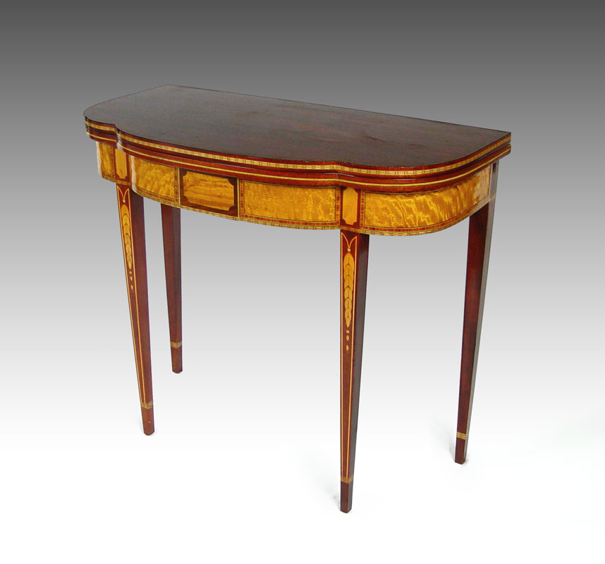 FINE QUALITY FEDERAL STYLE LIFT TOP CARD TABLE: Detailed string inlay with tiger maple inlaid panels, long tapered legs with string and bell flower inlay, 30''h. x 35''w. x 18''.