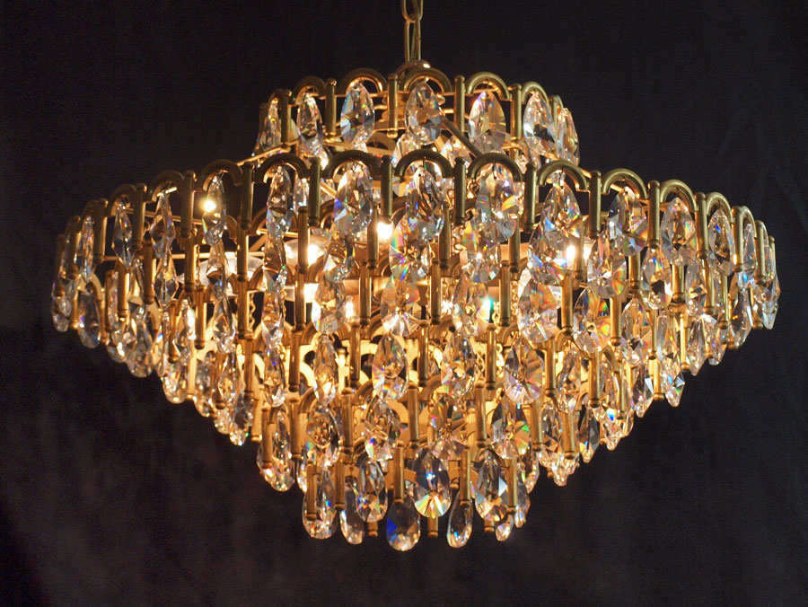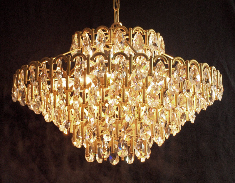 6 TIER CRYSTAL CHANDELIER: Ten light chandelier of high quality tear shaped prisms. Approx. 21'' h, excluding the chain and 14'' dia.