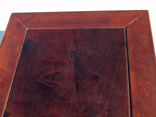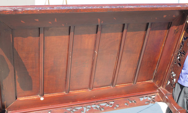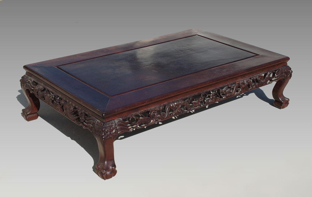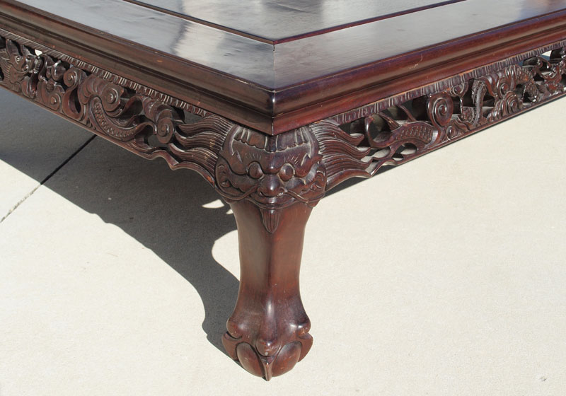 A LOW INDONESIAN CARVED MAHOGANY TABLE: 15'' tall x 59'' x 36''.