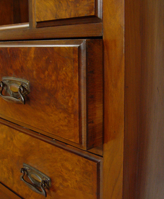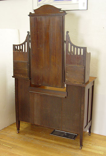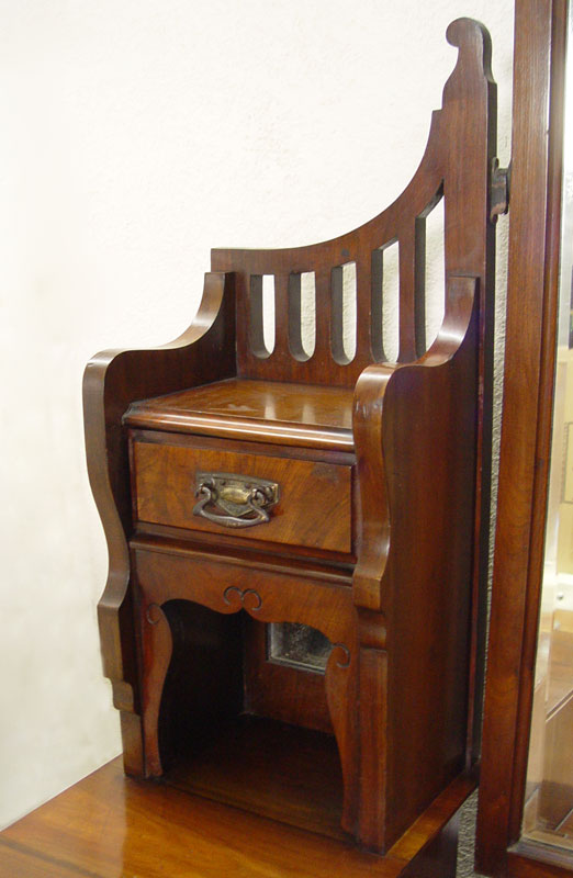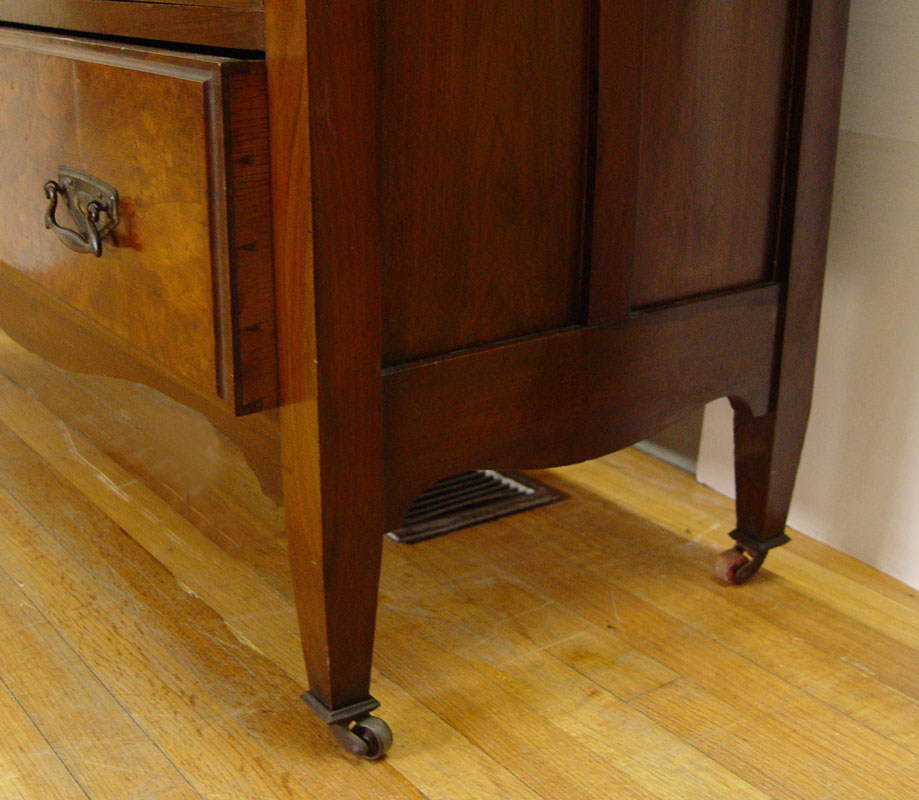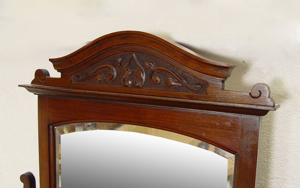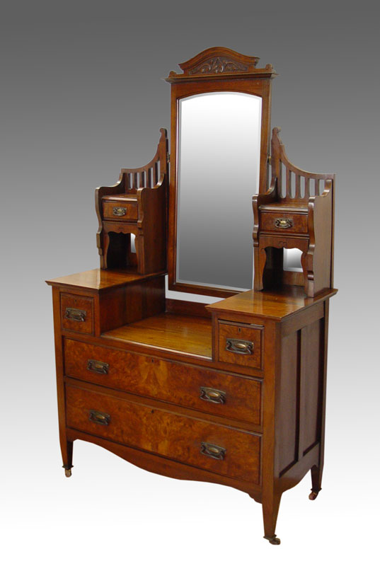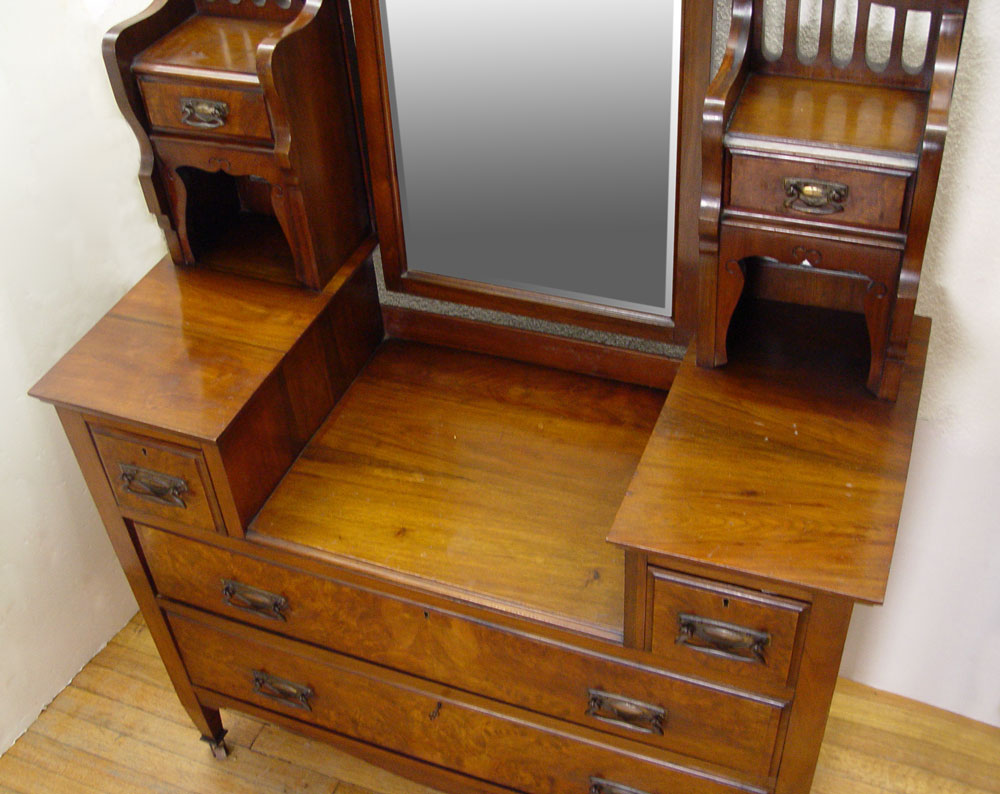 VICTORIAN DROP WELL DRESSER WITH MIRROR: Swivel beveled mirror supported by shelf, drawer and mirrored compartment flanking each side, drawer on each side of drop well over 2 drawers with straight legs ending in casters, nouveau pulls, 71''h. x 42 1/2''w x 19 1/2''d.