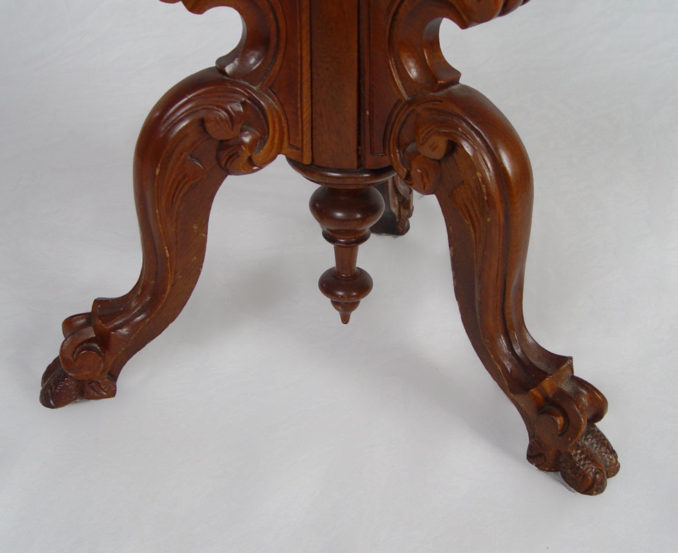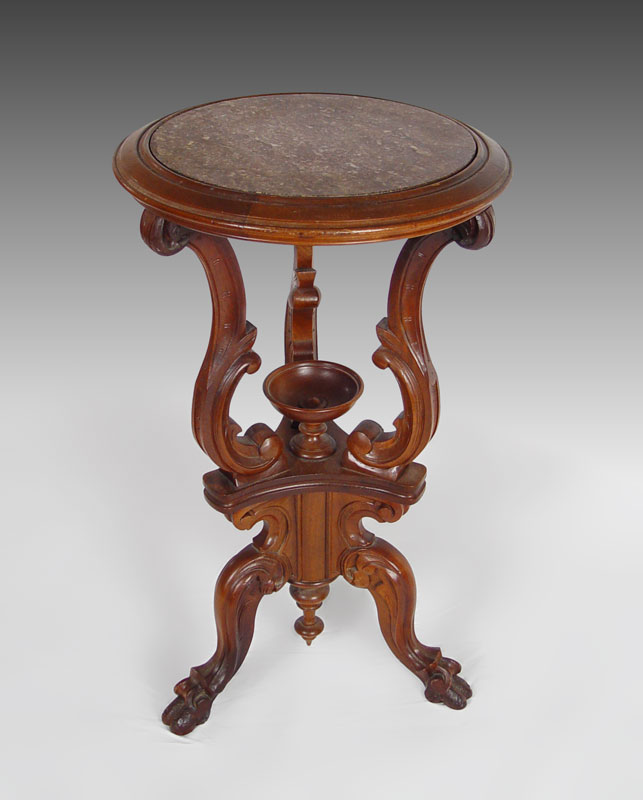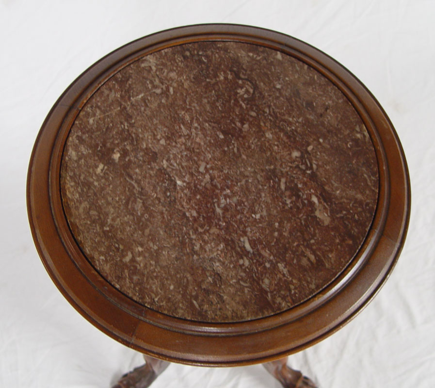 ROUND VICTORIAN WALNUT MARBLE TOP FERN STAND: Inset brown marble top, three carved legs with central urn compote, lower legs ending in cloven feet, 30 1/2''h. x 18''dia.