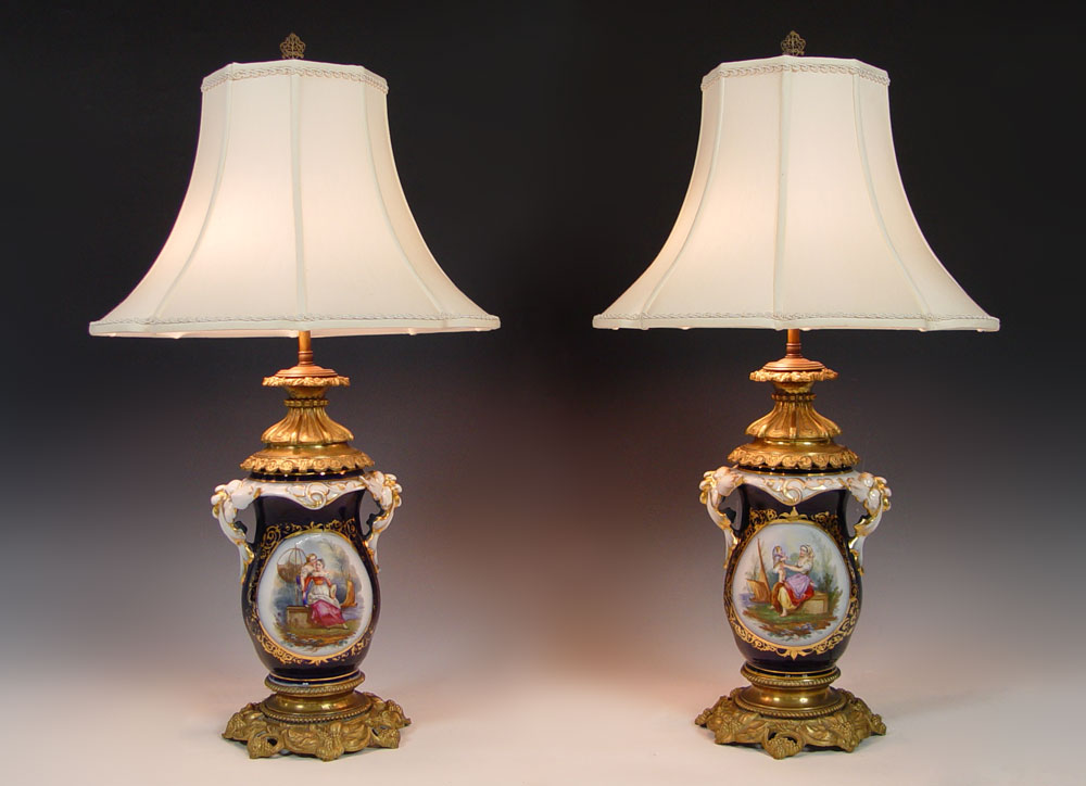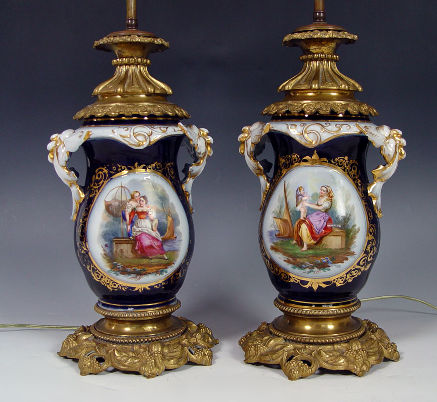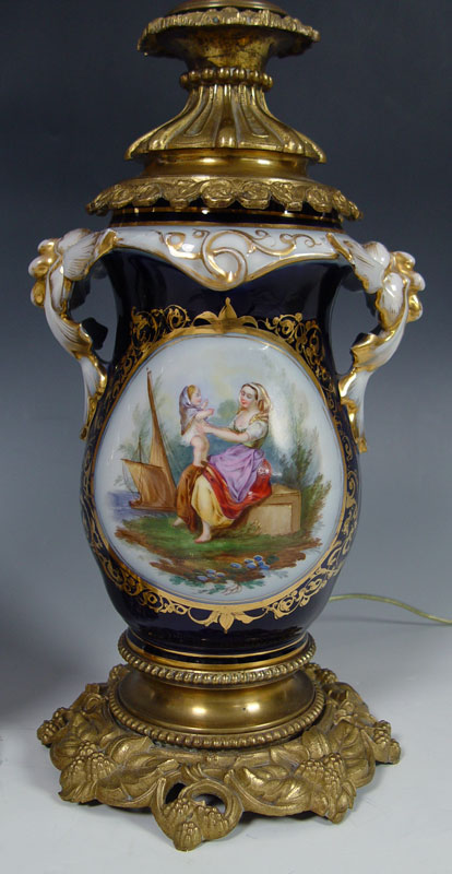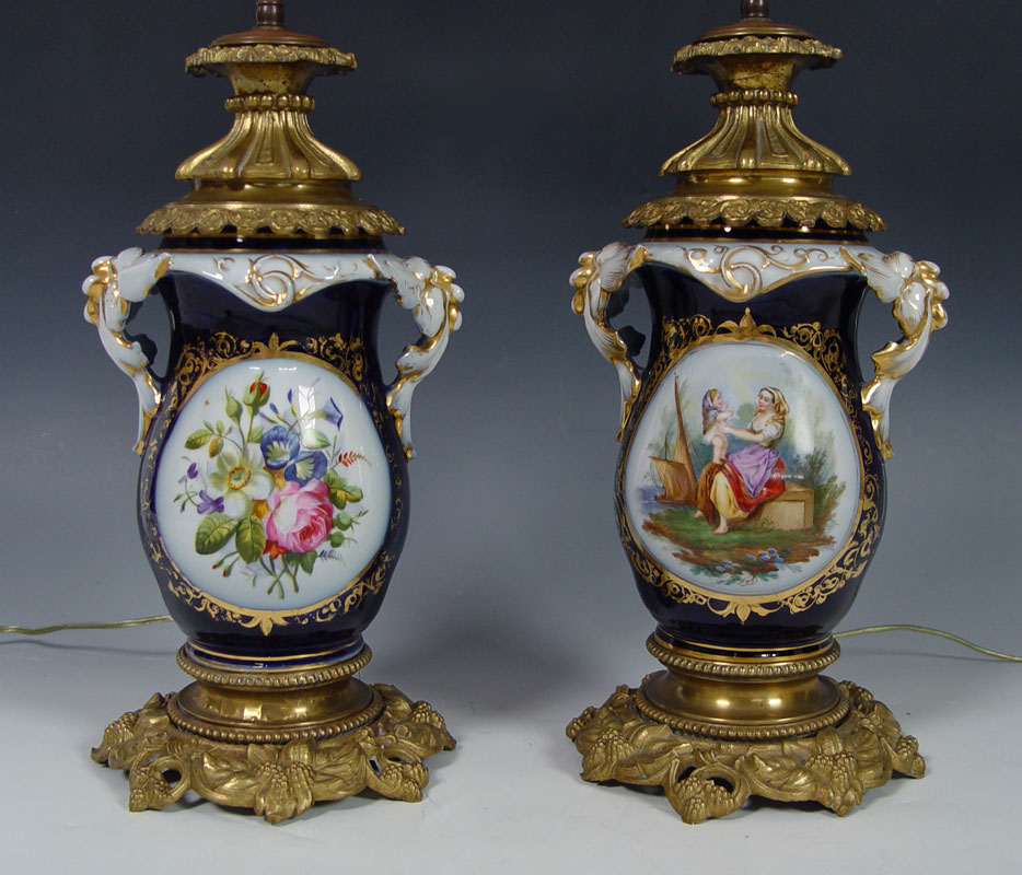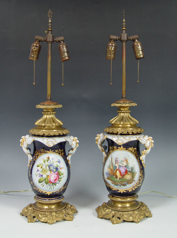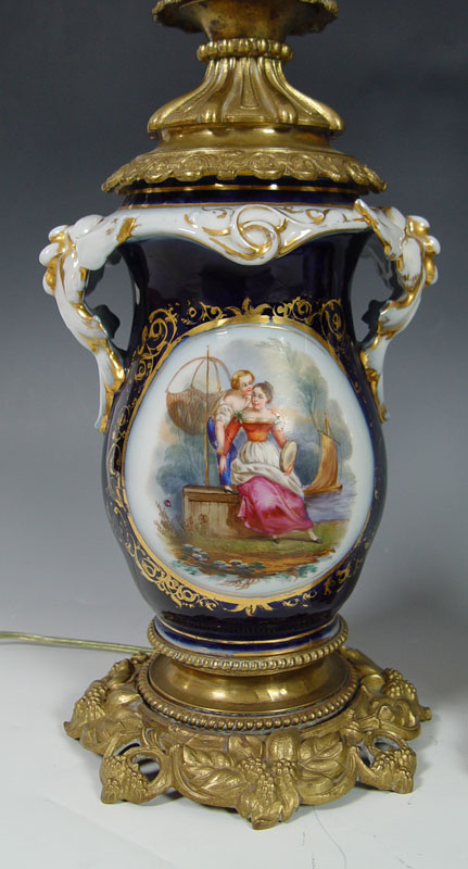 2 FINE PORCELAIN OLD PARIS LAMPS: Hand painted reserves on cobalt ground, parcel gilt. Metal mounted, Lamps are 27''h., porcelain measures 9.5''.