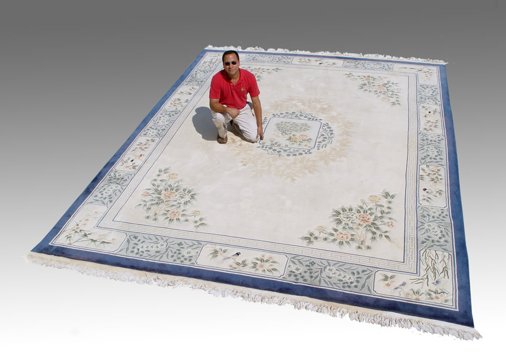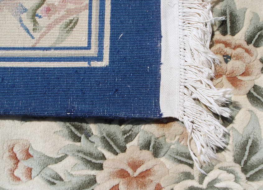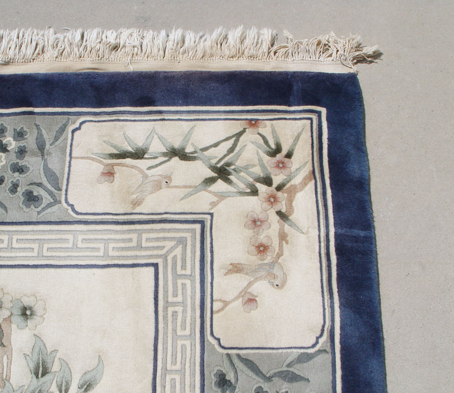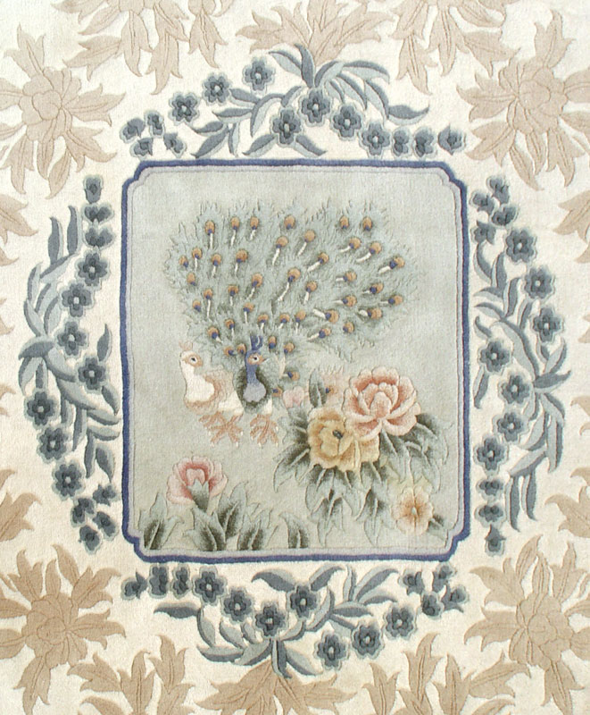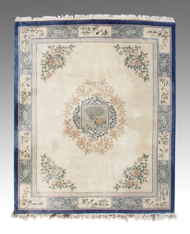 LARGE ORIENTAL AUBUSSON TYPE RUG: Approx. 12' x 15'. Center medallion of peacock and peony, bamboo and birds at the corners.