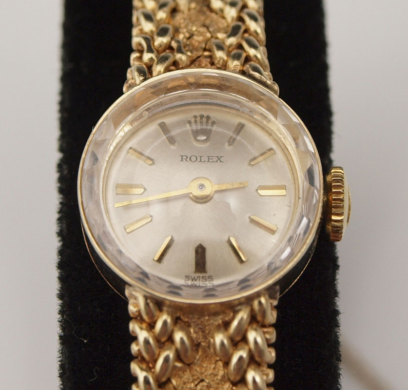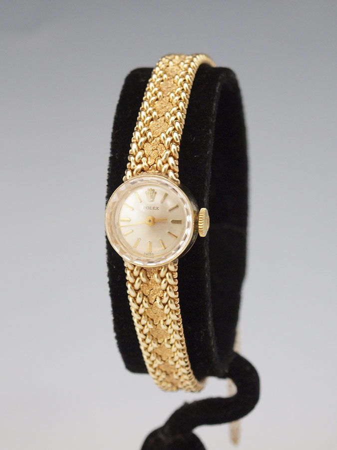 ROLEX 14K GOLD LADIES DRESS WATCH: 14K yellow gold Rolex watch, caliber 14, 17 jewel movement. Signed and hallmarked correctly on interior of case. Gold mesh style integrated band with ladder clasp and safety chain. In good running order. 23.4 grams overall.