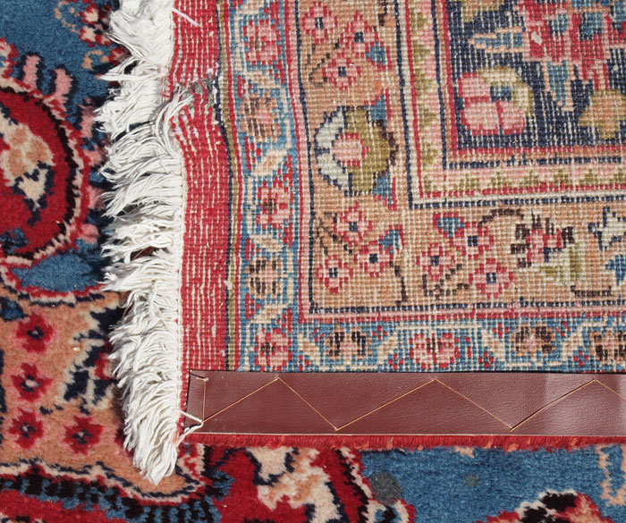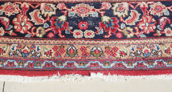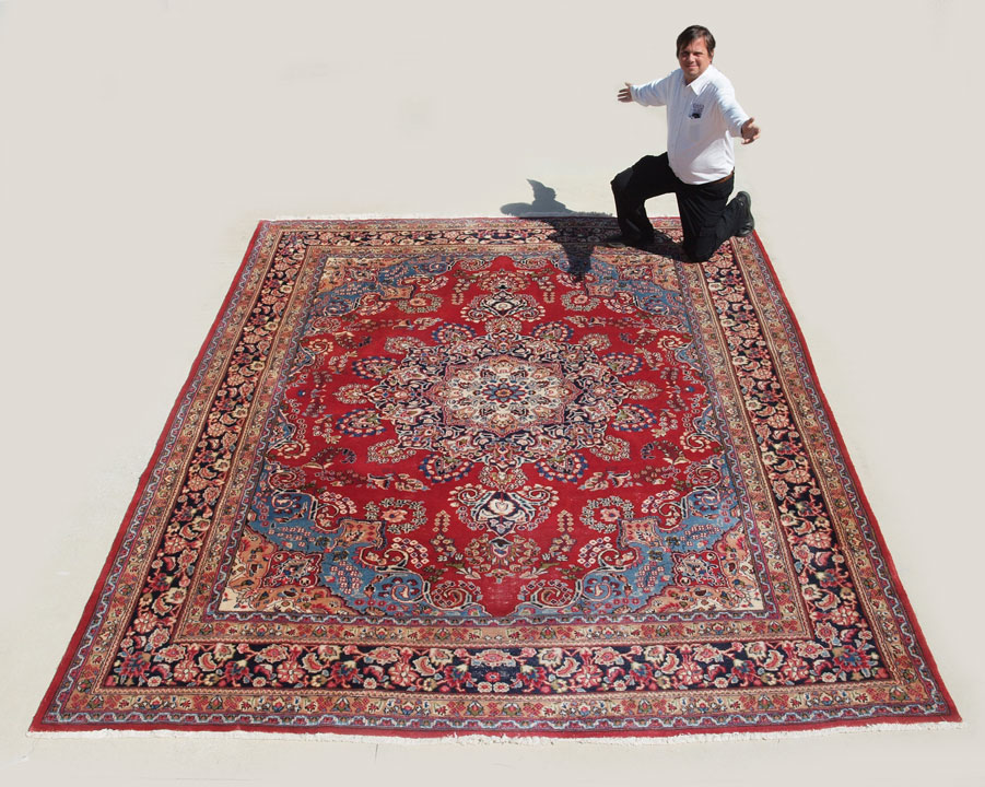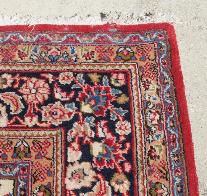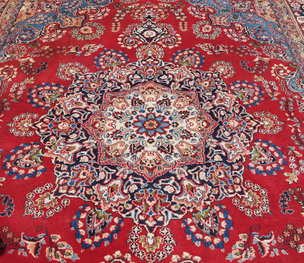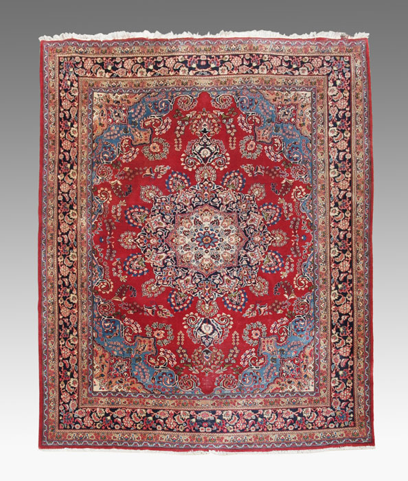 ESTATE HAND TIED IRANIAN CARPET: Approx. 12'9'' x 9'10'', center medallion, three border. red ground with blues.