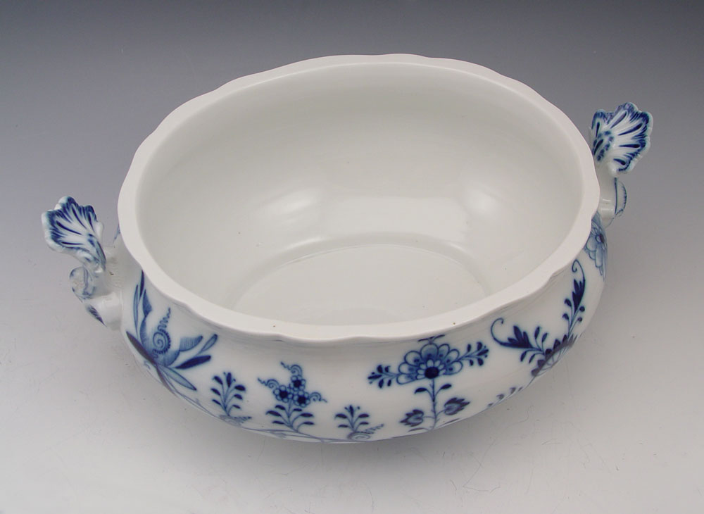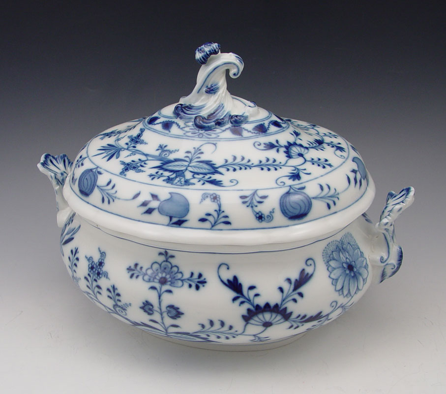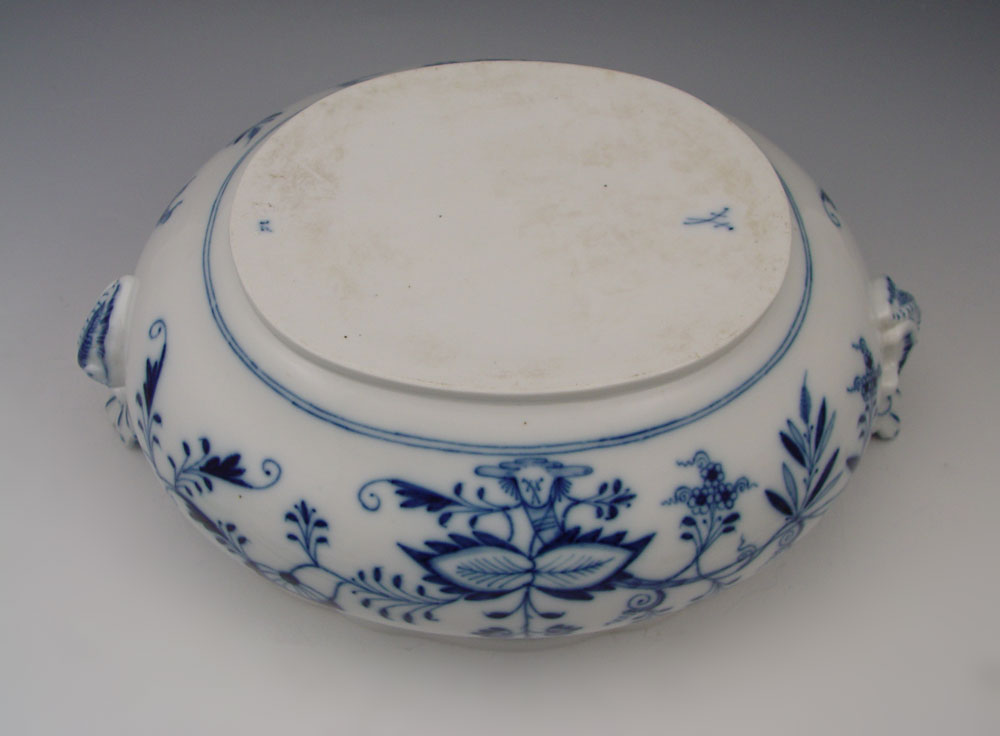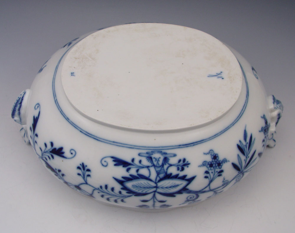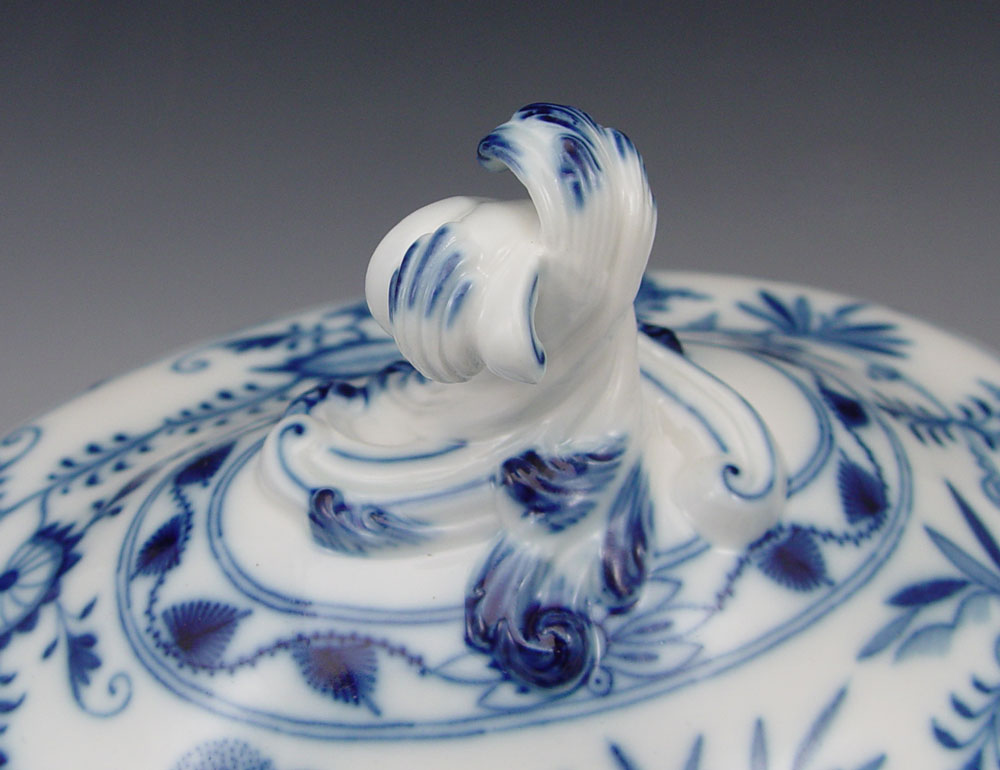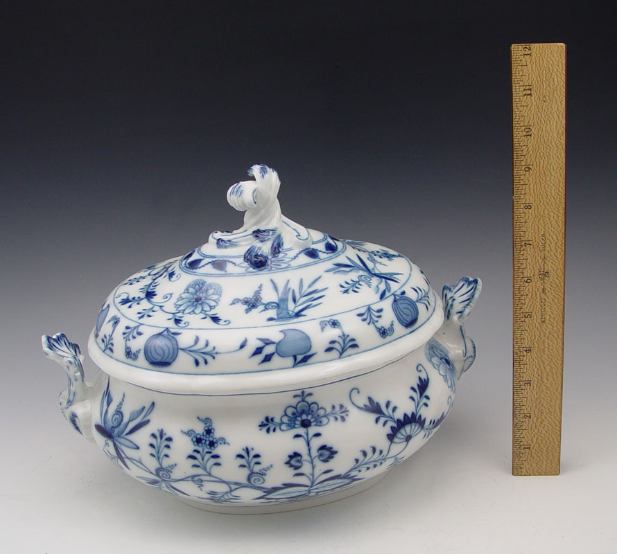 MEISSEN BLUE ONION PATTERN OVAL TUREEN WITH LID: 12'' dia., 9'' tall including the scrolled finial.