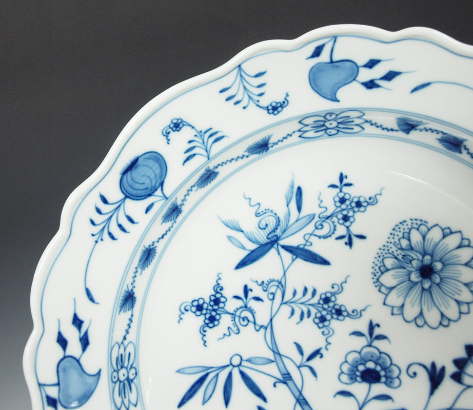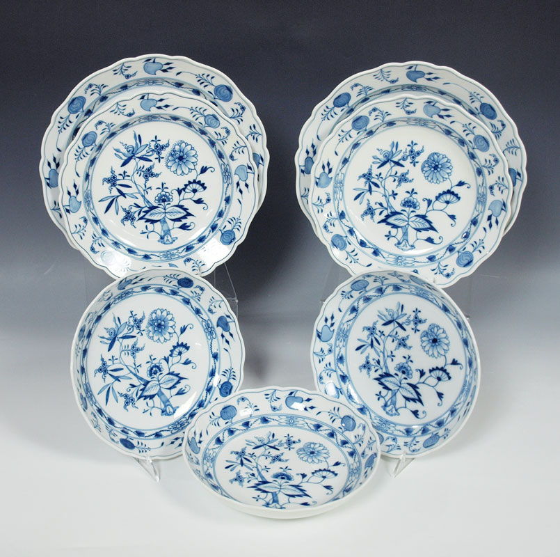 GROUP OF 7 BLUE ONION SERVING AND SOUP BOWLS: Three bowls are 9 3/4'' dia., two are 10 1/2'' dia., and one is 12 3/4'' dia.