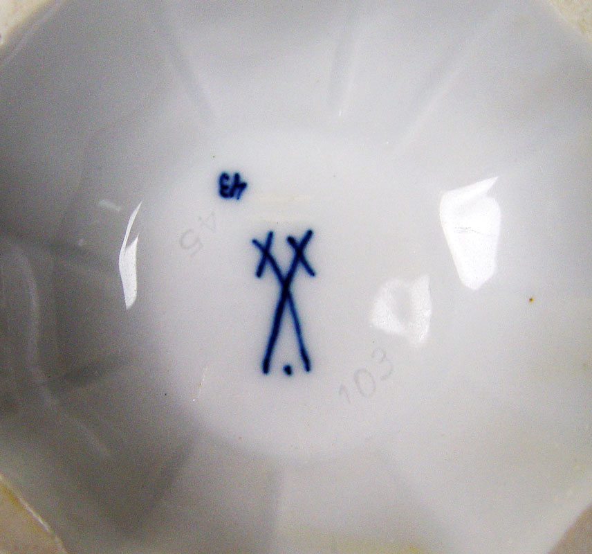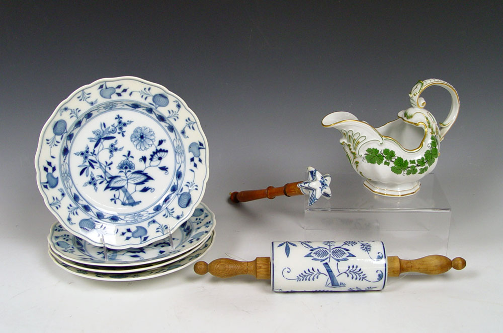 MEISSEN BLUE ONION AND FULL GREEN: 7 piece group to include 4 Meissen Blue Onion plates, 9'' dia. A Full Green gravy boat, 9'' long x 6'' tall. Also in the Blue Onion pattern a wood handle star shaped porcelain chocolate stirrer and a porcelain rolling pin with wood handles.