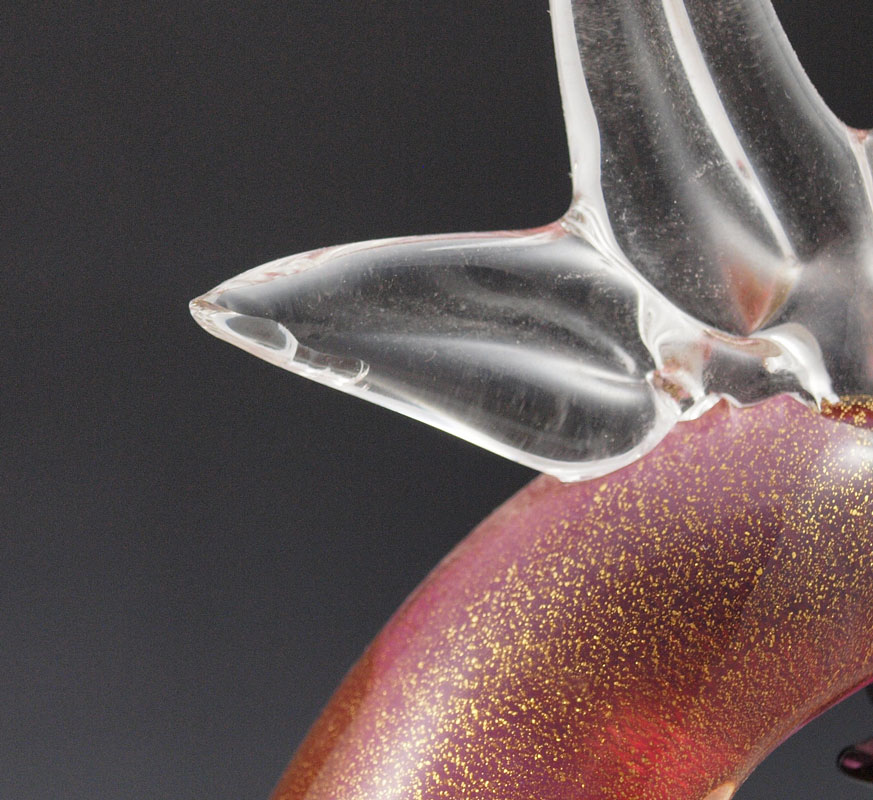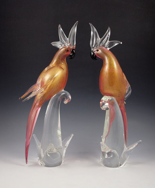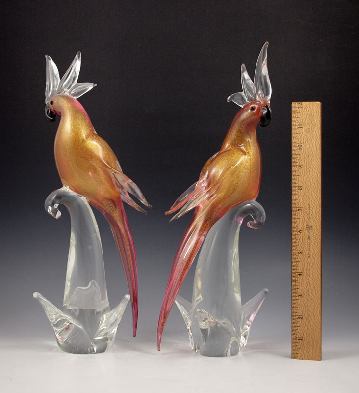 PAIR MURANO GLASS BIRDS: 15'' tall, Cranberry aventurine, paper label.