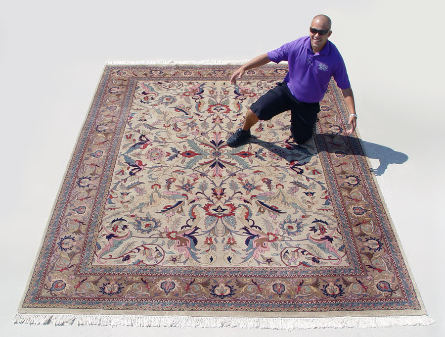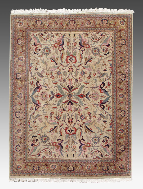 FINE HAND TIED ORIENTAL RUG: Approx. 9 ft x 12 ft. Cream ground with central medallion and design of leaves.