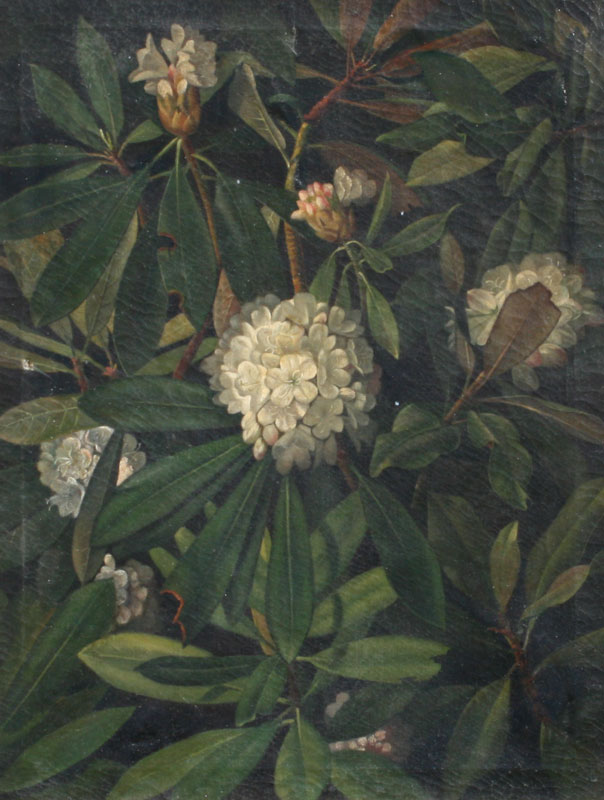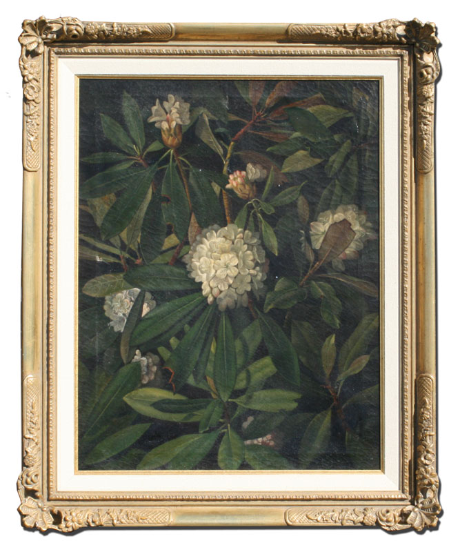 19TH CENTURY OIL ON CANVAS STUDY OF RHODODENDRON BLOSSOMS: 27'' x 21'', no visible signature, carved and gilded frame, 33'' x 28''.