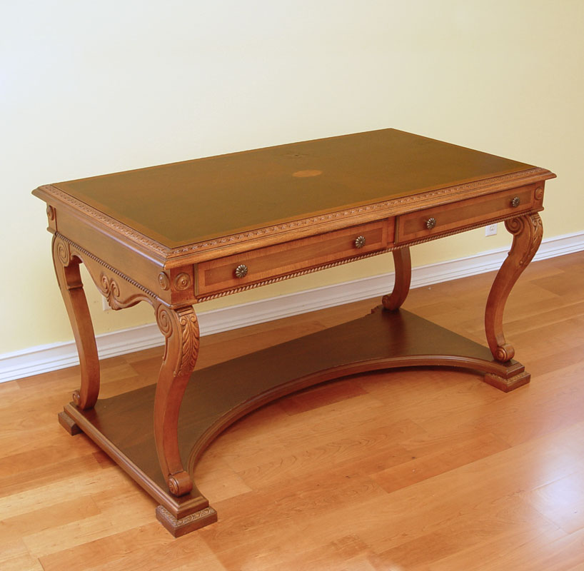 CONTEMPORARY 2 DRAWER LIBRARY TABLE: Carved trim, scrolled legs resting on lower shelf, 30''h. x 55''w. x 30''. Matching table at next lot 173A.