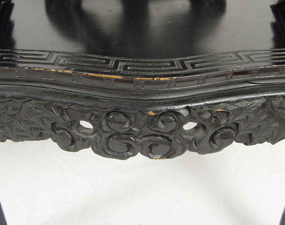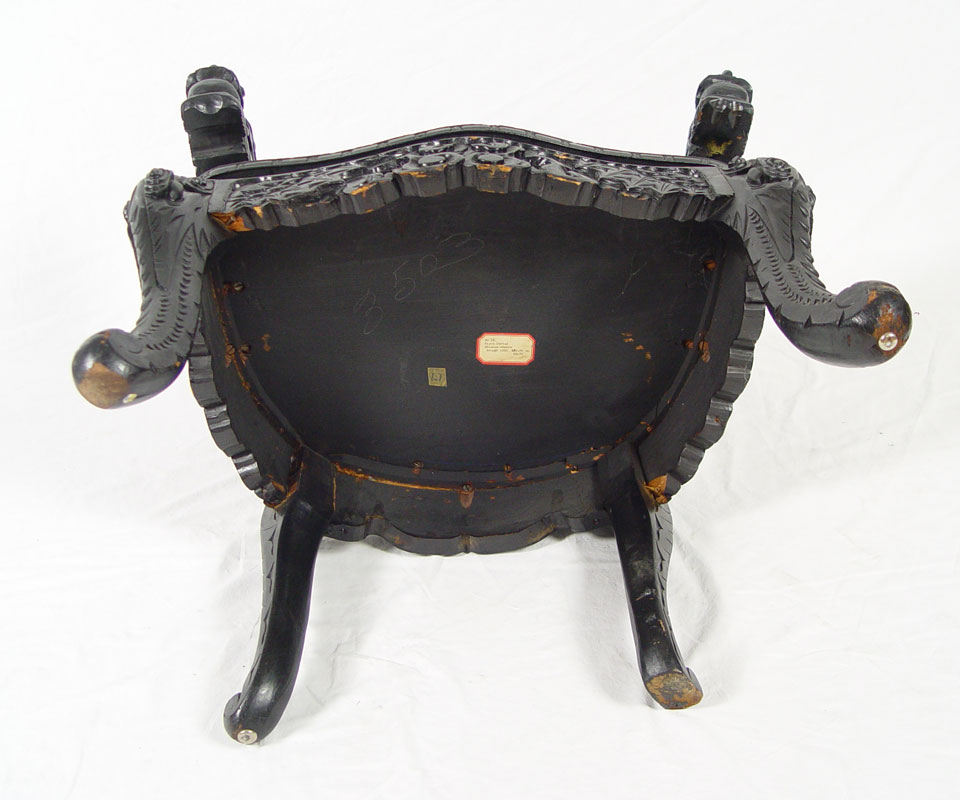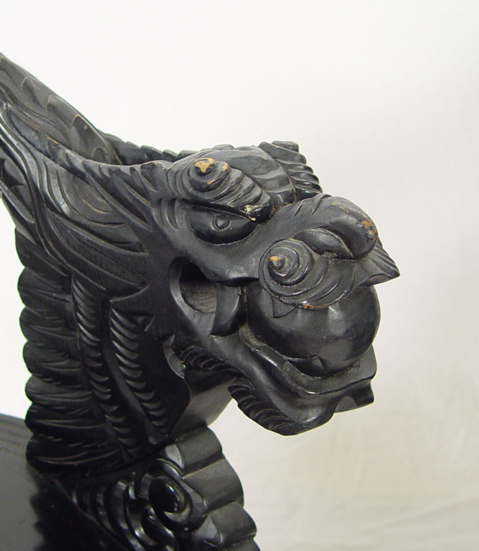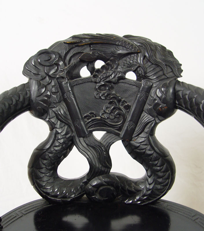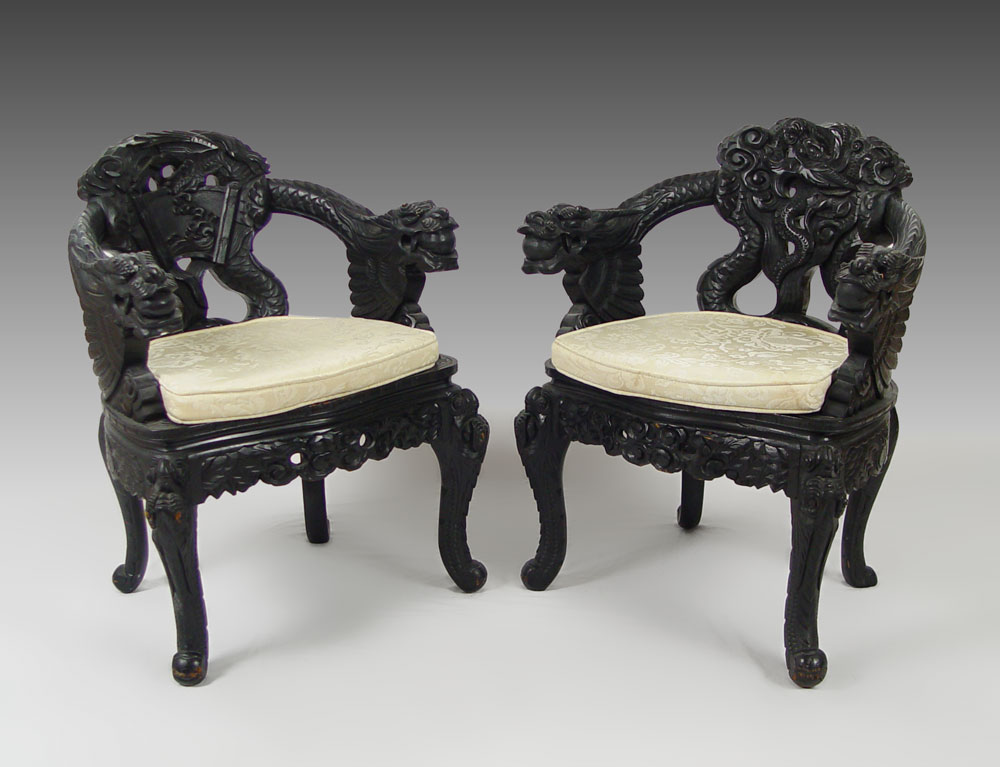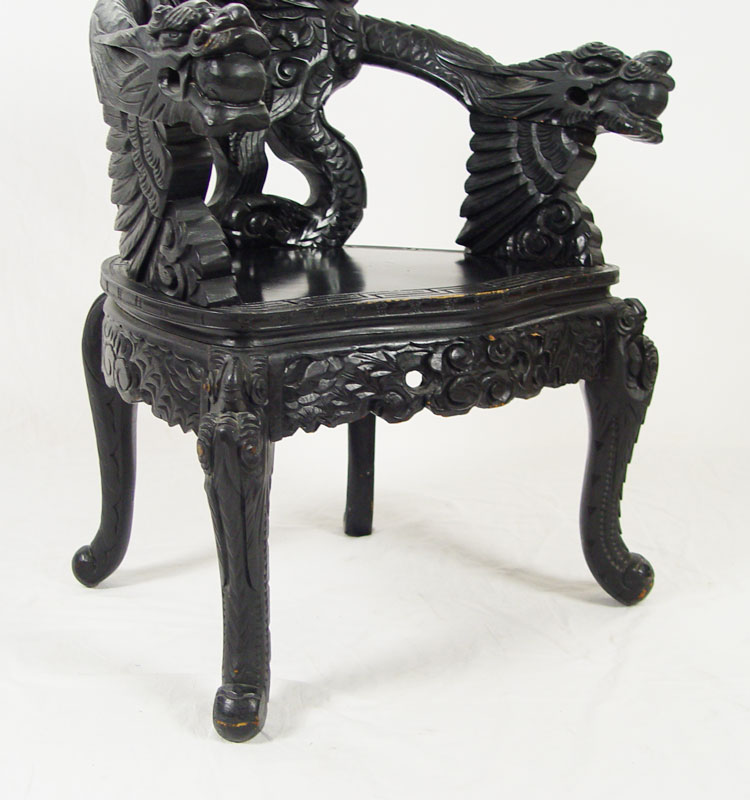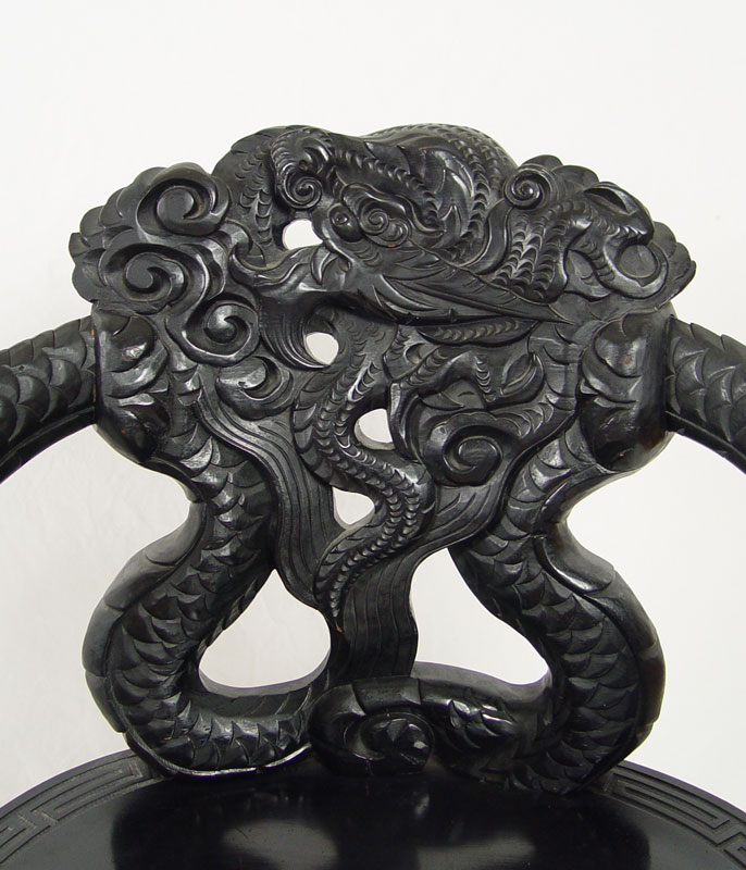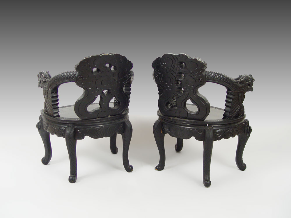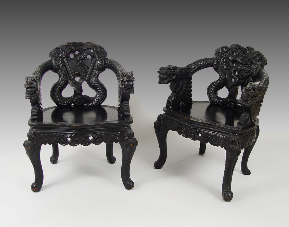 PAIR CHINESE CARVED DRAGON CHAIRS: Ebony finish. The backs are each carved in a unique design. 32''h. x 20'' x 25''.