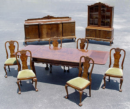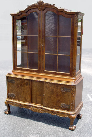 RICHLY GRAINED BURLED WALNUT CHINA CABINET: Glass front, shelf interior, cabinet base on cabriole legs. 74'' h. x 48 1/2'' x 19 1/2''. The matching table is at previous lot, the sideboard at the next lot 19.
