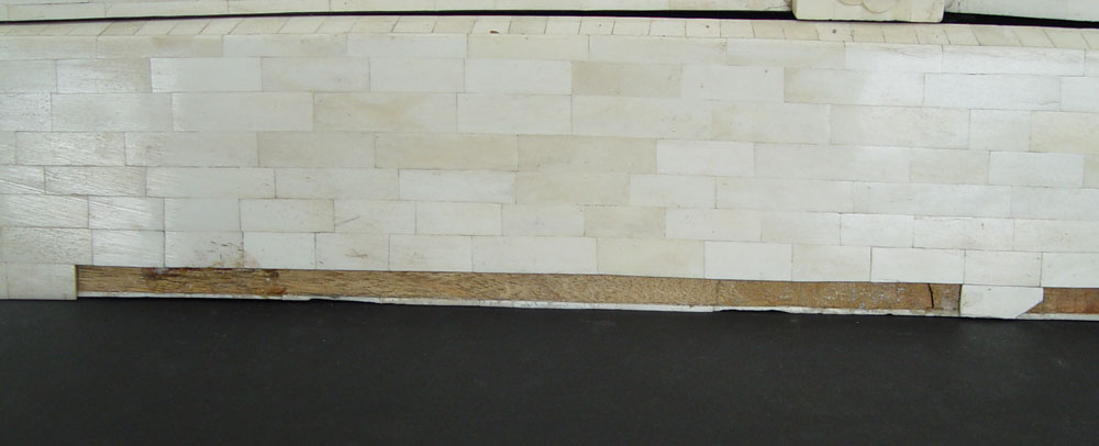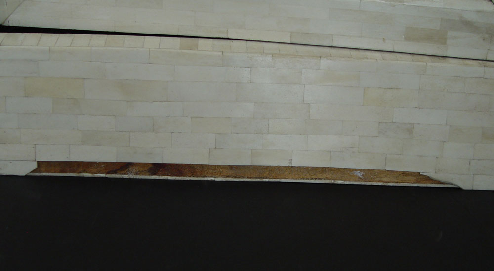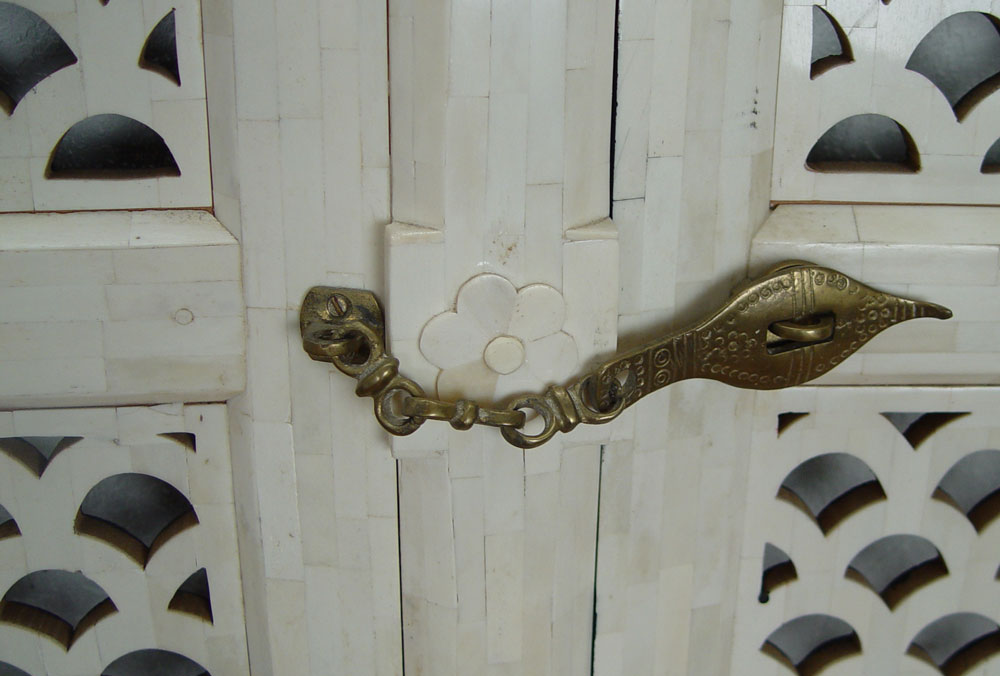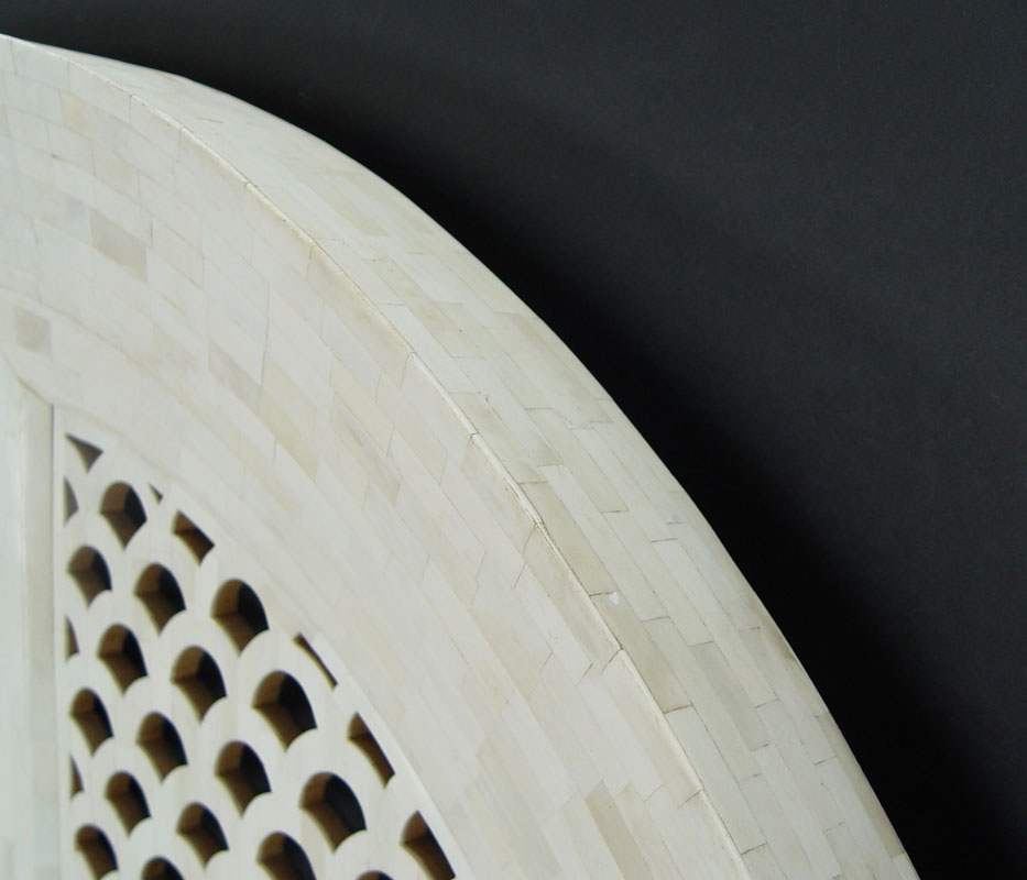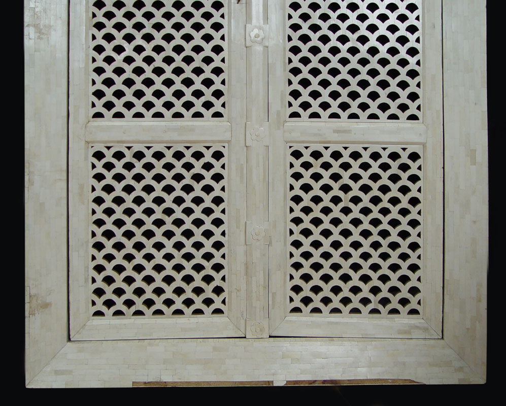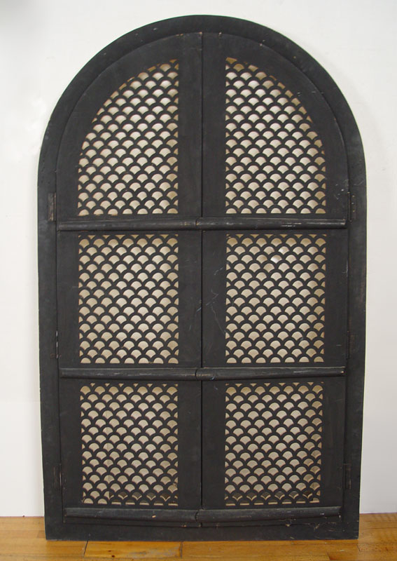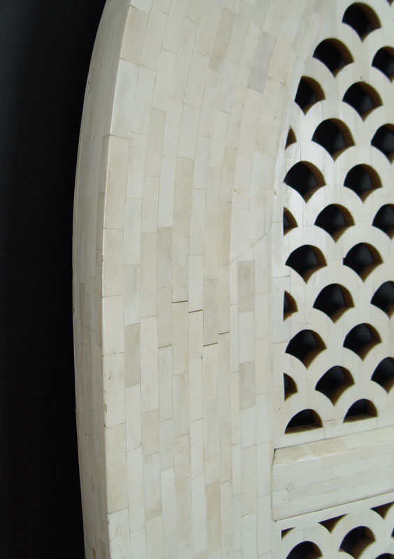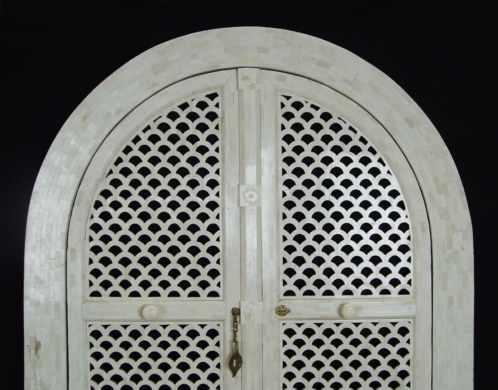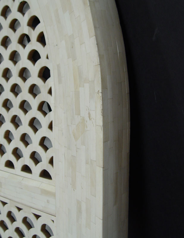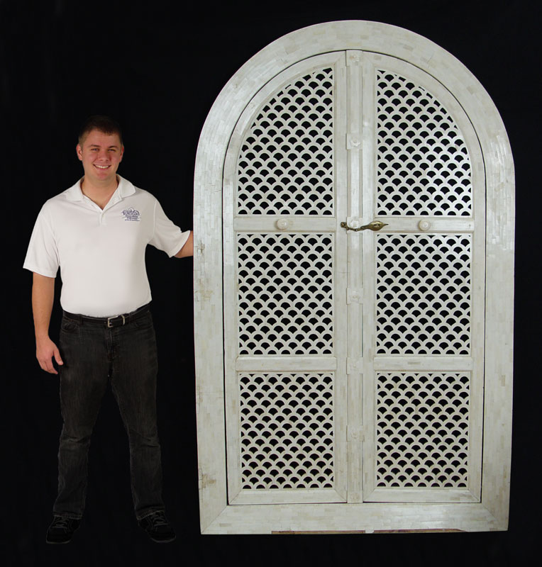 ARCHITECTURAL BONE CLAD DOUBLE DOOR / ARCH: Bone tile clad arched door or window cover in frame. Approx. 79'' tall x 48'' x 3'' deep.