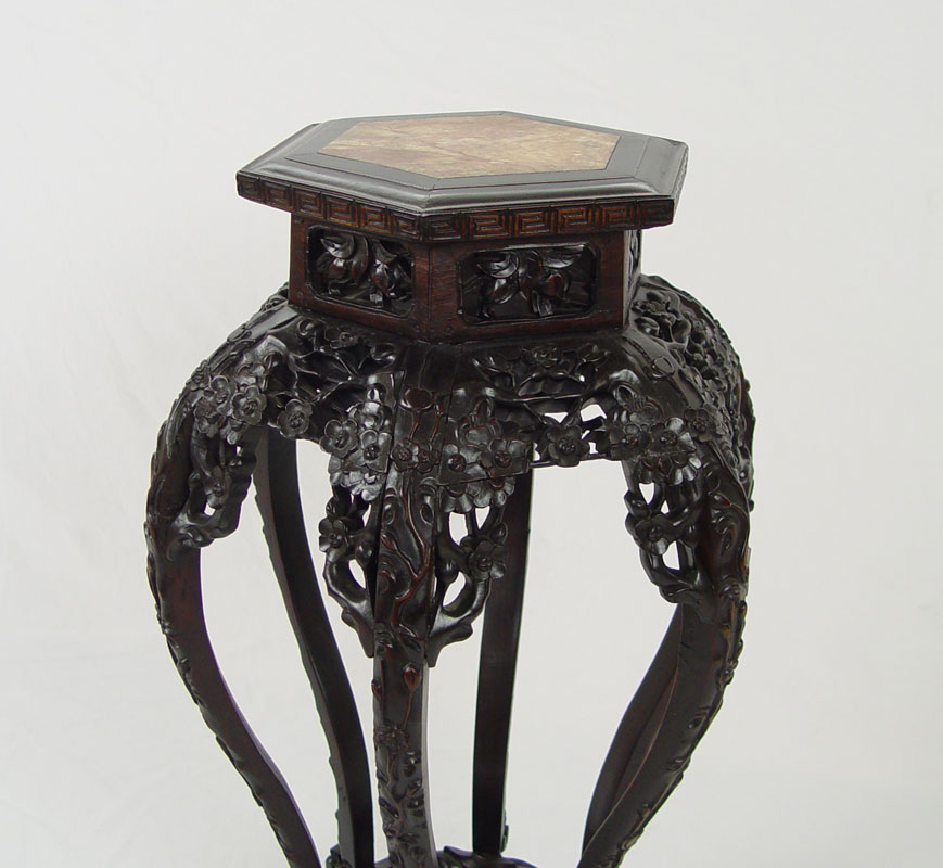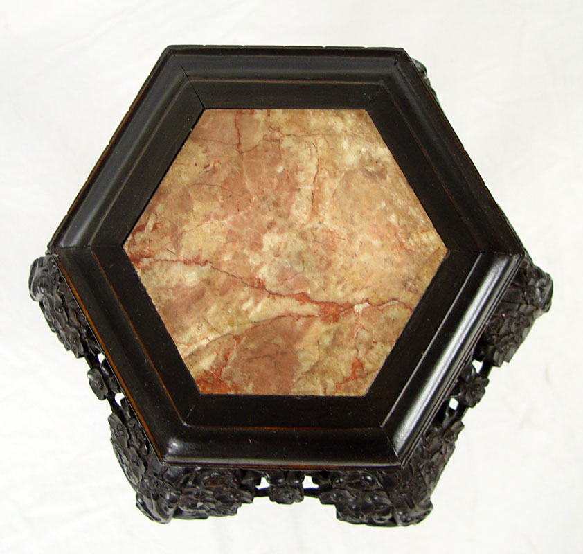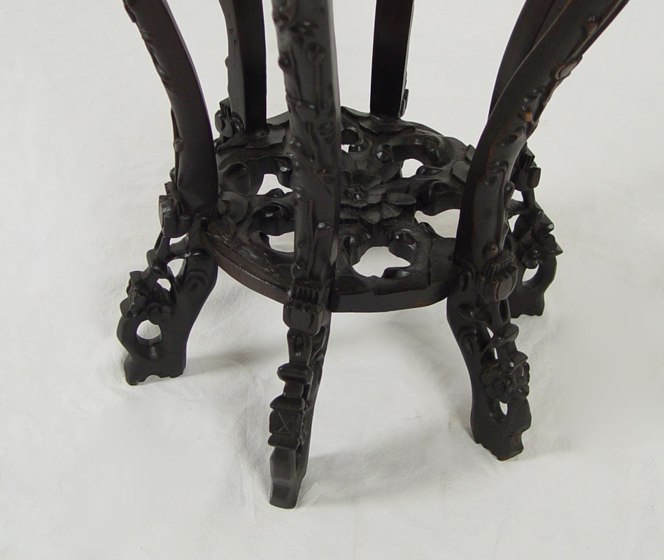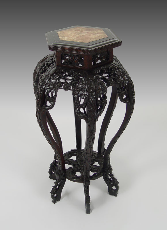 CHINESE CARVED ROSEWOOD FERN STAND: With octagonal inset marble top, supported by 6 carved and open cut legs supporting the lower shelf, 31''h., 12'' top, 18'' knee to knee.
