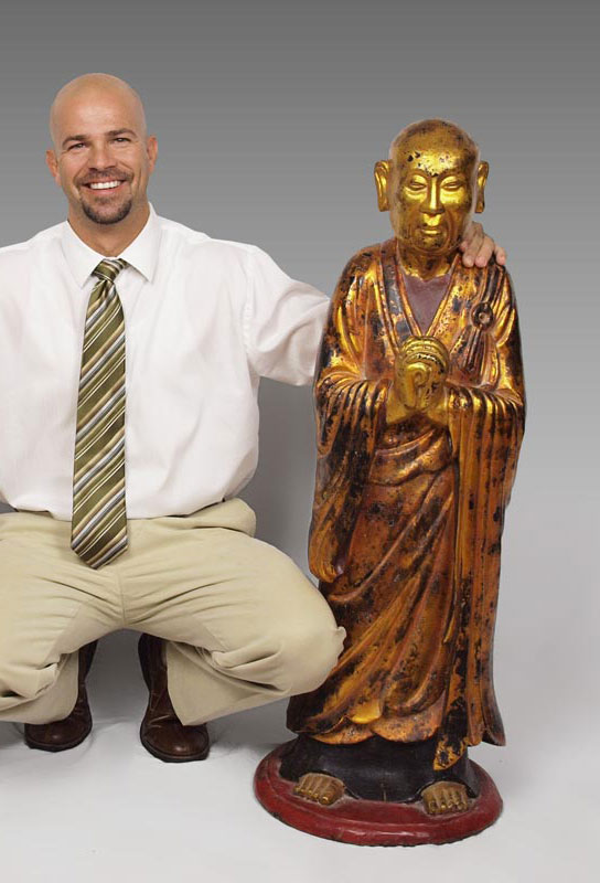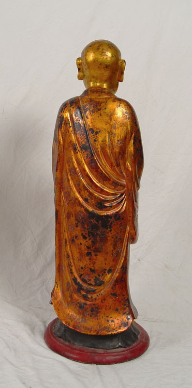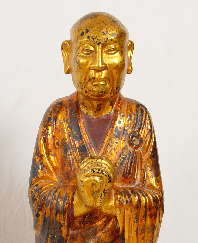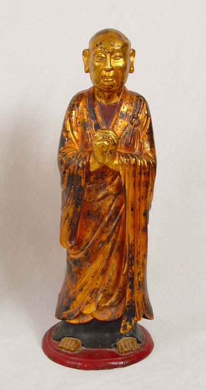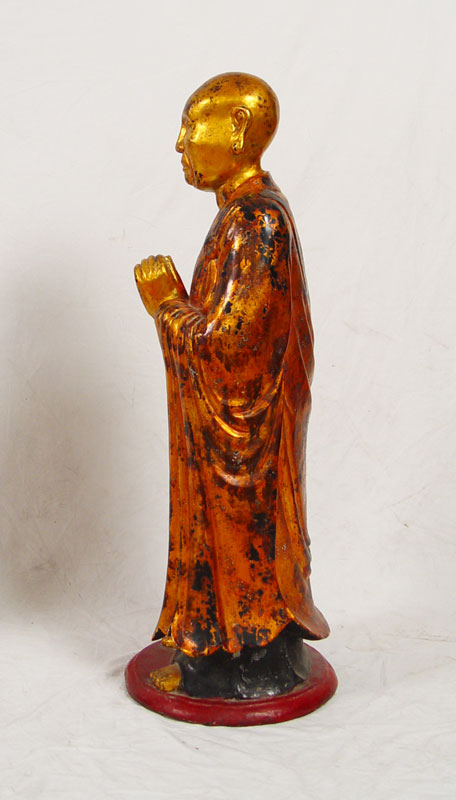 19TH C CARVED WOOD AND GILDED BUDDHIST STATUE OF KASYAPA WITH HANDS CLASPED: 42'' h., finish shows wear appropriate for the age, Burmese in origin.