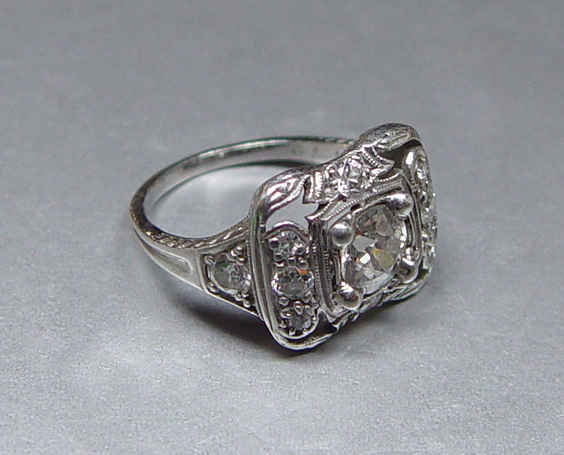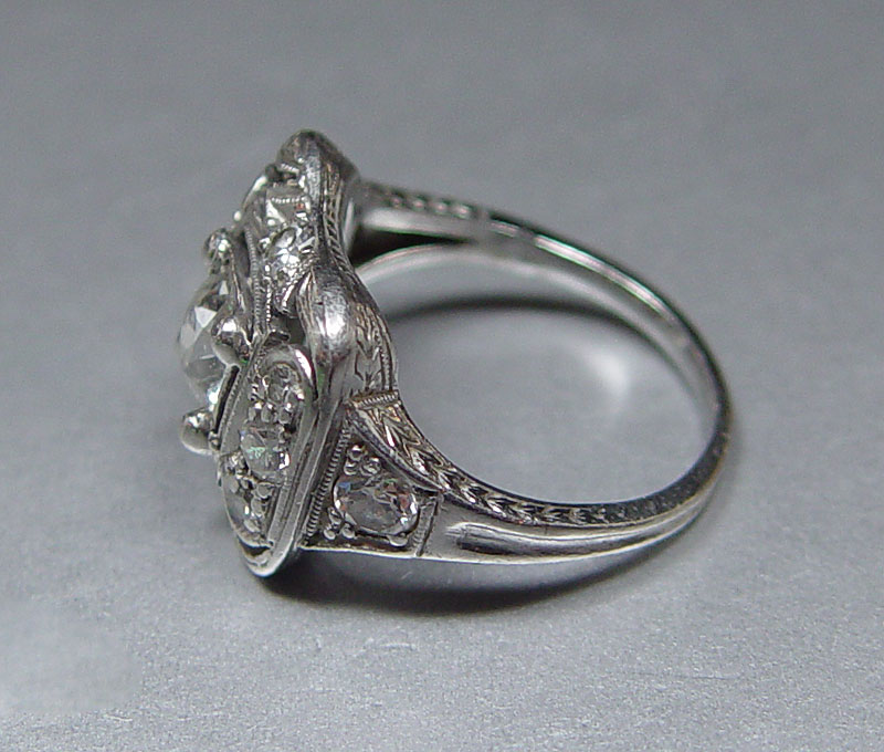 1920's PLATINUM DIAMOND RING: Platinum diamond ring centers an old European round cut diamond, approx. .65 Ct., rated VS2 in clarity and H-I color. The ring is also set with 10 round full and single cut diamonds, approx. total weight 1.25 Ct., averaging VS-SI clarity and H-I color. The diamonds are prong and bead set. Size 3.75. Weight 5.2 grams. Sold with current Florida Diamond Appraisers GIA graduates appraisal for $5,750.