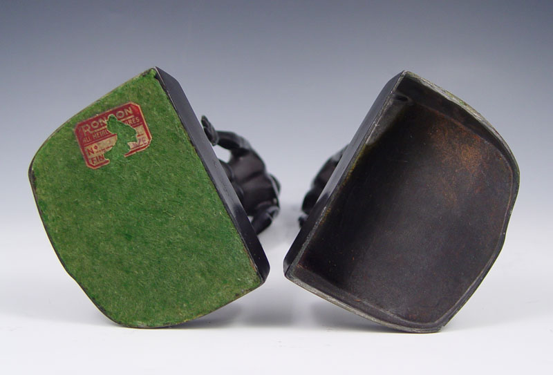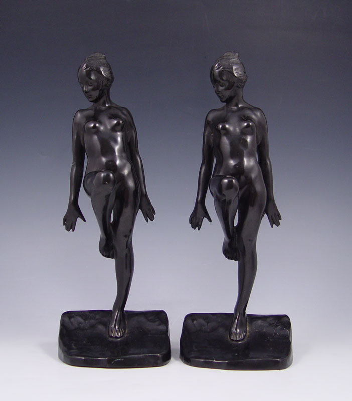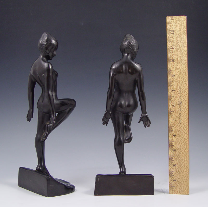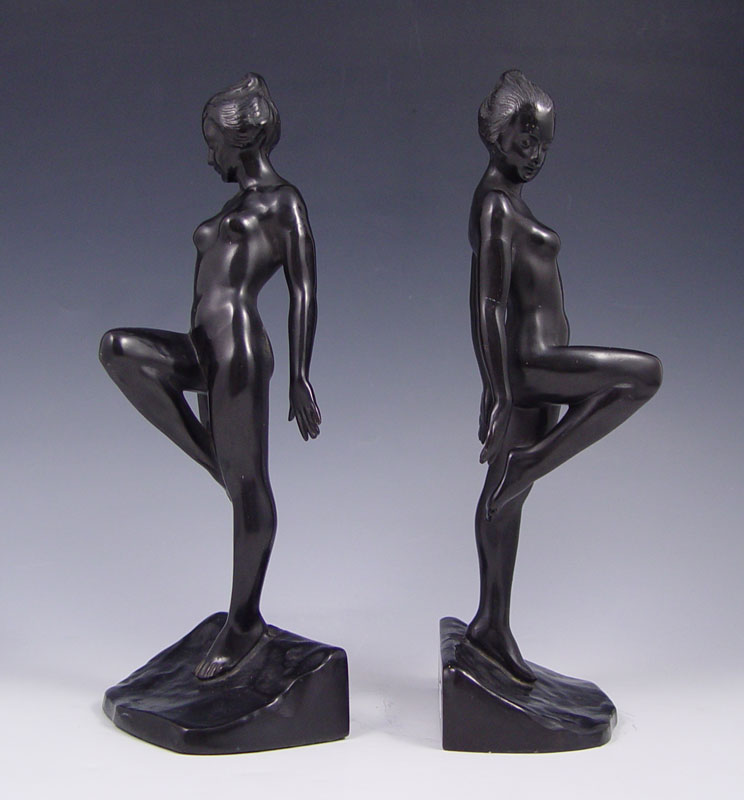 PAIR RONSON ART DECO FIGURAL NUDE BOOKENDS: Cast metal, glossy black finish. Partial paper label under base on felt. 10 3/4'' h. x 4'' x 3 1/8''.