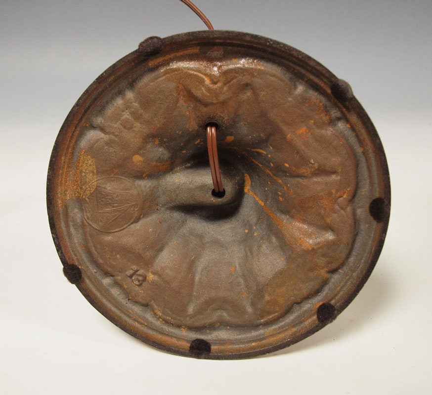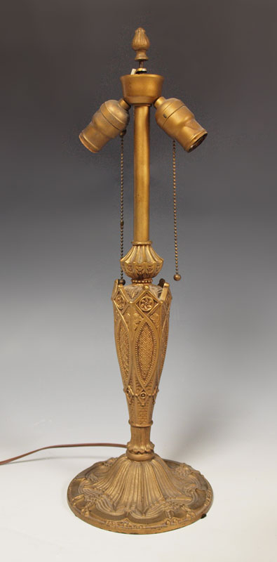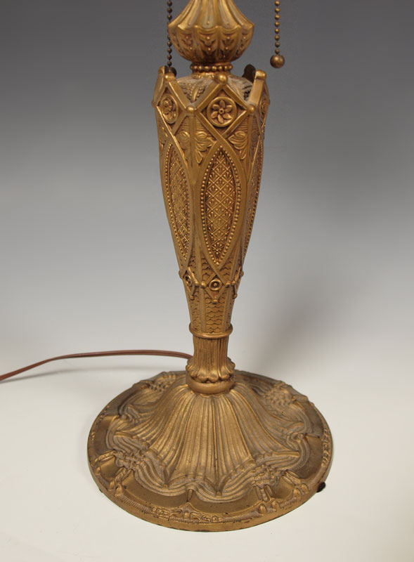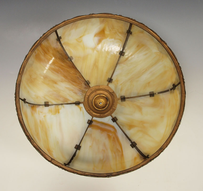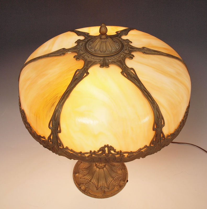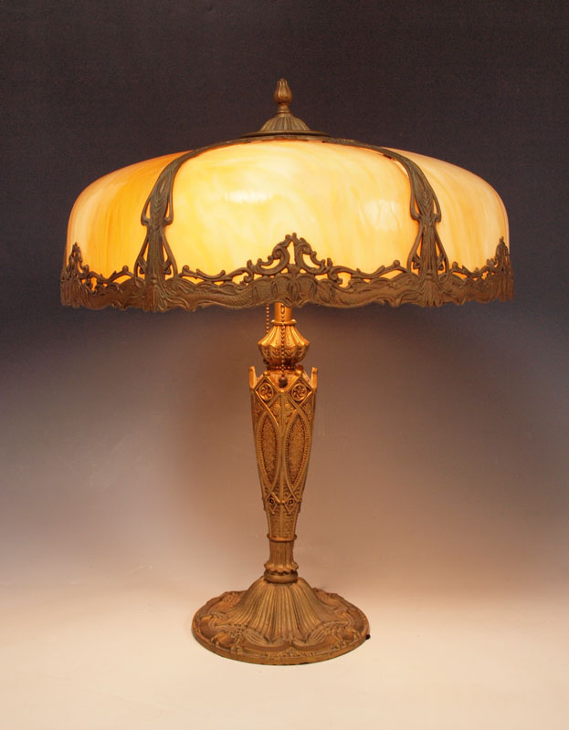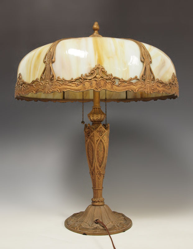 VINTAGE SLAG GLASS TABLE LAMP: 6 bent panel caramel glass and filigree metal shade on a gothic style base. 2 pull chain sockets. Lamp is approx. 22 tall, shade 18'' dia.