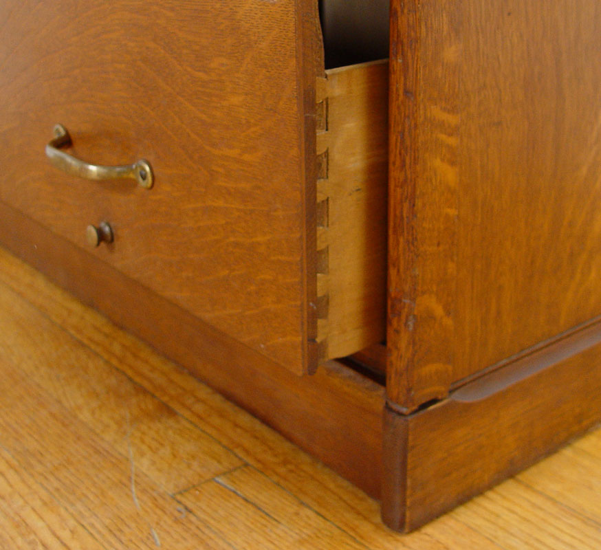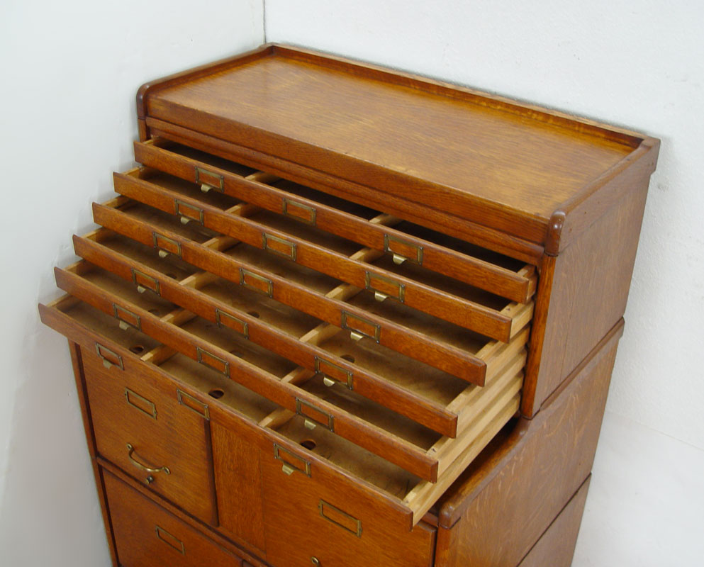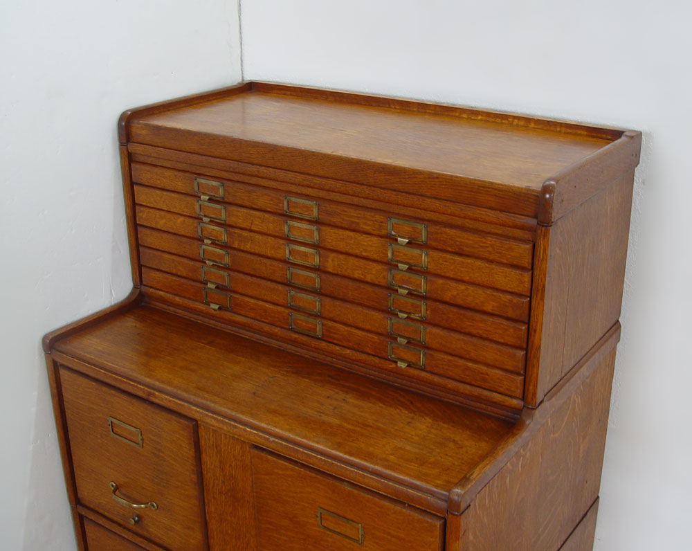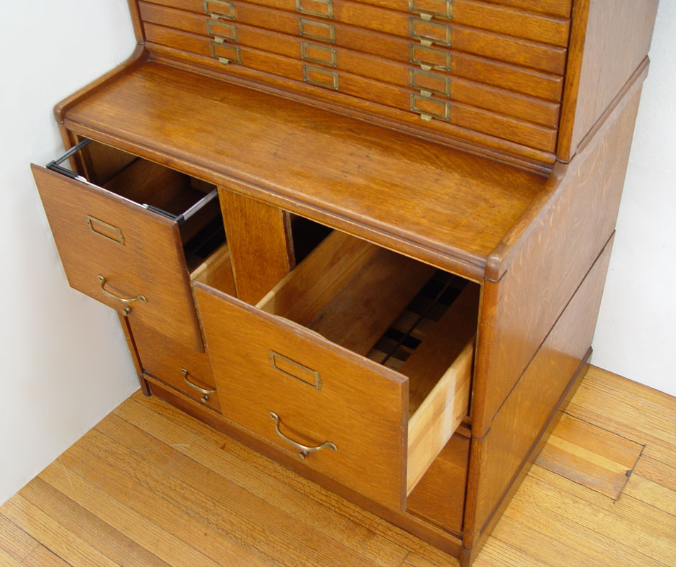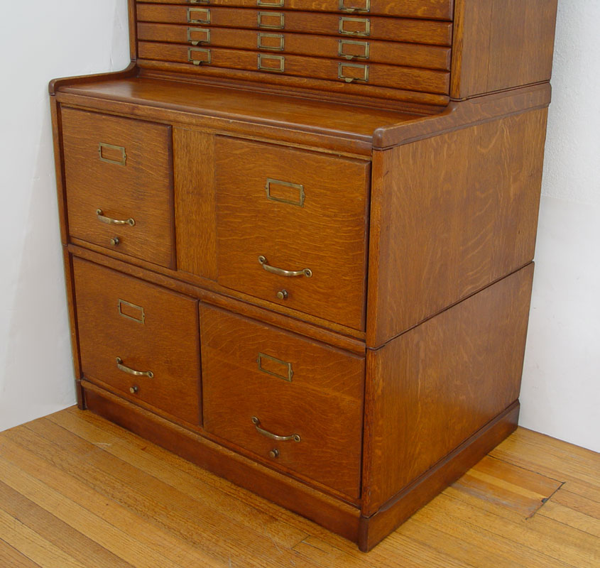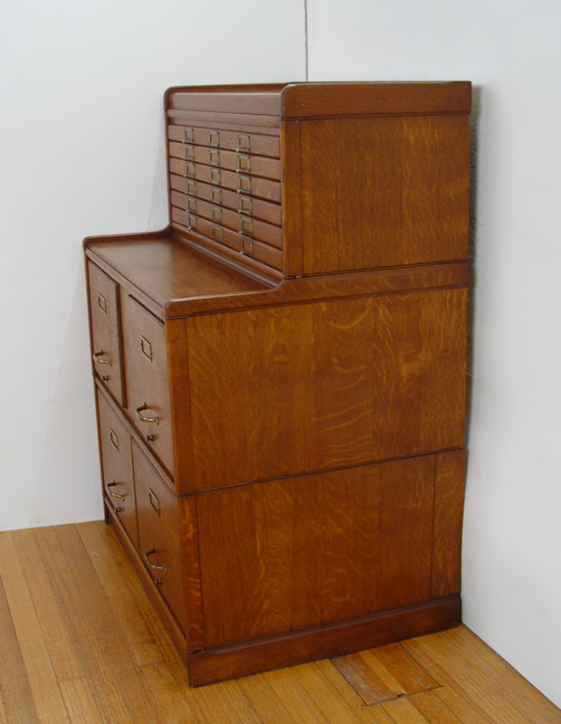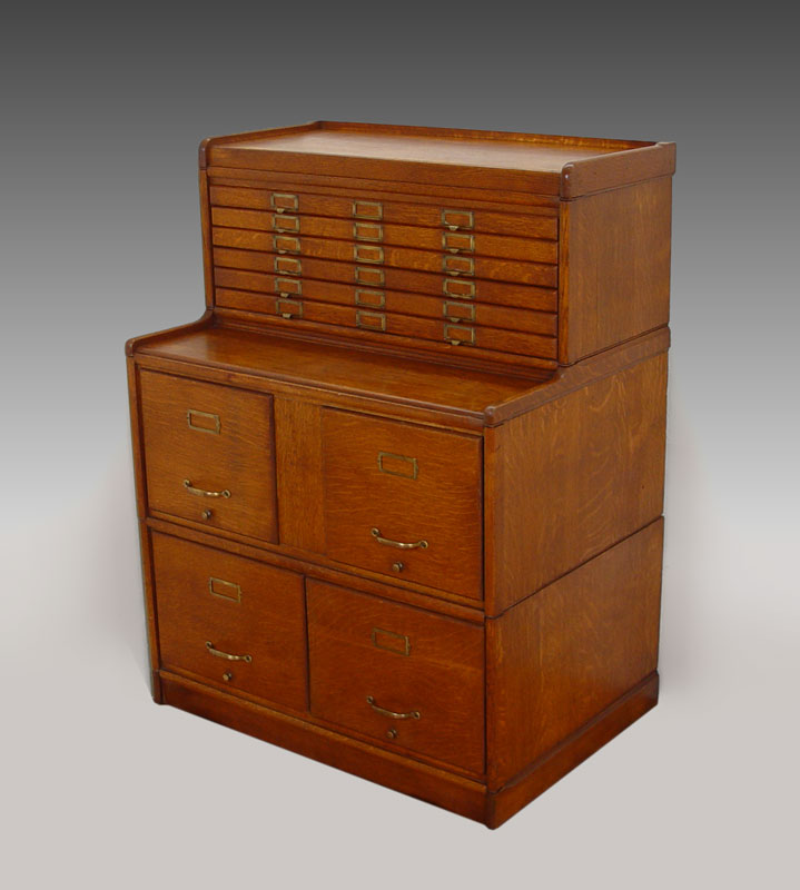 6 PIECE STACKABLE OAK FILE CABINET: 4 file drawers, 6 partitioned document drawers, 45 1/2''h. x 34'' x 24''.