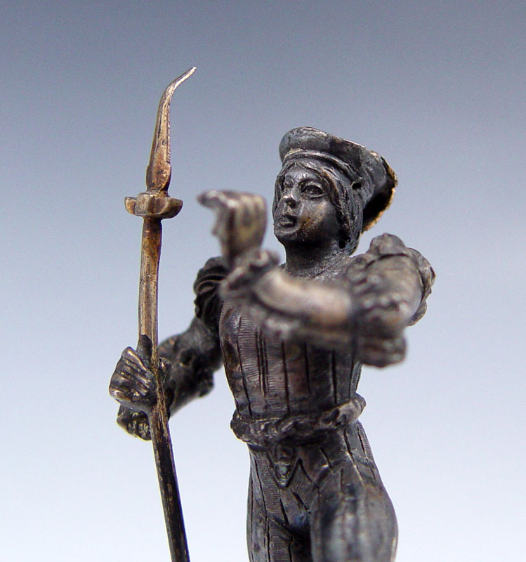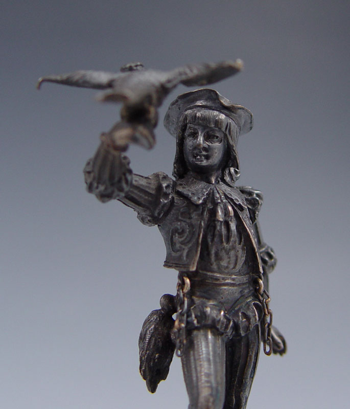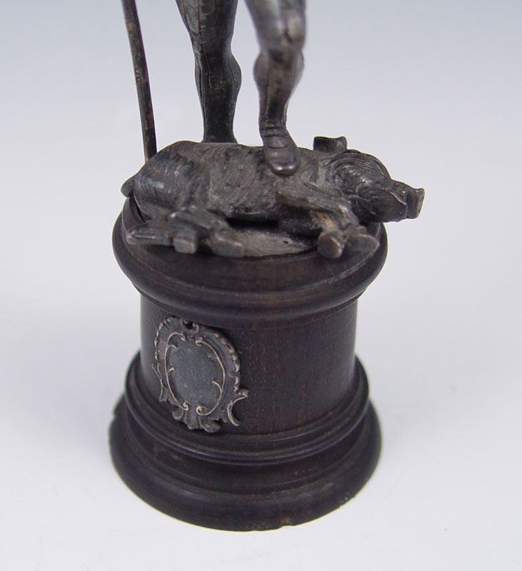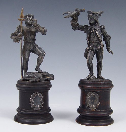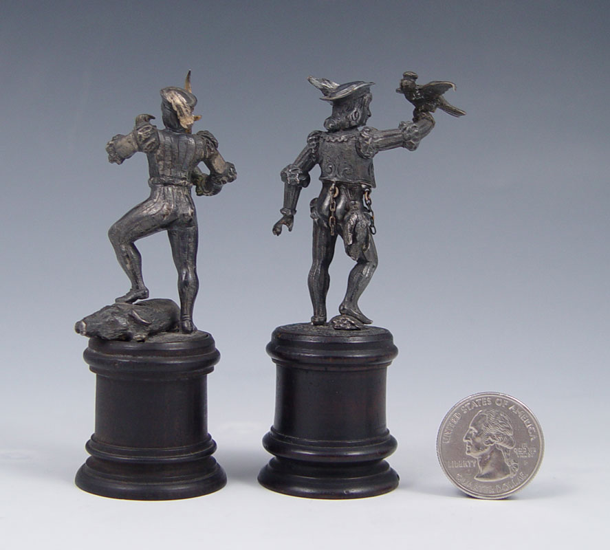 PAIR OF MINIATURE HUNTSMEN ON WOOD PLINTHS: Falconer with falcon and two downed birds, and spearman with downed boar - missing horn, each approx. 3 3/4''h. overall. Silver colored metal - pewter?, no mark found, chips to bottom of wooden bases.