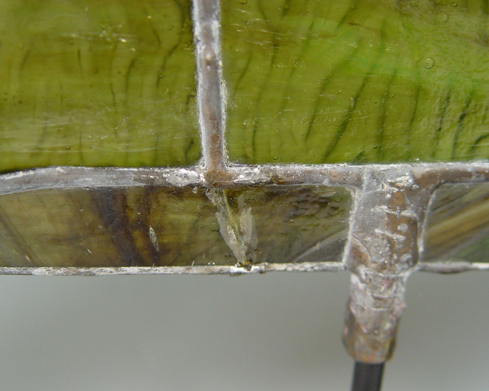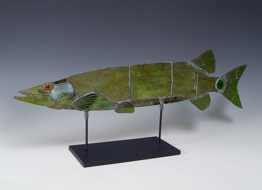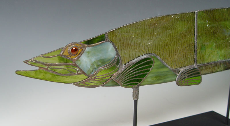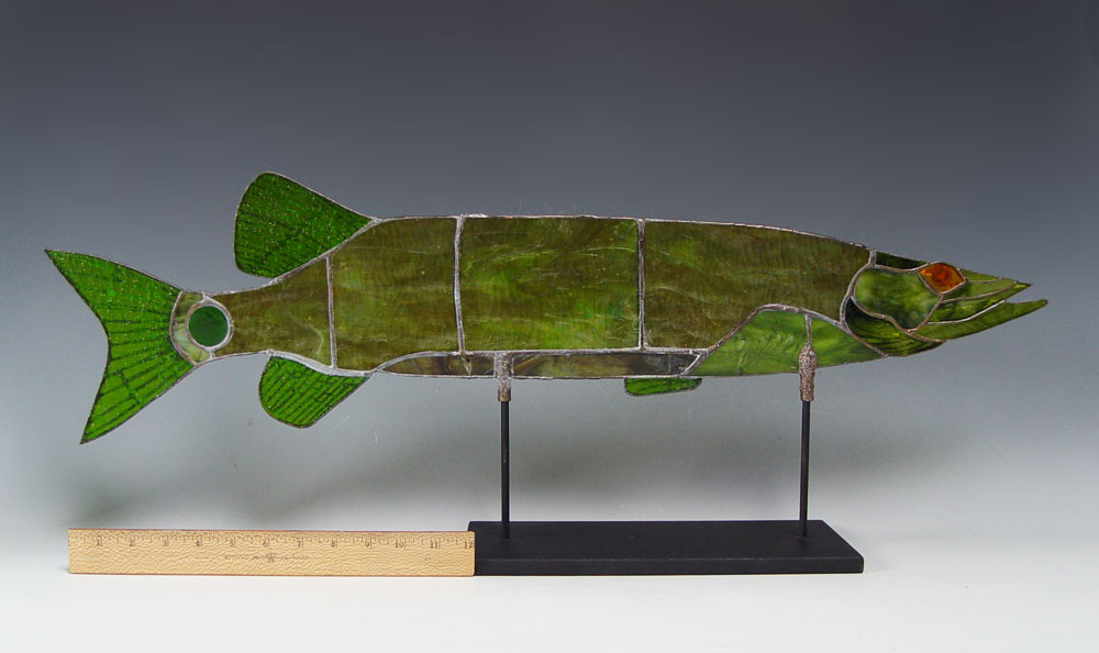 FIGURAL STAINED GLASS FISH ON STAND: Leaded green glass fish mounted on custom iron stand. The fish is 32'' long, 12'' tall include the stand.