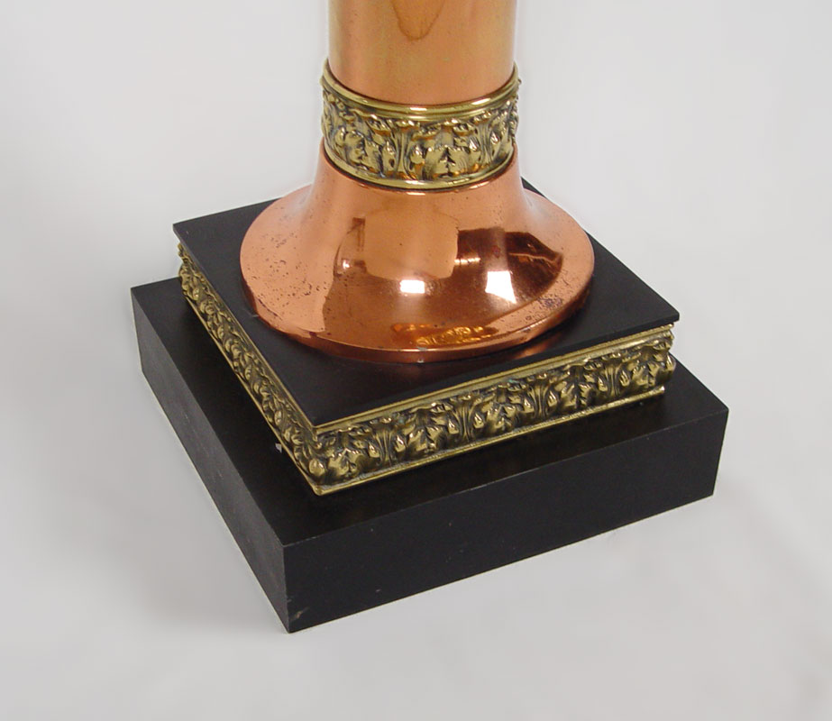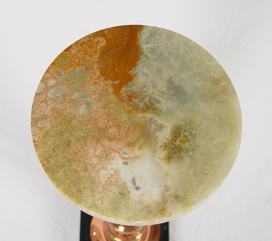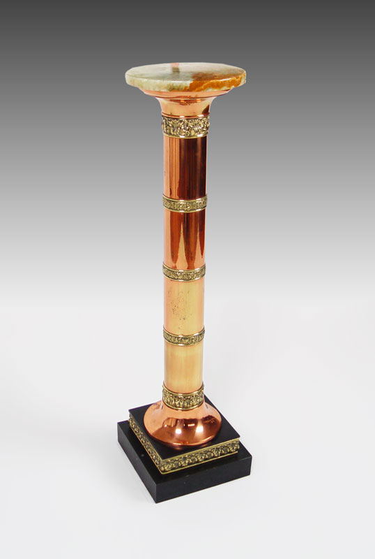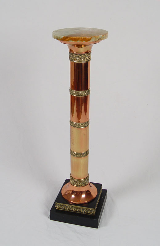 COPPER & BRASS MARBLE PEDESTAL: Green marble? top supported by alternating rings of copper and brass, supported by square metal and brass base, 42''h., 10 1/2''dia. top, 11'' square base.