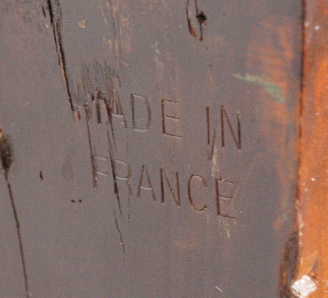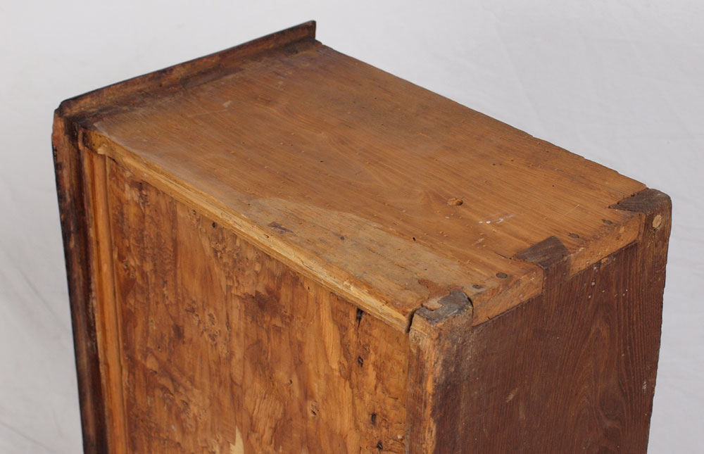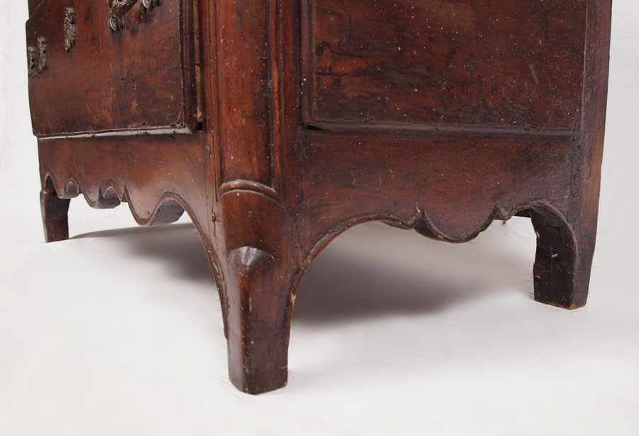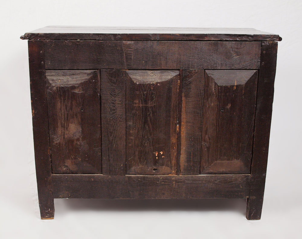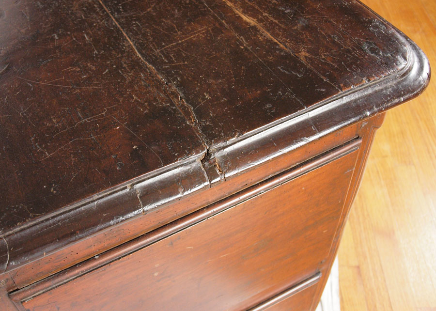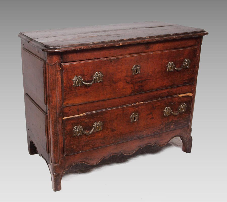 18TH C COUNTRY FRENCH 2 DRAWER CHEST: Thick hand planed wood, chamfered back and drawer bottoms with dovetailed drawers, bronze swag drawer pulls and escutcheons. Note 2'' height added to legs. 33''h. x 42'' x 21''.
