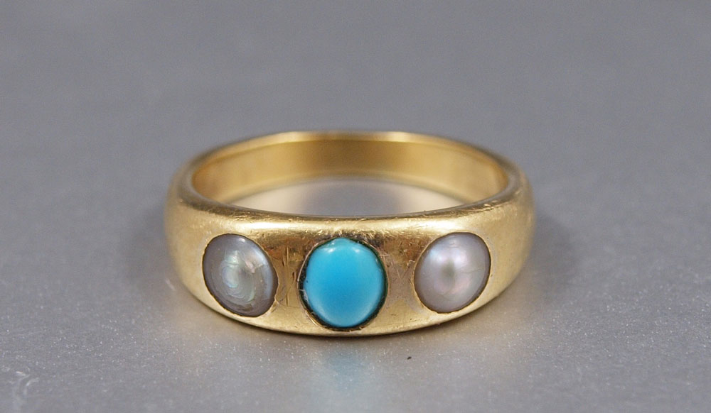 18K VICTORIAN PEARL & TURQUOISE RING: 18K yellow gold ring contains two 4.00 mm half seed pearls. The pearls are worn. One 4.00 mm cabochon cut piece of turquoise. The pearls and turquoise are prong set. Weight: 5.5 grams. Size: 5.5
