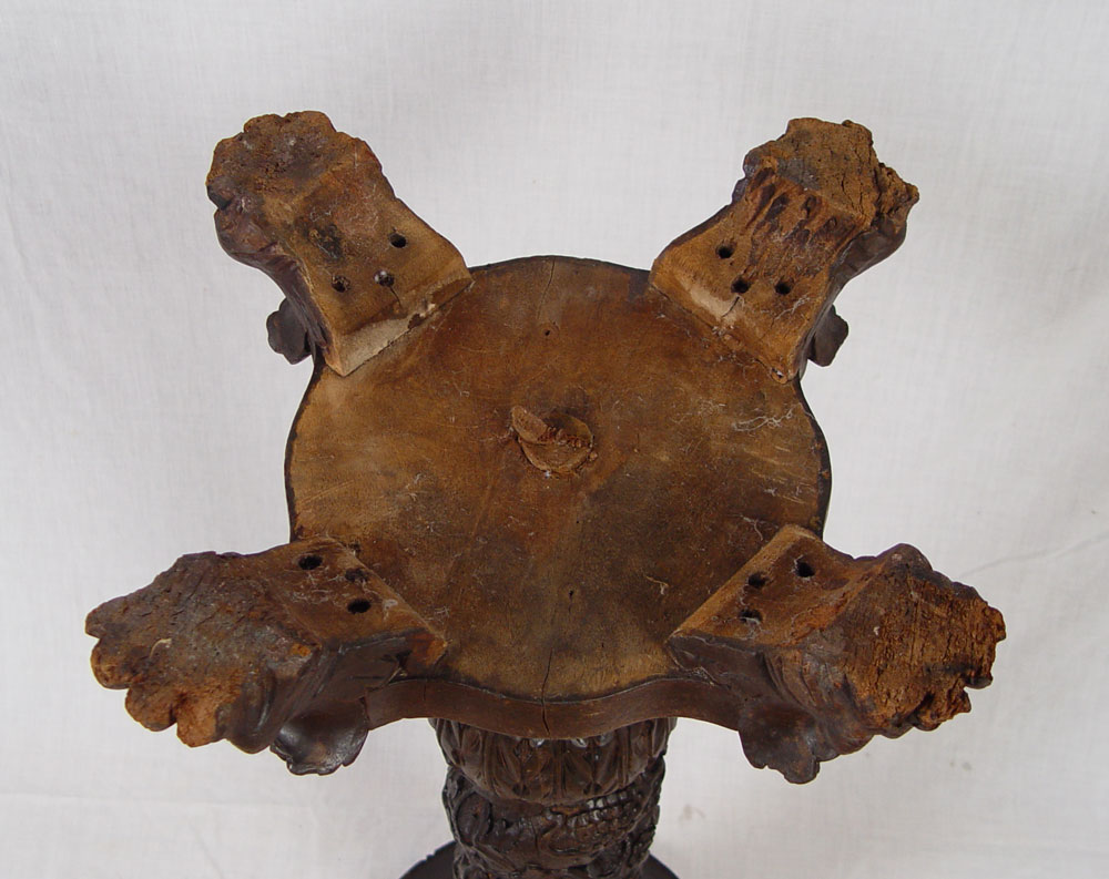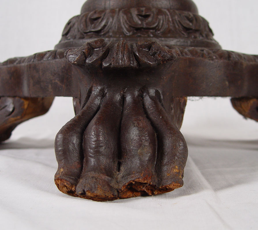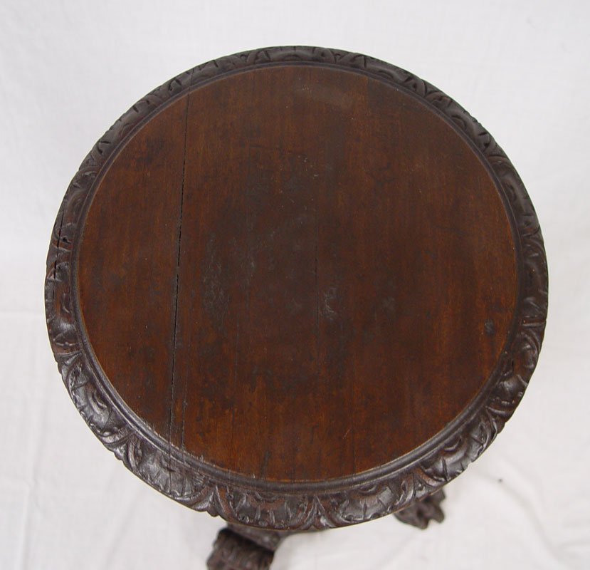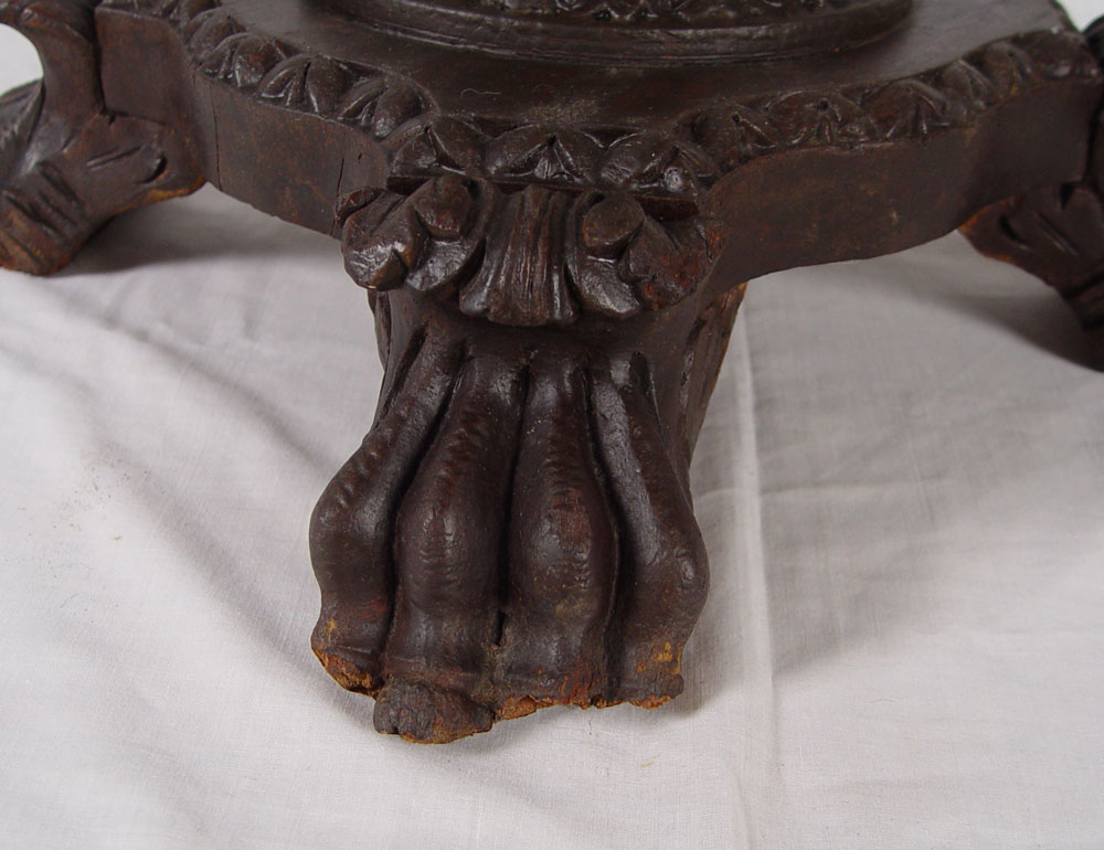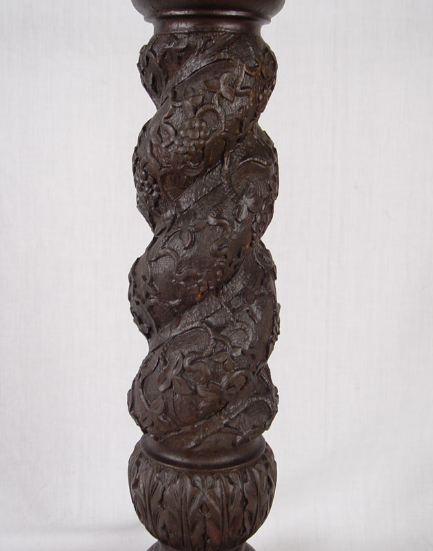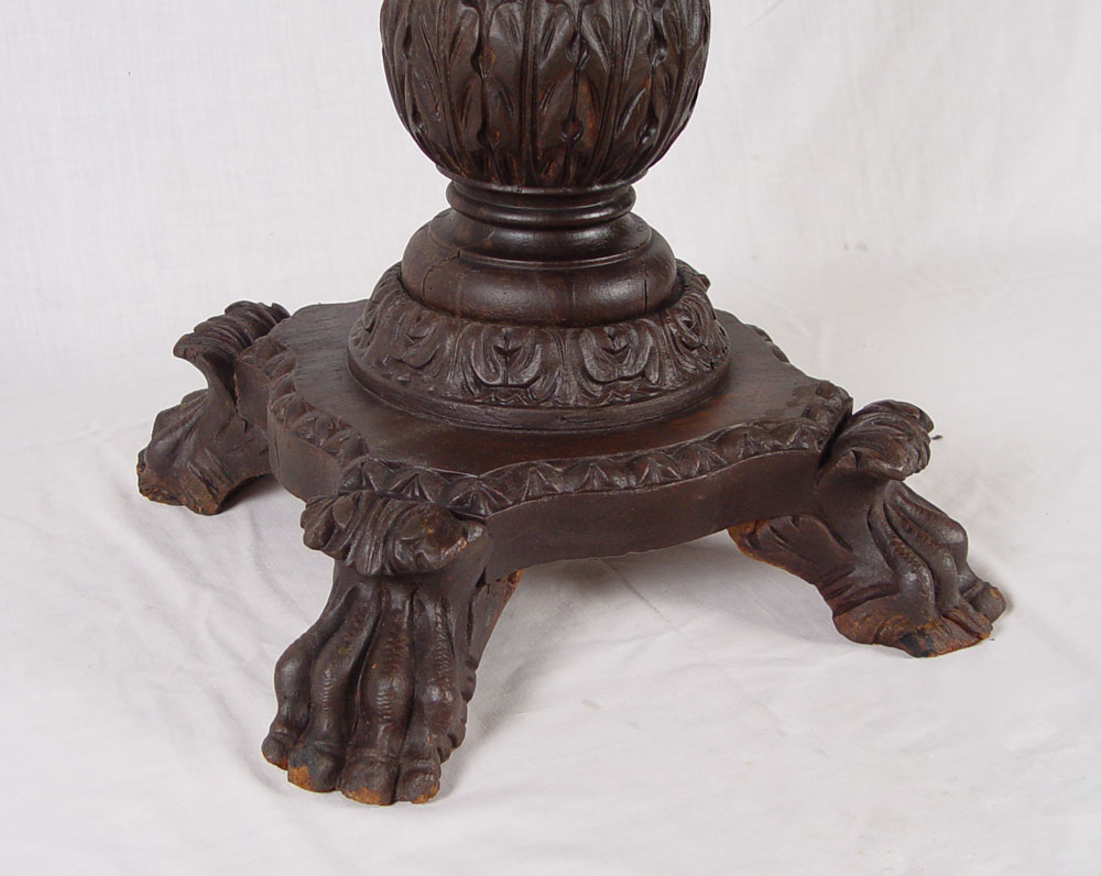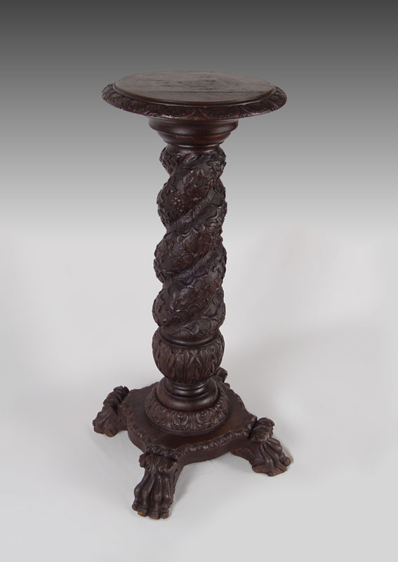HEAVY VICTORIAN BLACK WALNUT CARVED PEDESTAL: Turned top supported by profusely carved swivel shaped pedestal in a grape and ivy design, rests on carved base with paw feet, 36 1/2''h., 14 3/4''dia., 17'' x 17'' base.