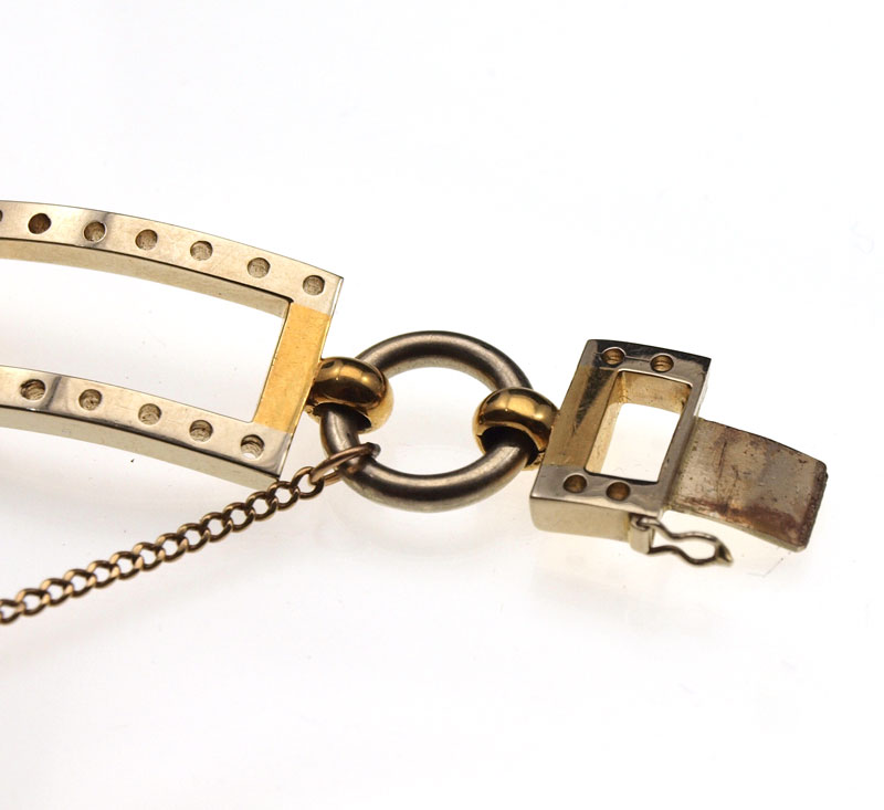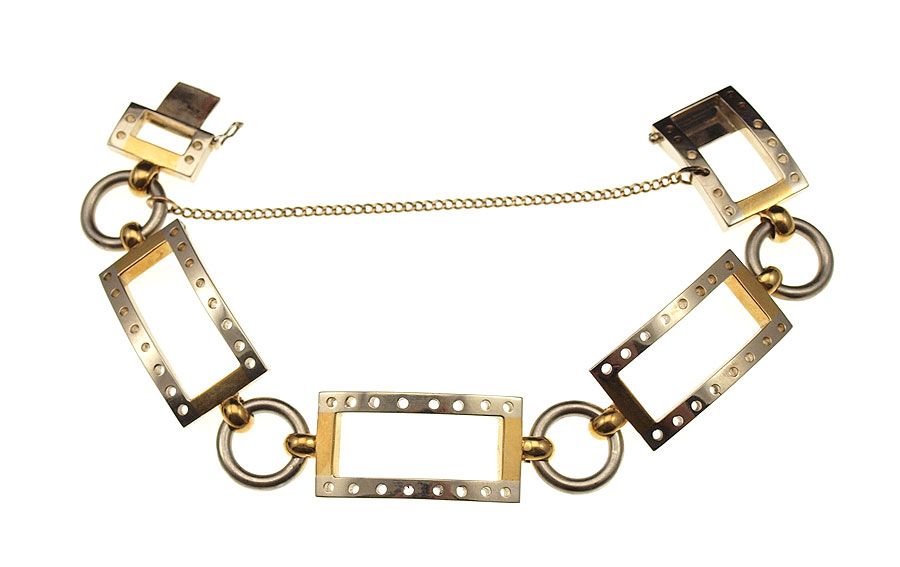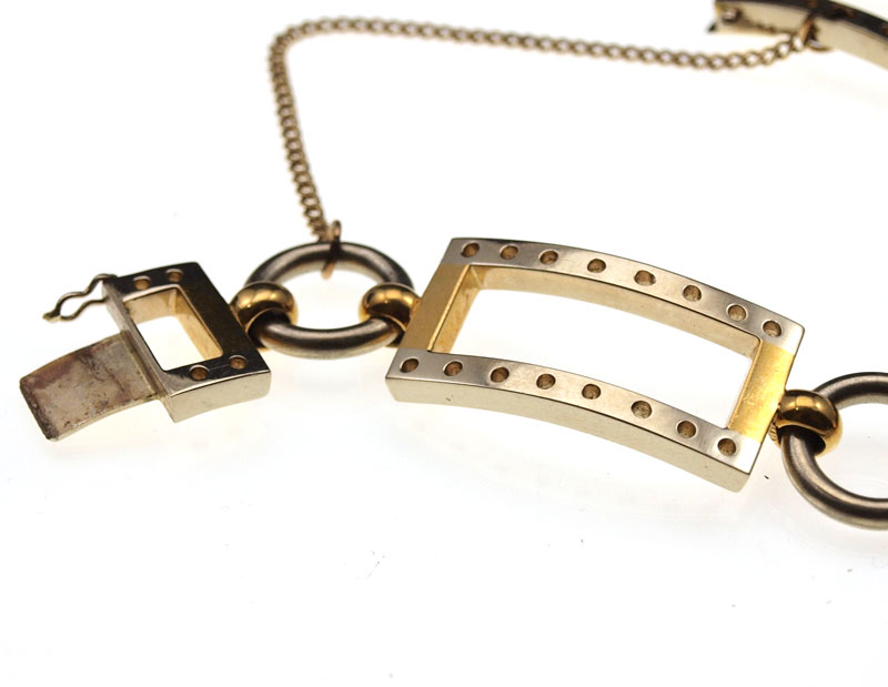 18K TWO TONE GOLD BLANK BRACELET: 18K yellow and white gold blank bracelet alternating rectangle and circle links. Drilled seats for addition of gemstones, or wear as is. Safety chain Length: 8'' Weight: 64.0 grams.