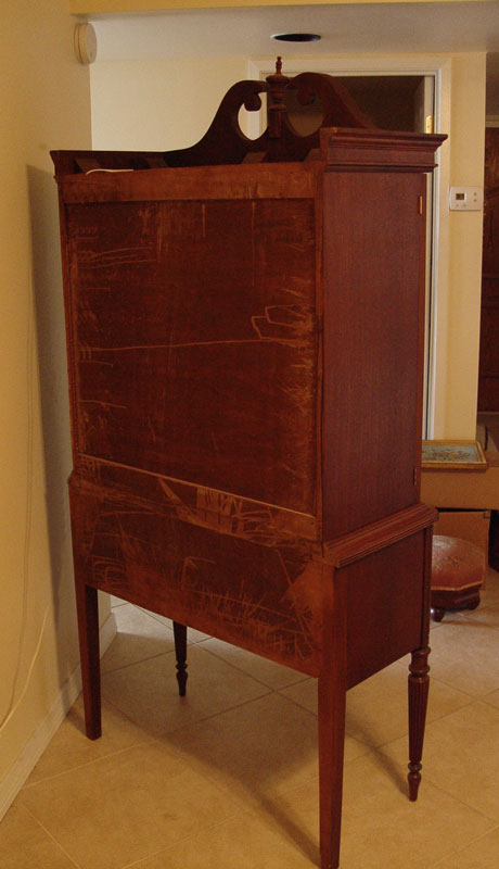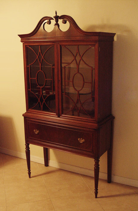 MAHOGANY CHINA CABINET: Broken arch pediment over 2 glass doors with 2 glass shelves. Single drawer base with fluted front legs. 72 1/2'' h. x 37 1/2'' x 16''. Matches previous lot 242.
