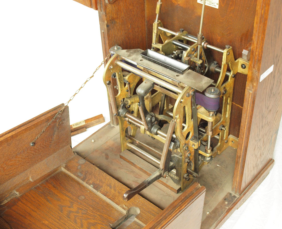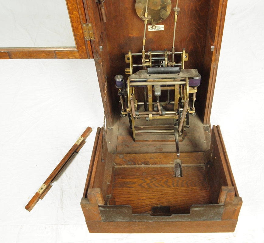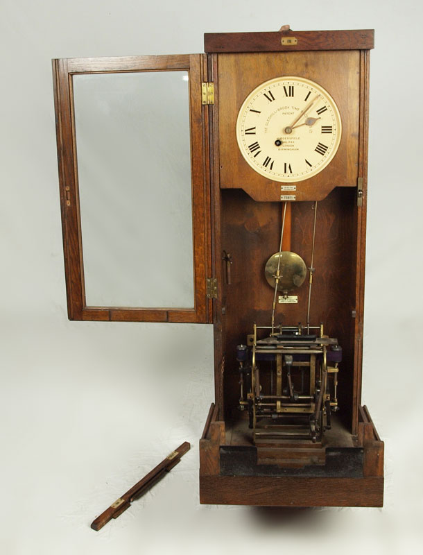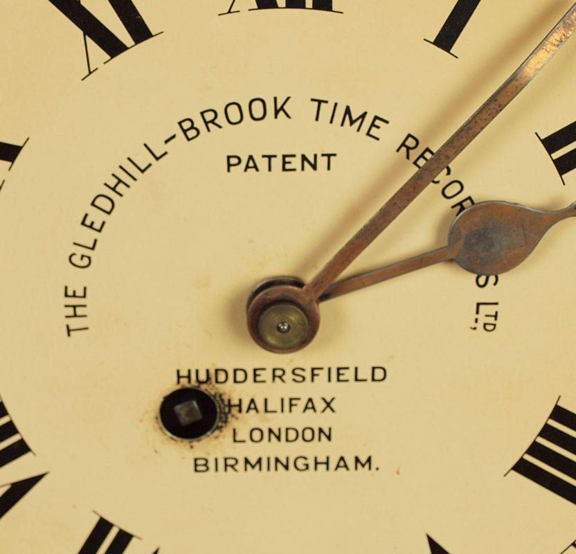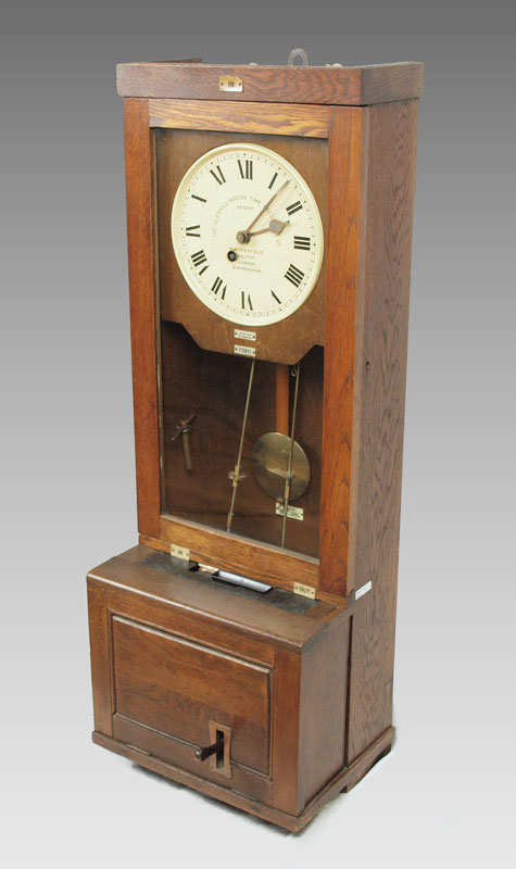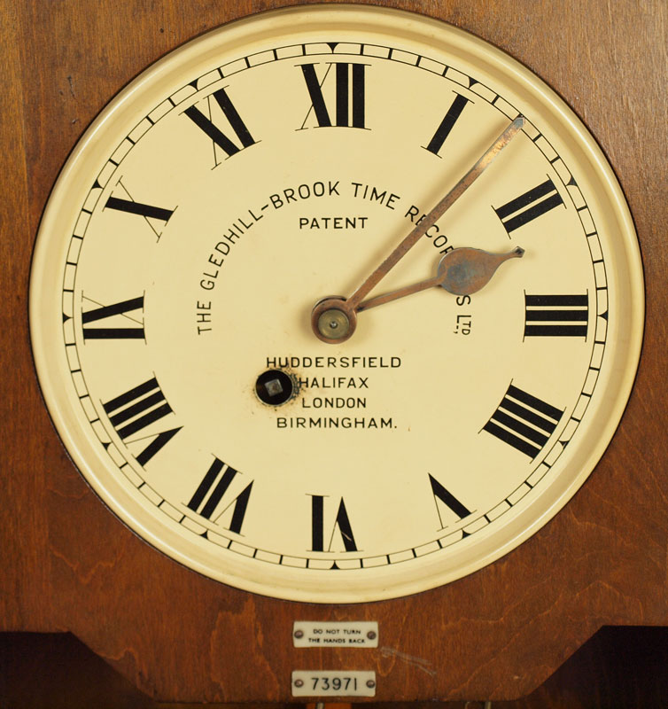 ENGLISH TIME RECORDER CLOCK: Glendhill-Brook Time Recorders Ltd. oak case time recorder / regulator clock. Serial number 73971. Metal face with time movement, appears to be complete with recorder stamp. Key and pendulum in case. 53'' h. x 15 1/2'' x 14 1/2''.