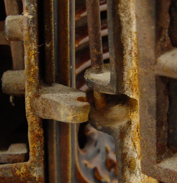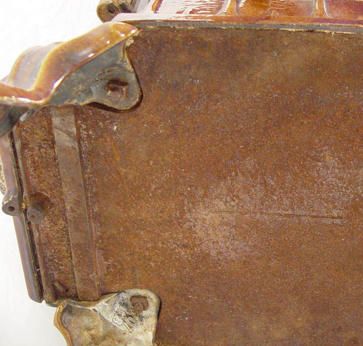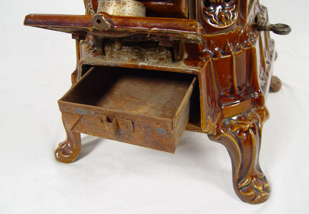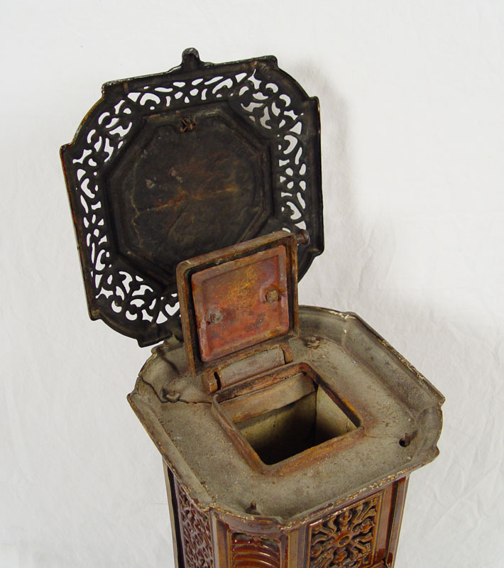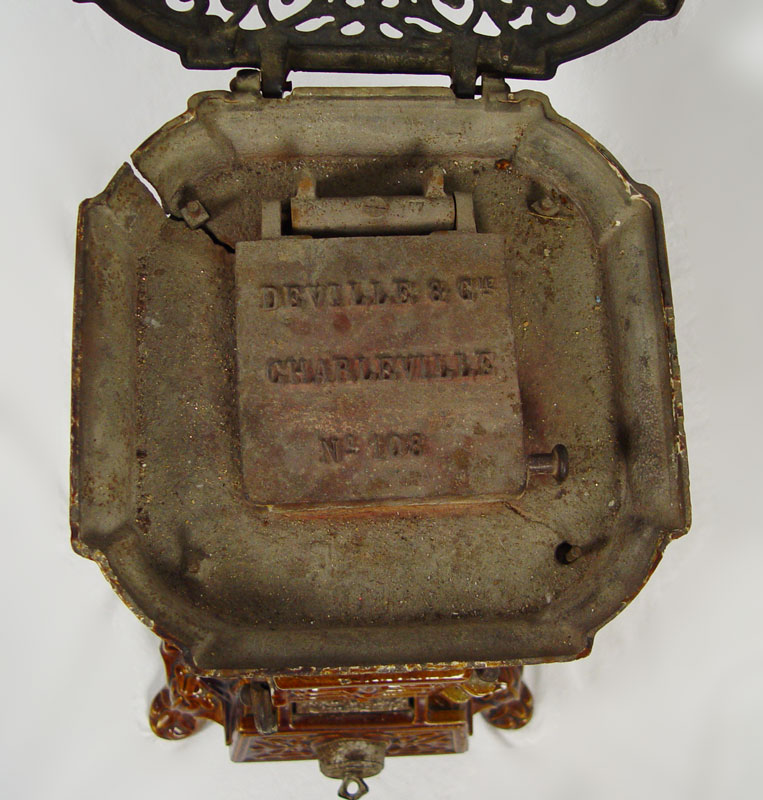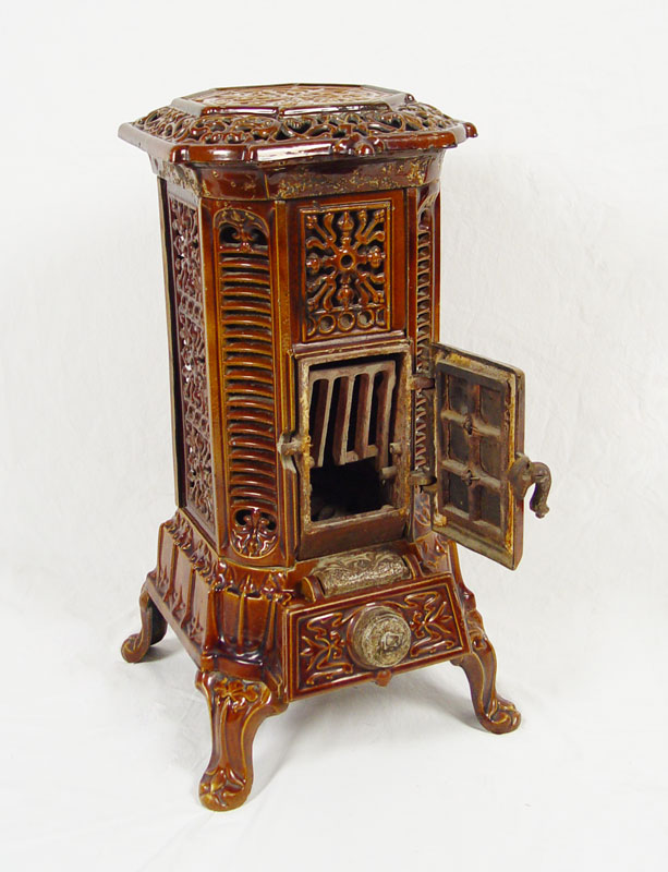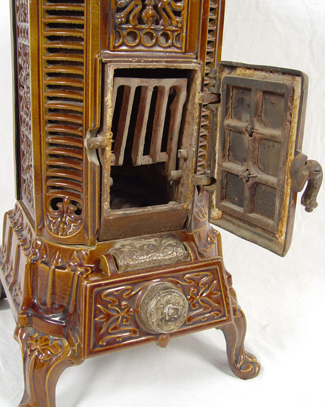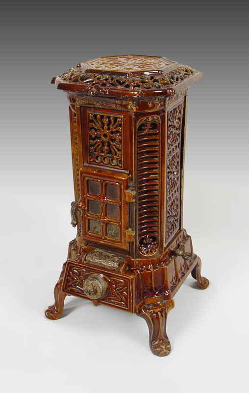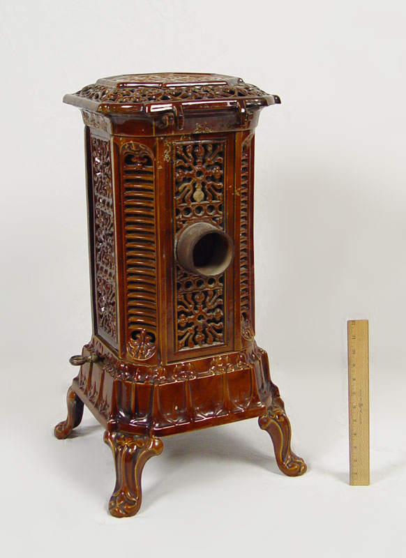 EARLY 1900'S FRENCH STOVE BY DEVILLE & CO: Brown glaze ceramic exterior. Marked Deville & Cie. Charlesville, No. 108. 27 1/2'' h. x 14 1/2''.