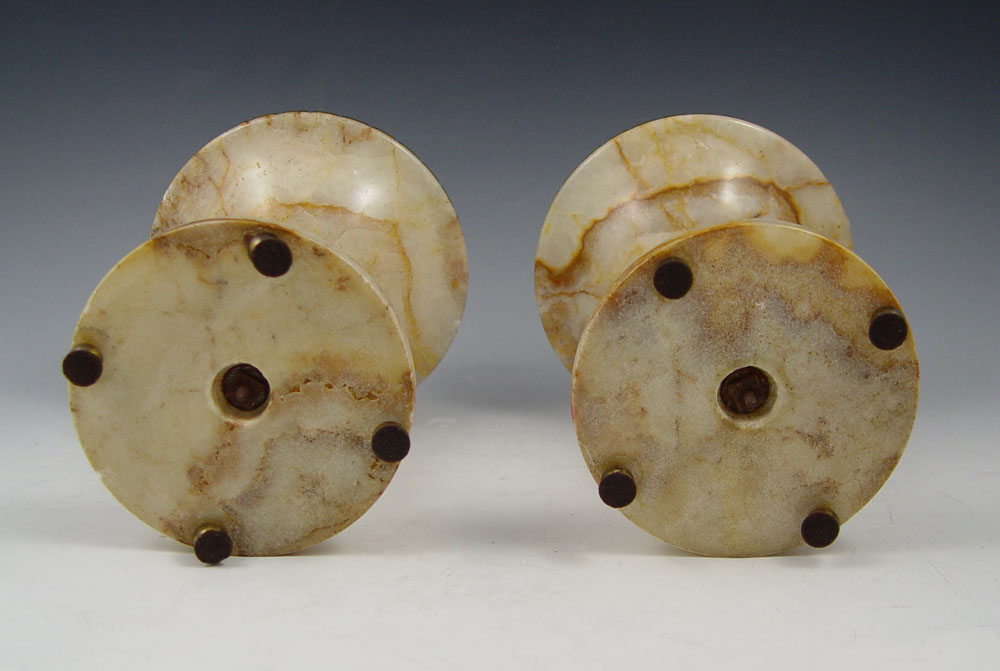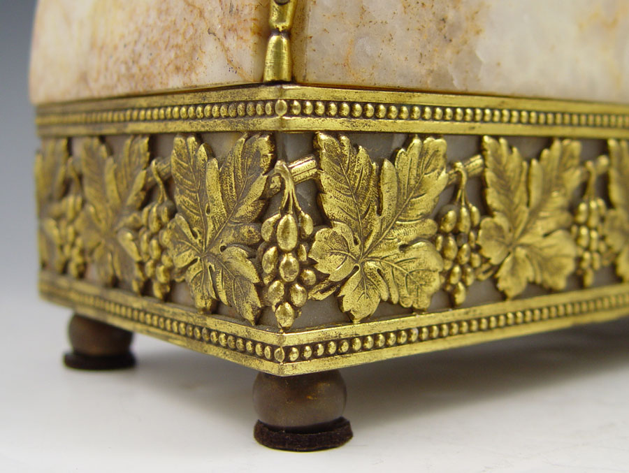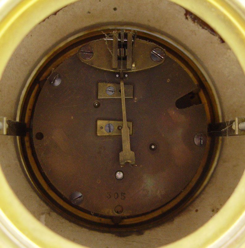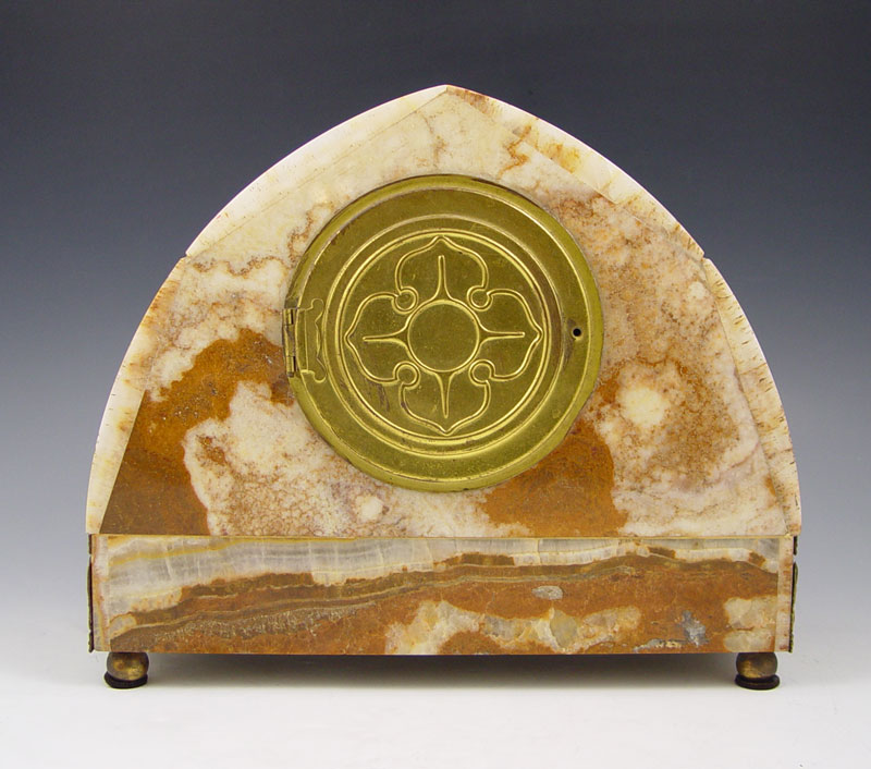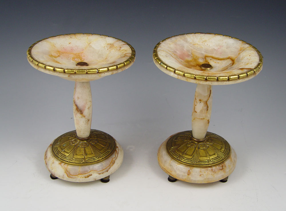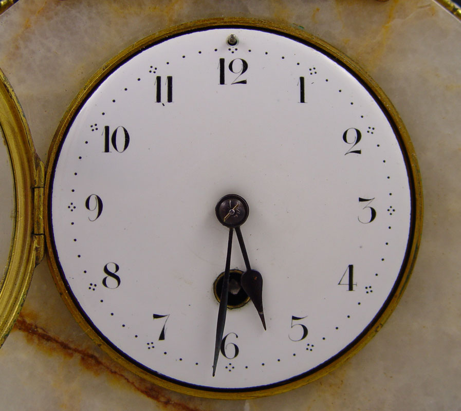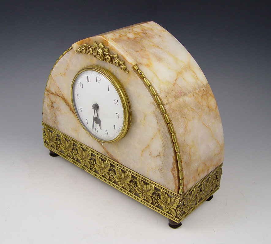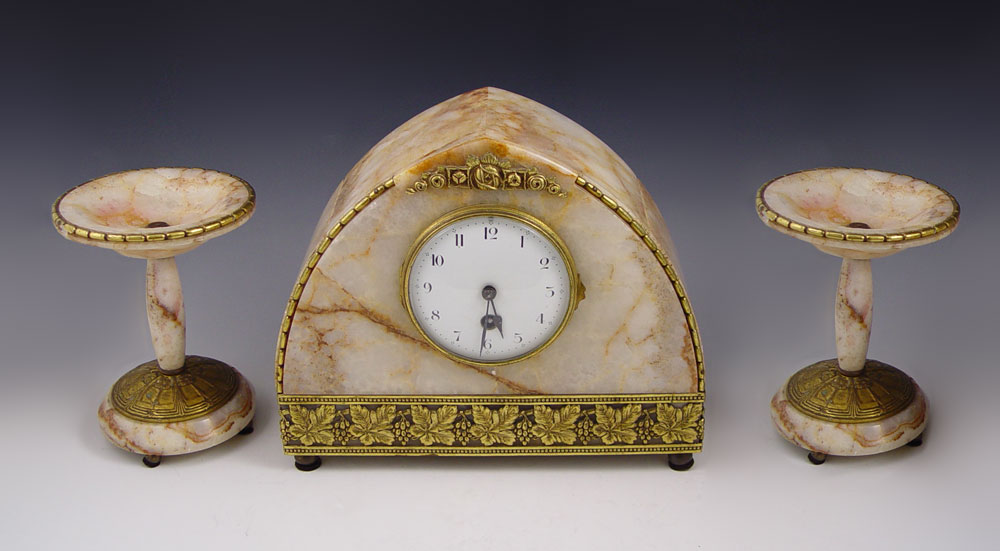 DECO MARBLE & ORMOLU CLOCK GARNITURE SET: Marble case with floral ormolu accents. Enamel face with Arabic, unmarked time only movement. 9 3/4'' h. x 11 1/2'' x 3 3/8''. No key / pendulum. Sold with pair of matching compote garniture, 7 1/4'' x 5 5/8''.