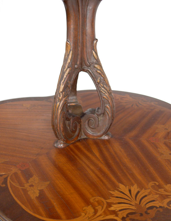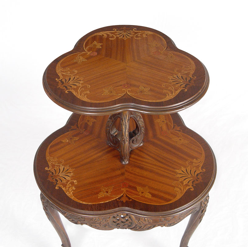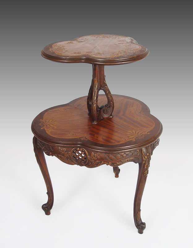 FRENCH STYLE TWO TIER MARQUETRY INLAY SIDE TABLE: Match book veneer tops with marquetry inlay. Pierced and carved apron on the lower tier. Approx. 31 1/2'' tall, lower tier 21'' dia.