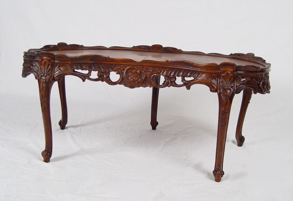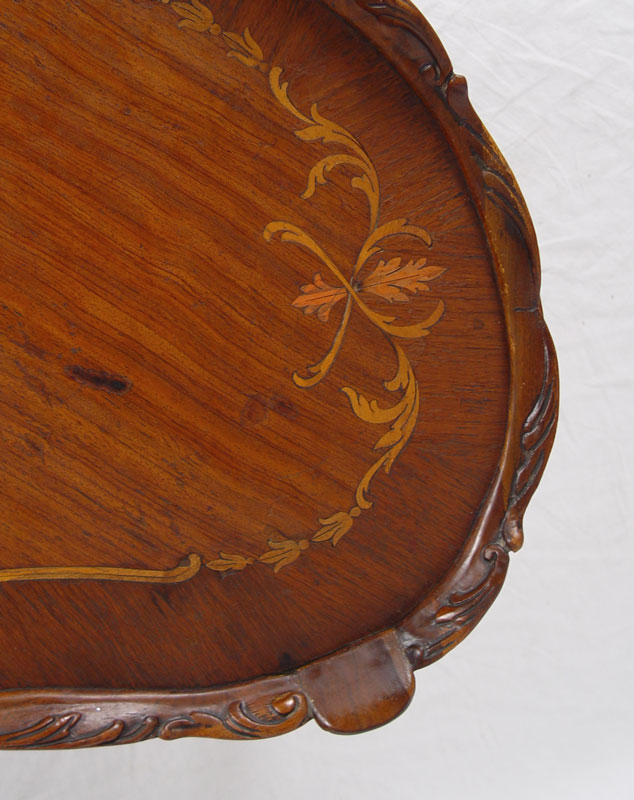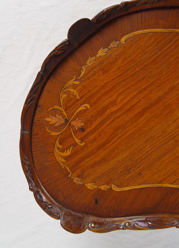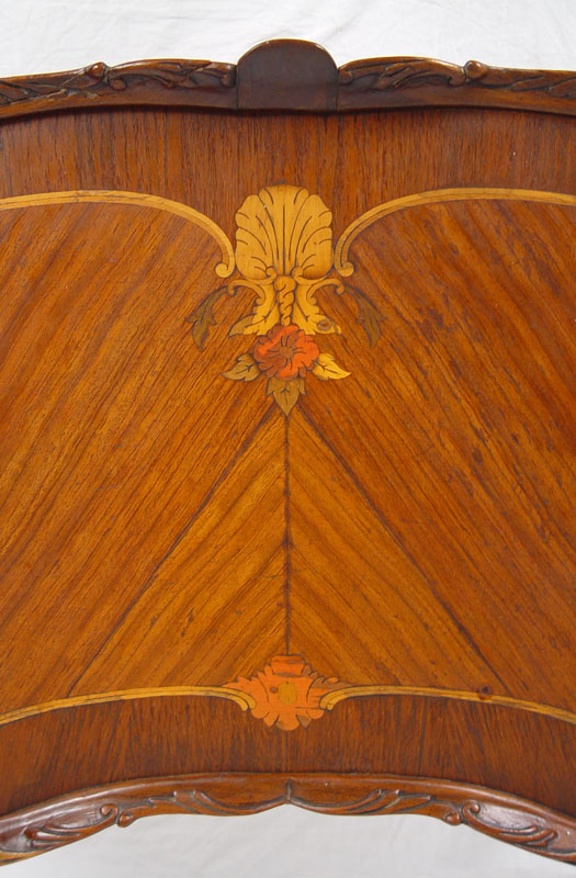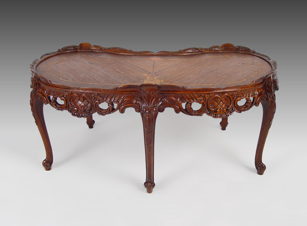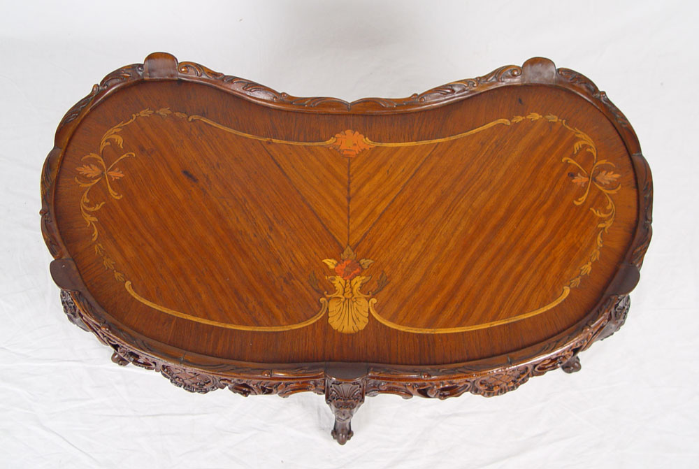 KIDNEY SHAPED INLAID WALNUT COFFEE TABLE: Bell flower and floral design to inlay on top, carved and open cut apron and legs with French feet, 17''h. x 38'' x 22''.
