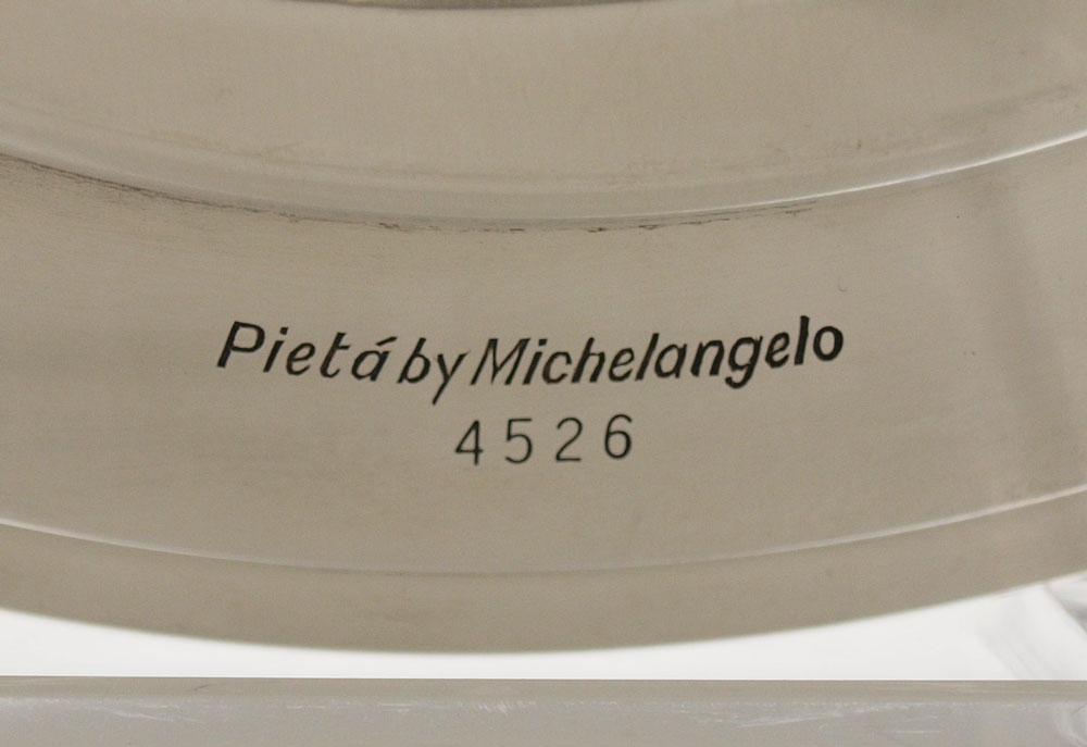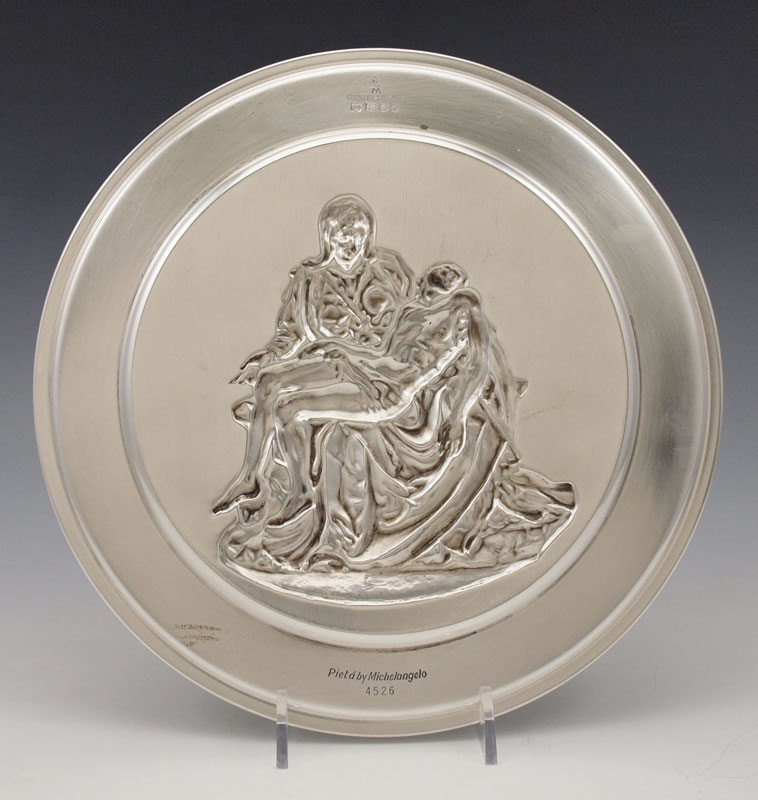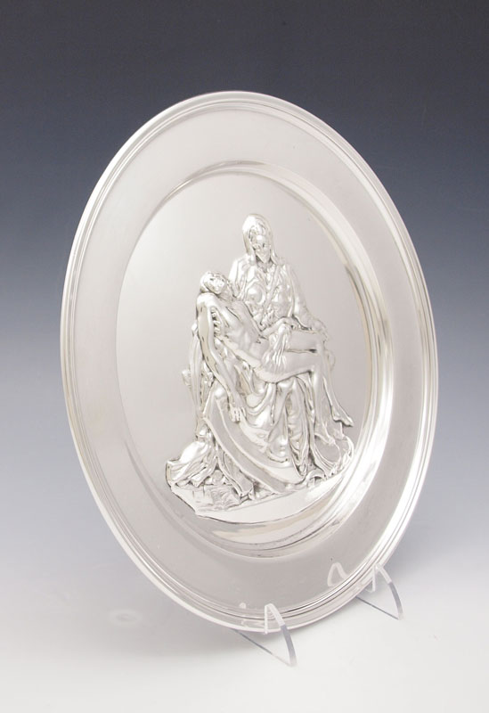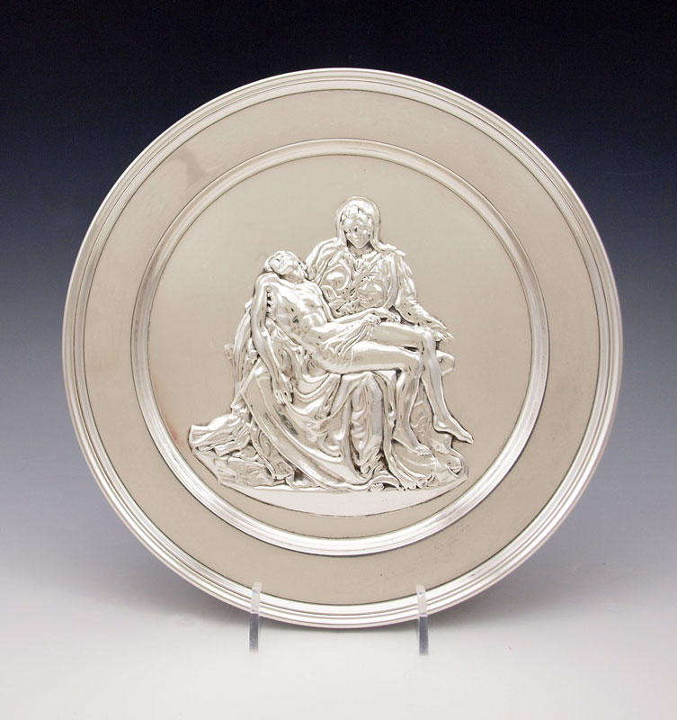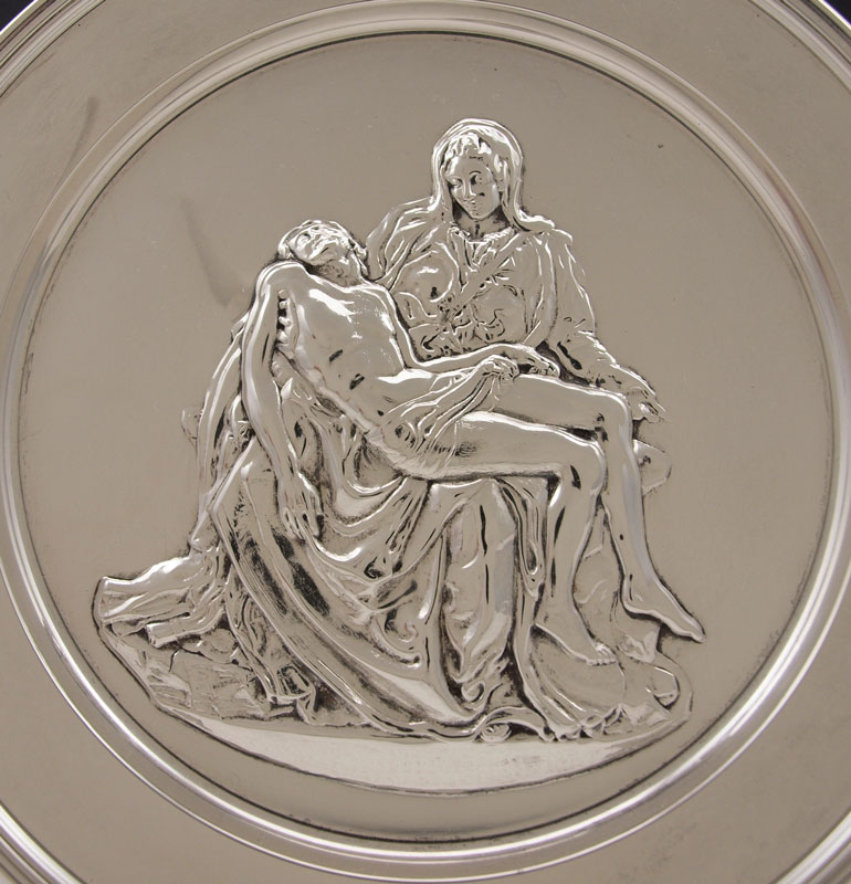 RICHARD COMYNS MICHELANGELO PIATA ENGLISH SILVER CHARGER: Hallmarked 1973 London by Richard Comyns and titled Pieta by Michelangelo. 9'' dia.. Approx. 12.1 troy oz.