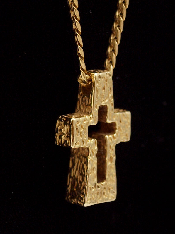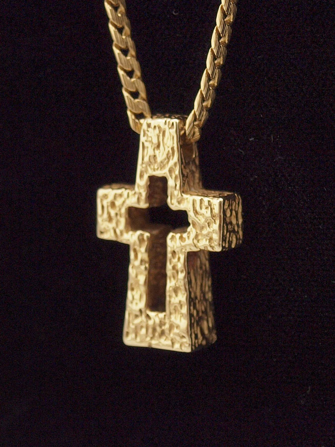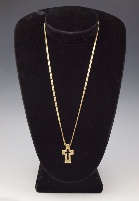 14K CROSS AND CHAIN: 14K yellow gold cross pendant and 20'' flat textured Cuban chain. Weight: 18.1 grams.