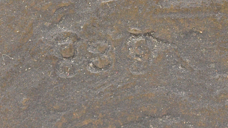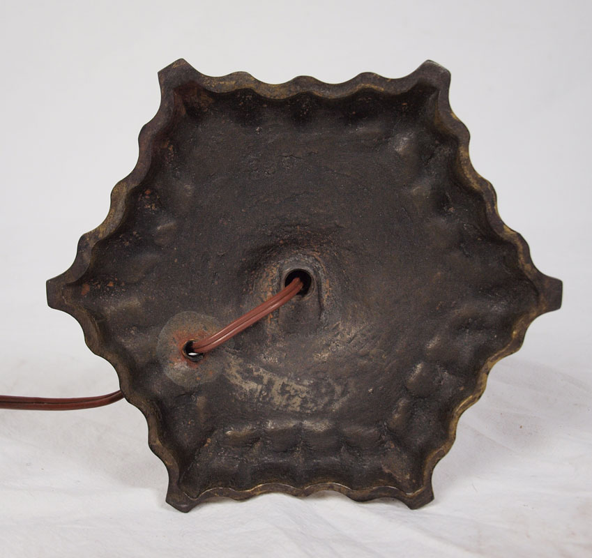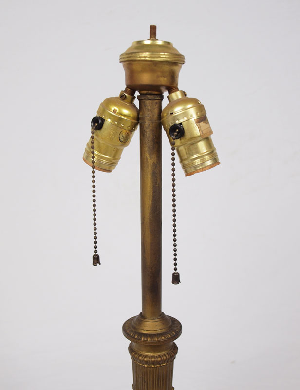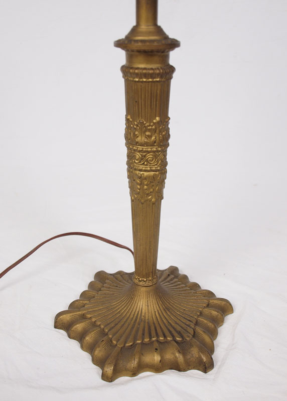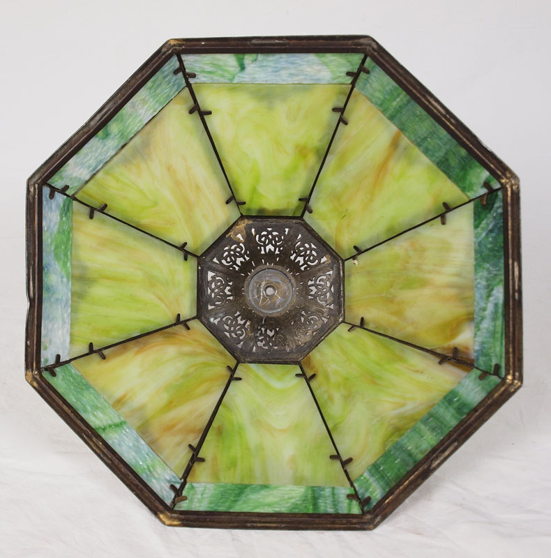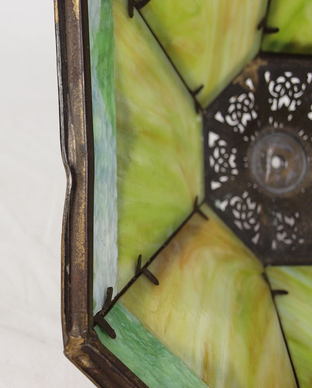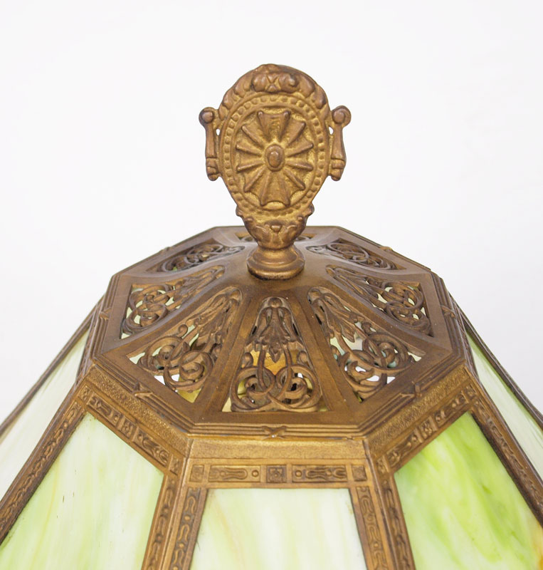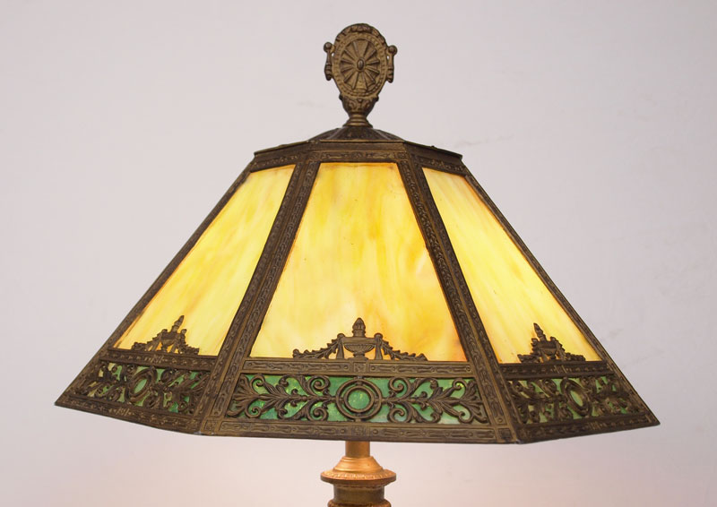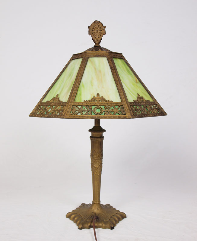 VINTAGE 8 PANEL SLAG GLASS TABLE LAMP: Heavy bronze base with reed and acanthus leaf design, stylized filigree bellflower motif to shade, two pull chain sockets, overall approx. 26 1/2''h., six sided base approx. 9''dia., shade approx. 9''h. x 17 1/4''dia.