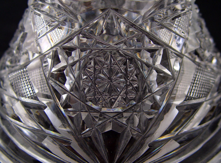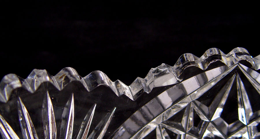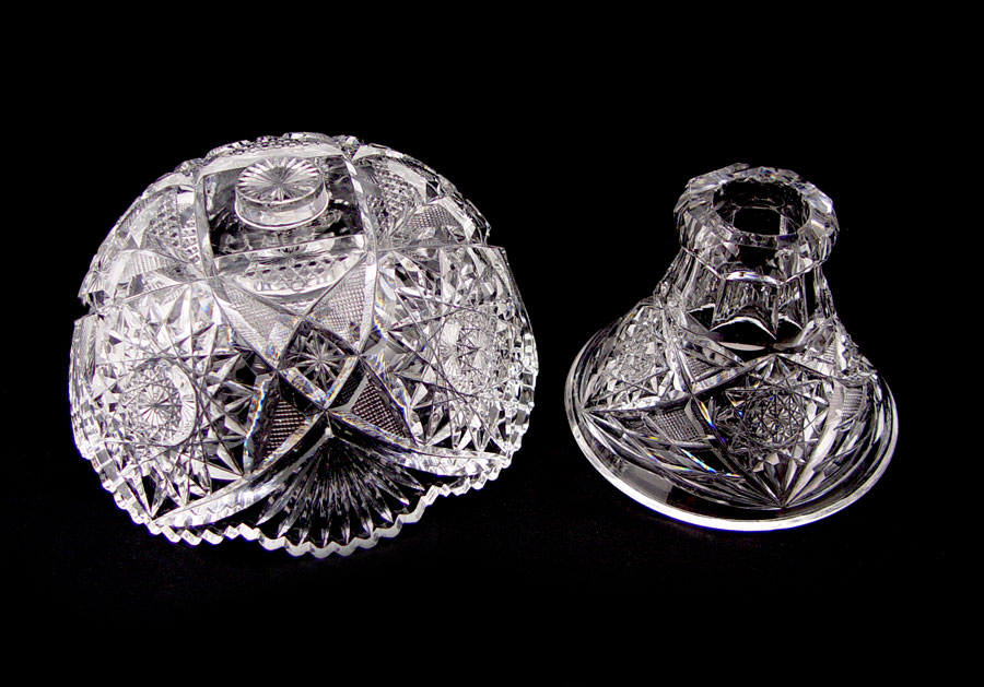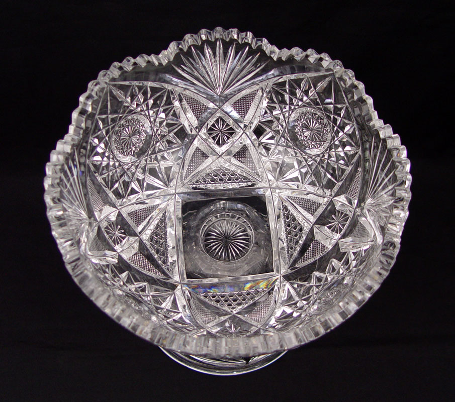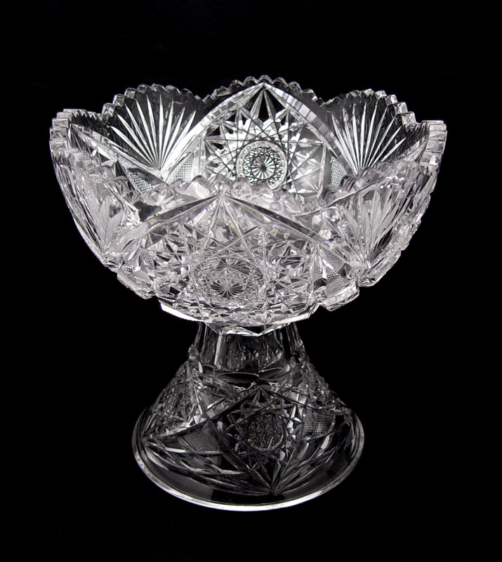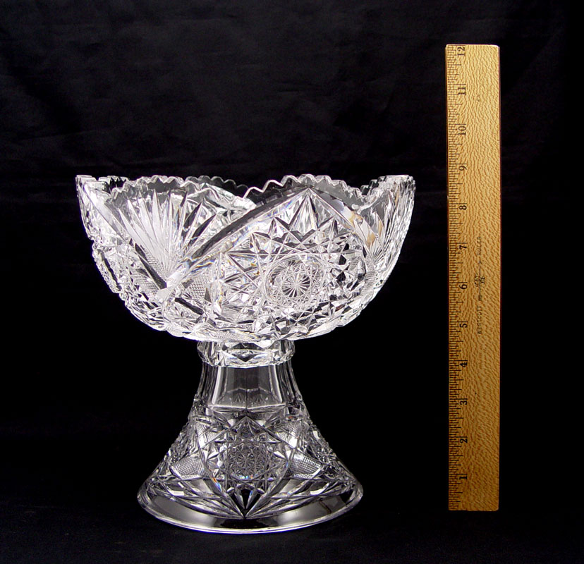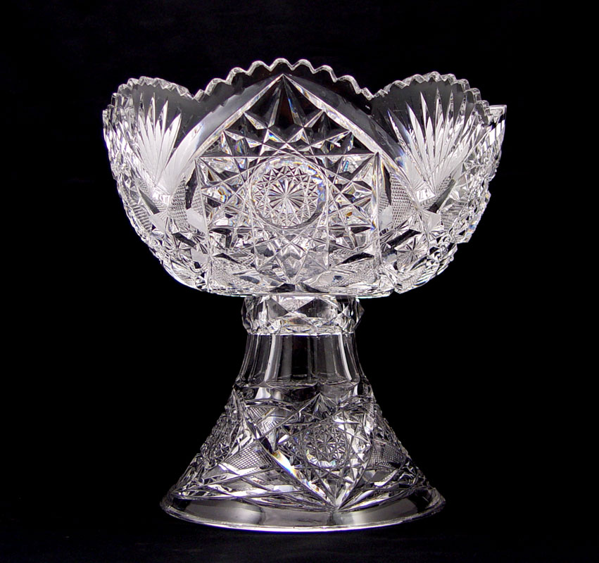 CUT GLASS EGGNOG BOWL ON STAND: Separates into 2 pieces, overall 9'' h. x 9'' dia.