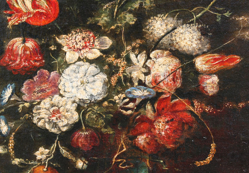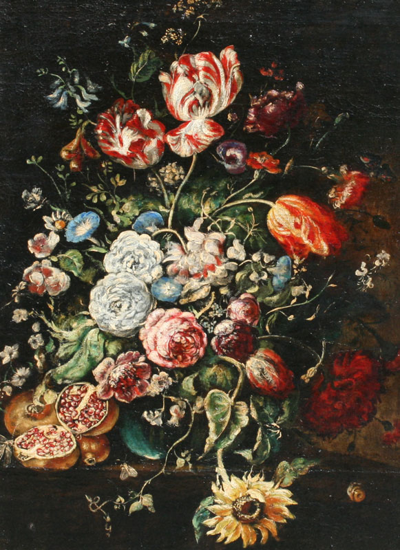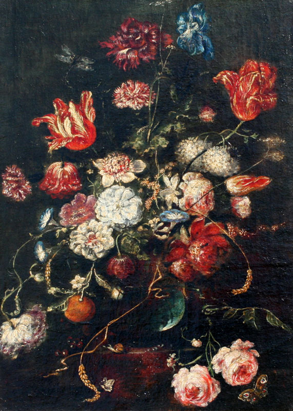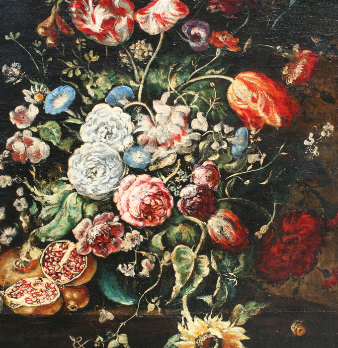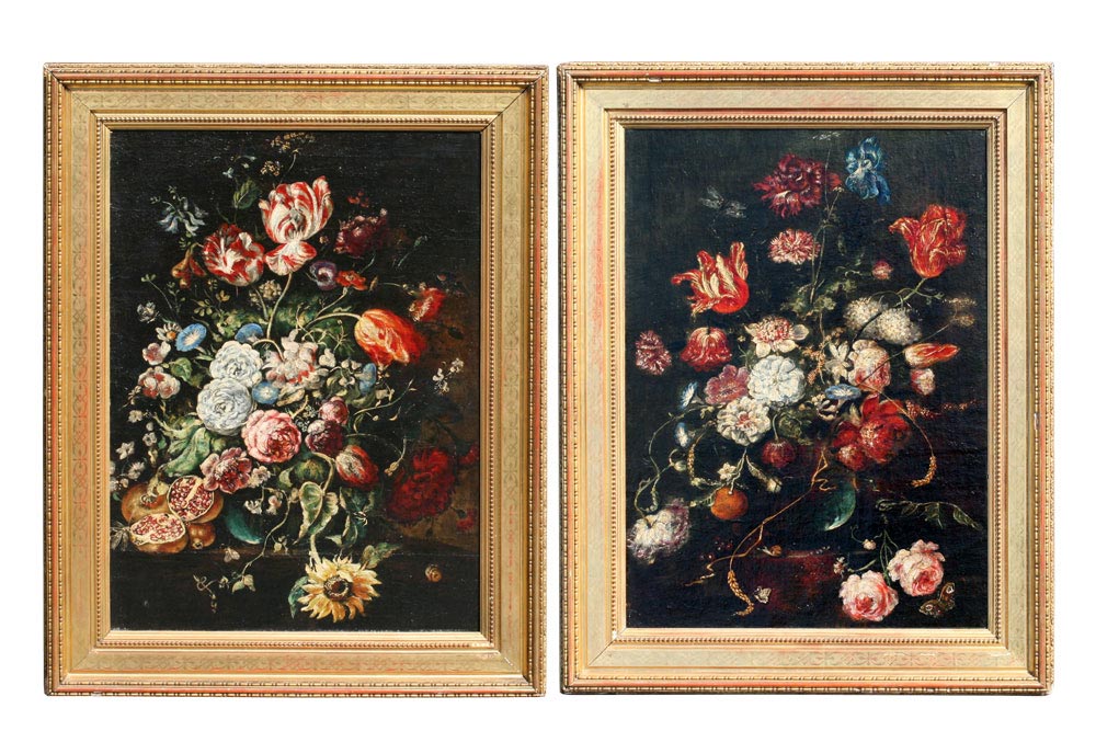 PAIR OF 18TH C? NEOCLASSICAL STYLE FLORAL STILL LIFE OILS ON CANVAS: Age unknown, possibly 18th - 19th C, 26'' x 19'', matching gilded frames from the 19th C, 31 1/2'' x 24 1/2''.