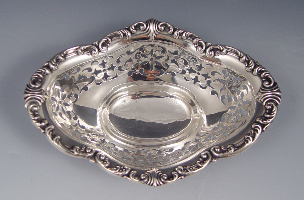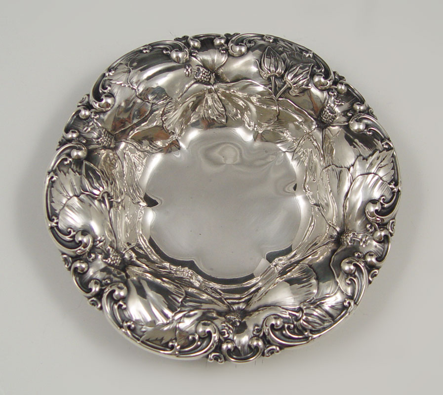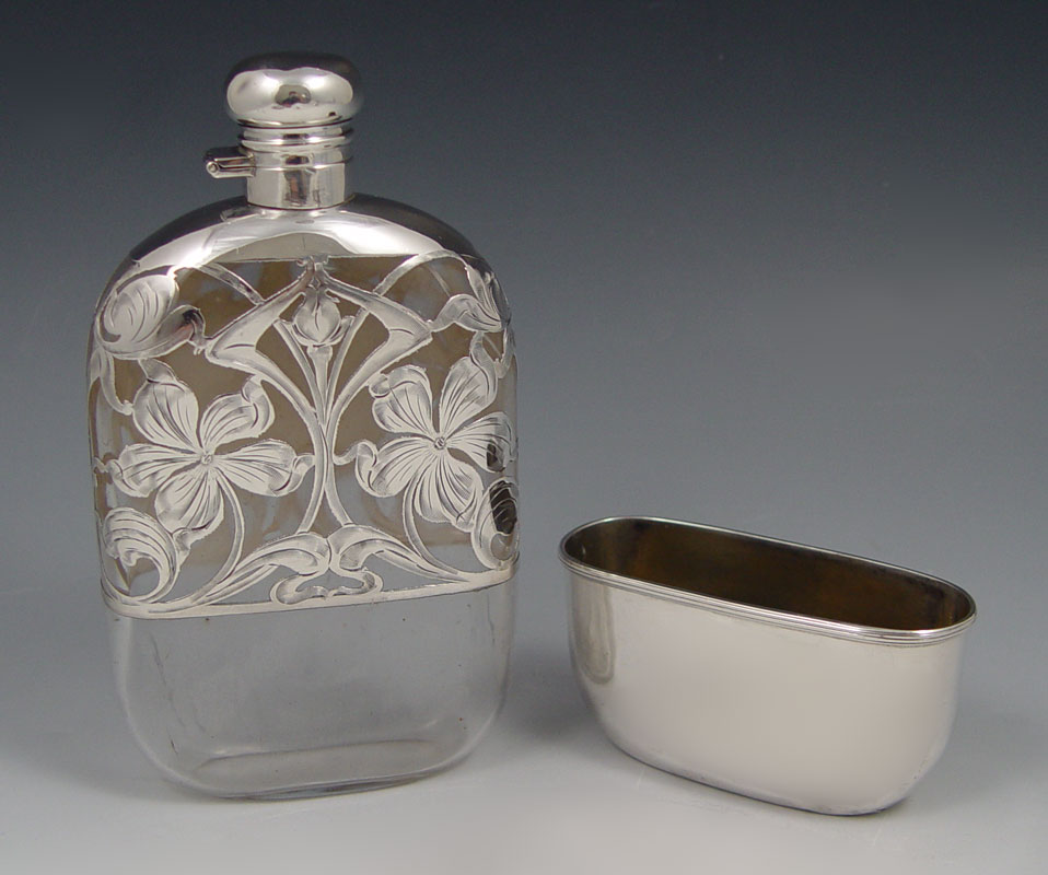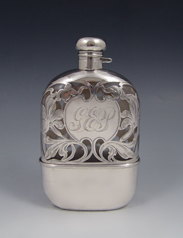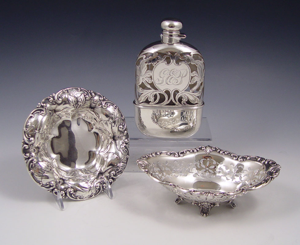 STERLING OVERLAY FLASK & 2 STERLING TRAYS: To include 1) Sterling overlay flask with flora decoration. Unknown makers hallmark on removable cup bottom. Monogrammed GEP. 6 1/2'' h. x 3 3/4''. 2) Gorham reticulated nut dish / candy tray on 4 scroll feet. 2 1/2'' h. x 7'' x 4 7/8''. 3) Whiting art nouveau repousse bowl / tray in a floral design. 1 1/4'' h. x 5 3/4''. Approx. 6.6 troy oz
