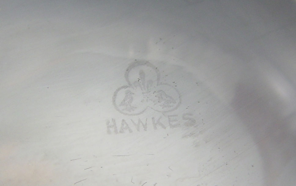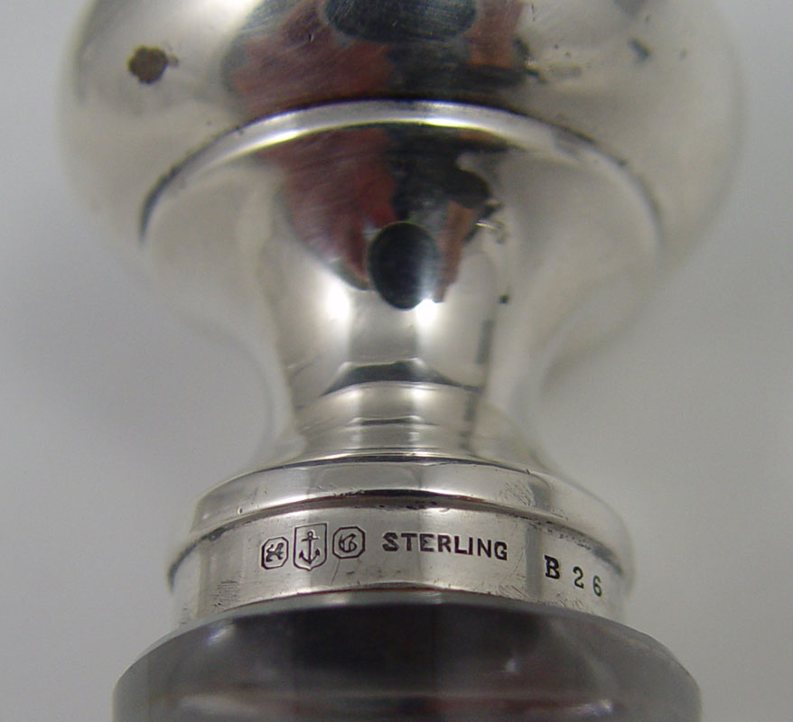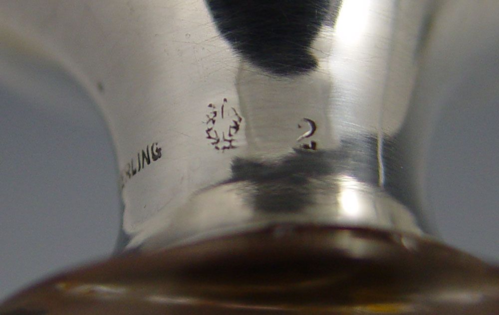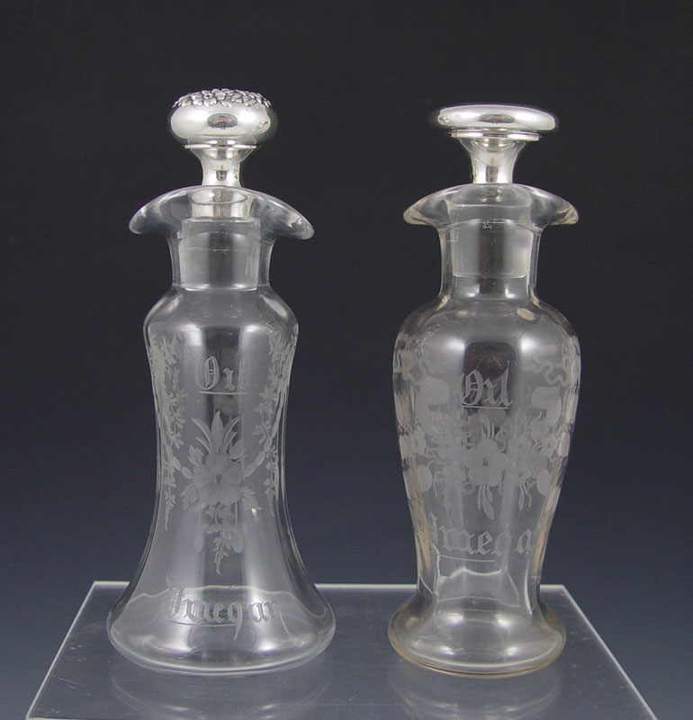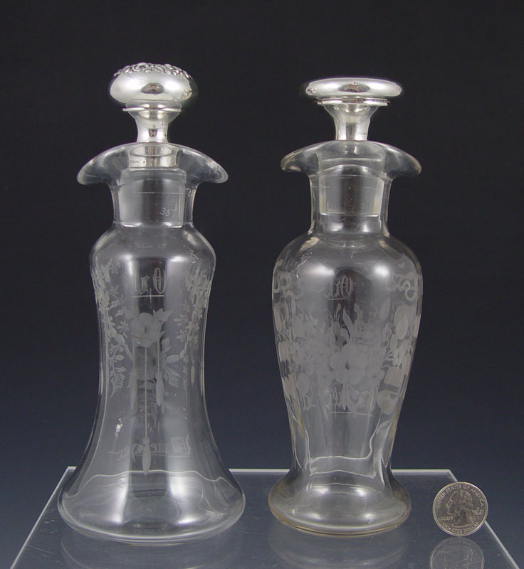 2 PIECE STERLING MOUNTED HAWKES CRUETS: Both pieces marked Hawkes to include 1) Bell shape with floral engraved, Gorham sterling repousse mounted stopper. Neck engraved 35, stopper 36. 8'' h. x 3 3/8''. 2) Baluster form with floral engraved, unknown sterling mounted stopper. Neck engraved 26, stopper 35. 7 3/4'' x 2 1/2''.