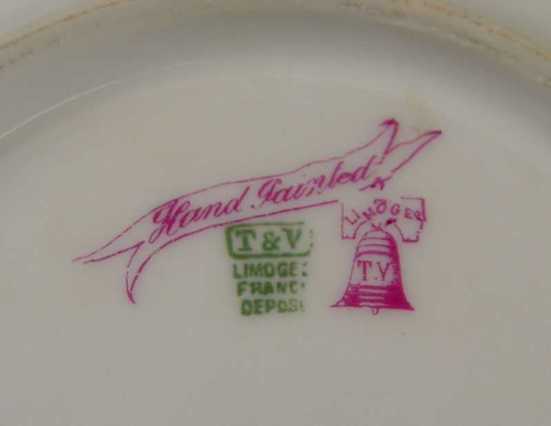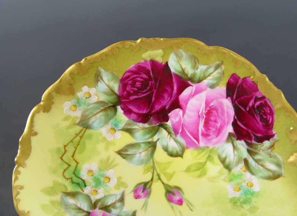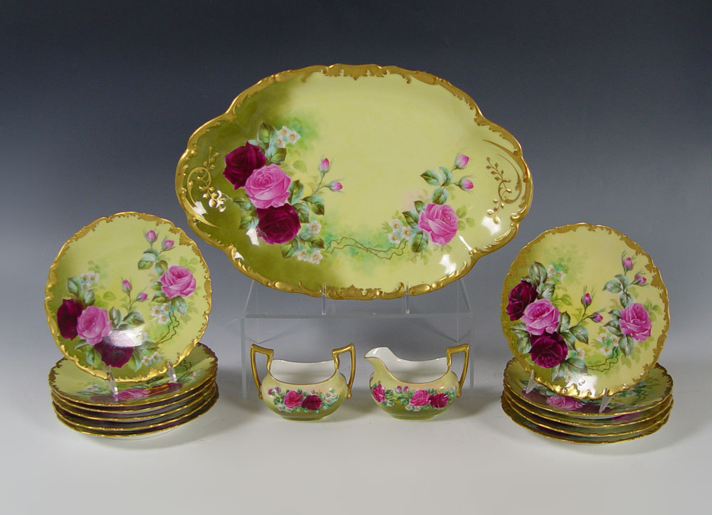 LIMOGES HAND PAINTED CHINA DESSERT SET: Tresseman & Voigt. Ca. 1892-1907. Bold hand painted rose design. 14 pieces to include the 15'' platter, cream pitcher, sugar, and 11 plates, 7 1/4'' dia.